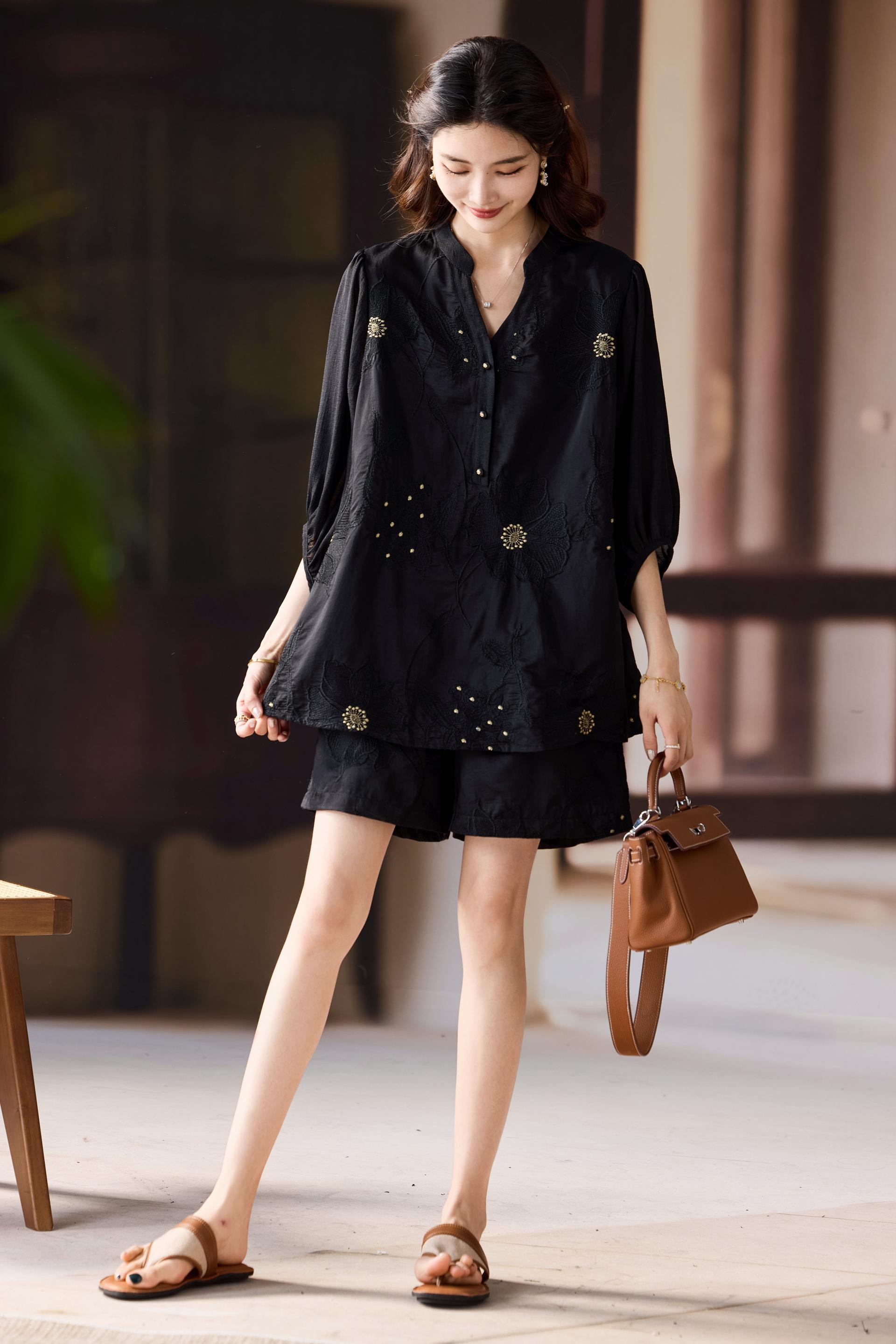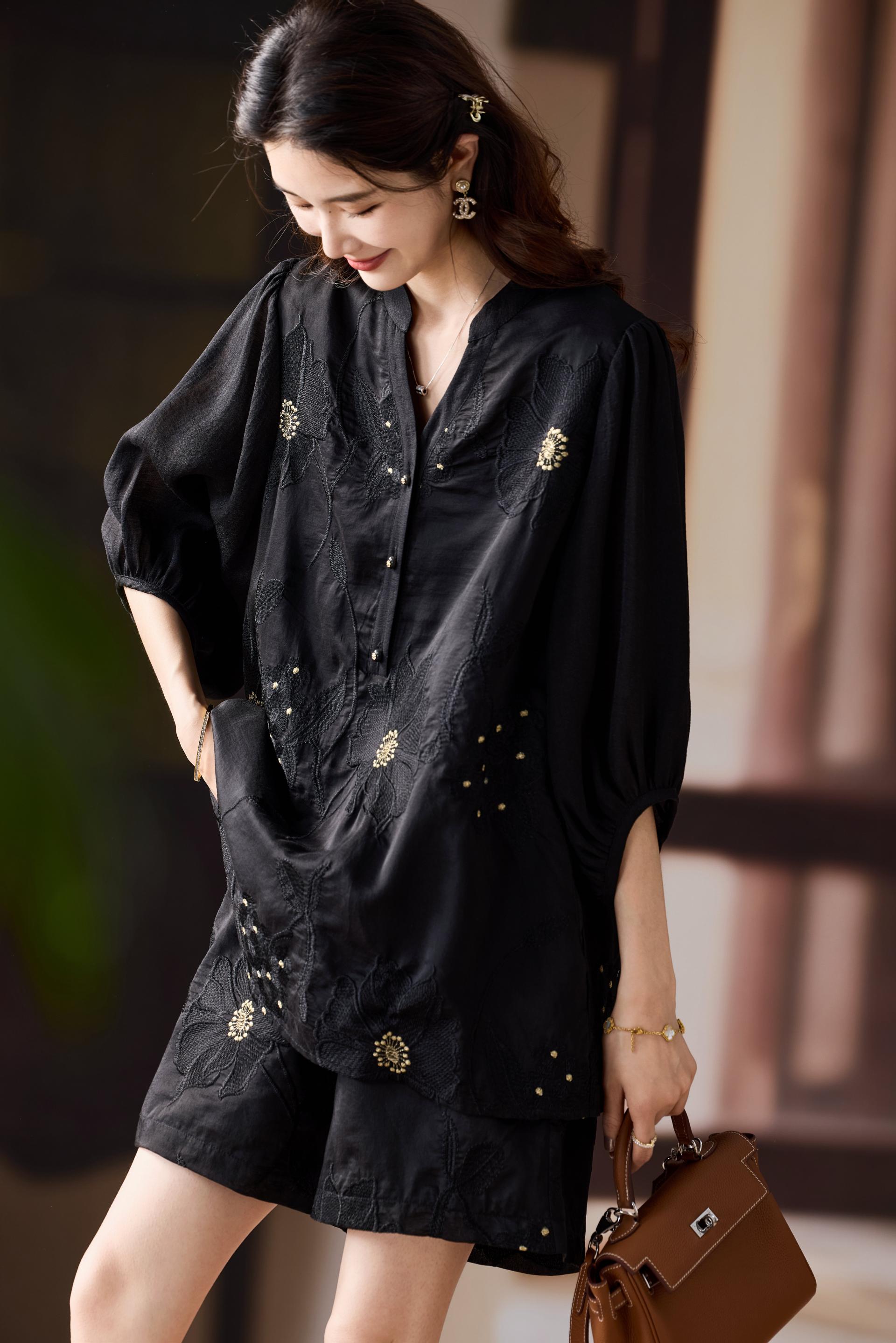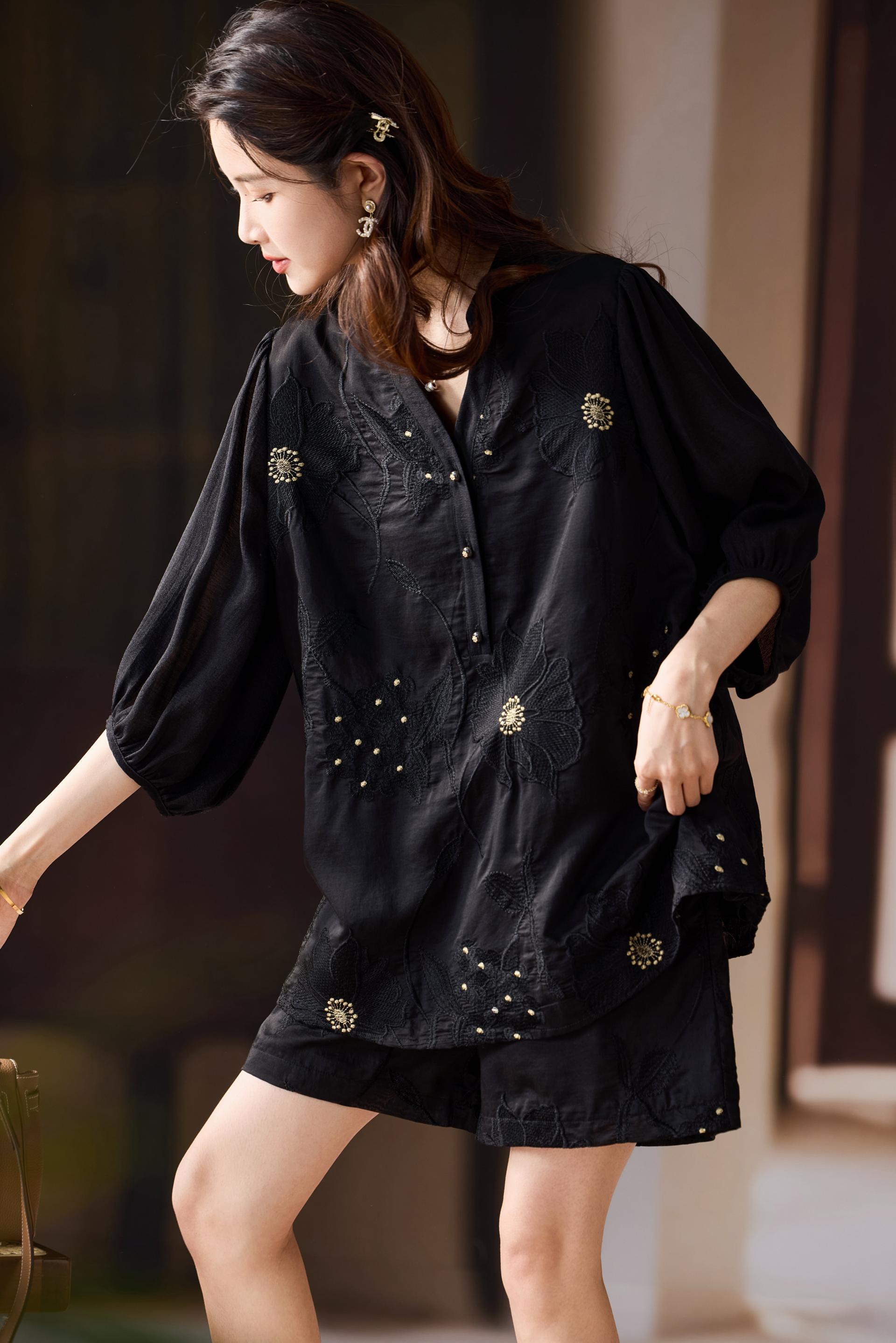 Shadowed Blossom · Celestial Craft Collection finds its elegant balance between refinement and ease. It is our firm belief that clothing is more than mere fabric; it is a silent expression of the wearer's inner world and attitude towards life. From the delicate touch of the material to the clean lines of the silhouette, every detail embodies our deep understanding of the contemporary woman's spirit—one that is both gracefully serene and effortlessly confident. Our continuous exploration in materials, craftsmanship, and design is dedicated to presenting a piece that truly resonates with the heart. We hope it becomes an indispensable and cherished favorite in your wardrobe. The Shadowed Blossom · Celestial Craft Collection draws its inspiration from the classical poetic verse in China: "Sparse shadows stretch askew over clear, shallow water; a subtle fragrance floats in the moonlight dusk." "Shadowed Blossom": Set against a serene, ink-black backdrop, sacred lotus flowers bloom in exquisite heavy embroidery. Though silent, they seem to exude a timeless, elegant fragrance—a reflection of the profound and subtle charm of Eastern femininity. "Celestial Craft": Amidst the pistils and leaves, we have embellished with handcrafted beads, reminiscent of scattered "Xuanji" (celestial) stars in the night sky or the shimmering light on a moonlit pond. As the wearer moves, light and shadow dance and flow, revealing a low-key yet magnificent splendor—a brilliance hidden in the details. The neckline is also ingeniously designed. The grace of a round collar merges with the elegance of a V-neck, subtly elongating the neckline to reveal a charming allure. At the same time, its perfect height acts as a gentle shield in a cool, air-conditioned room, protecting the neck from the chill and striking a perfect balance between style and comfort. Beauty should never come at the expense of comfort. We have selected a high-quality embroidered chiffon fabric with a soft, smooth touch that feels like a second skin. Its unique "four-way stretch" characteristic gives the garment excellent flexibility, allowing the wearer to move with unrestricted freedom. Furthermore, it is wrinkle-resistant, skin-friendly, and breathable, ensuring you maintain an elegant composure.