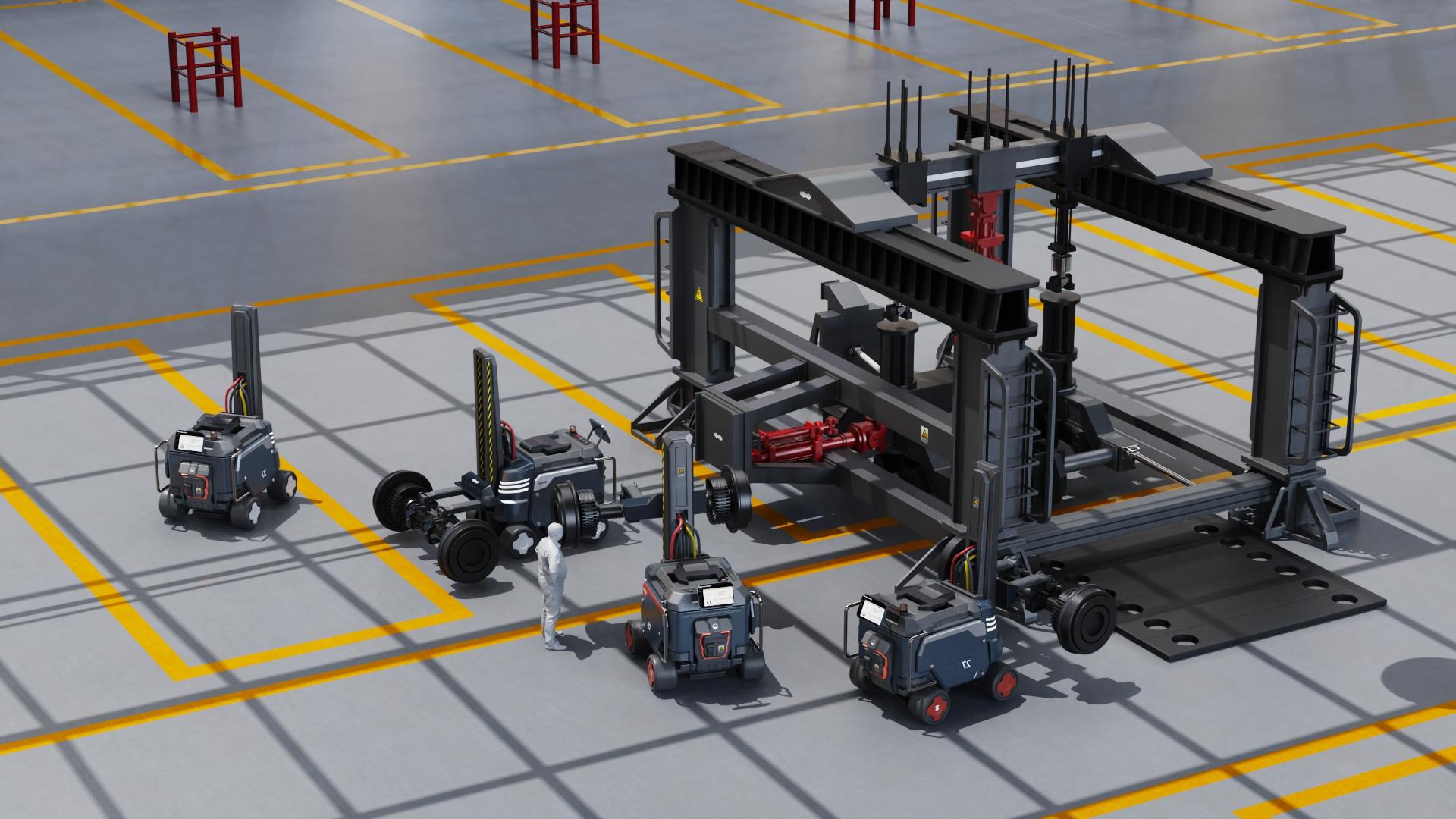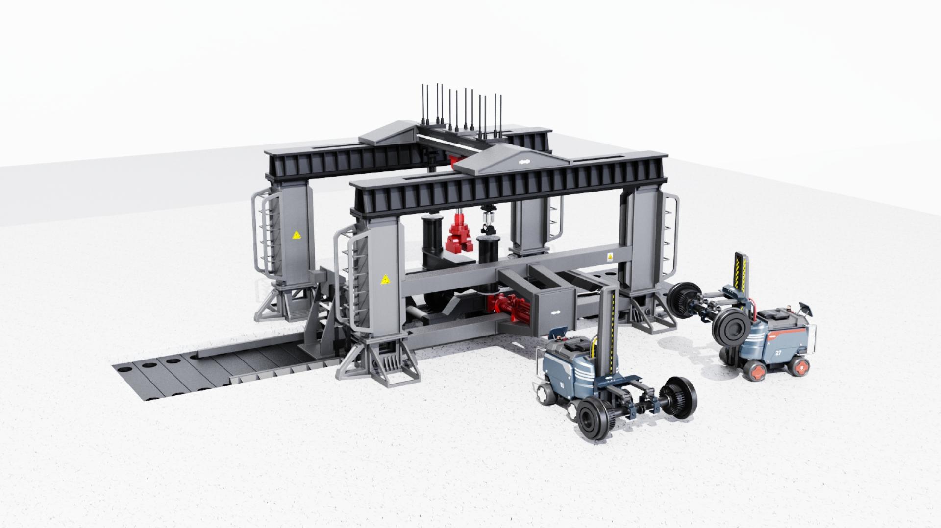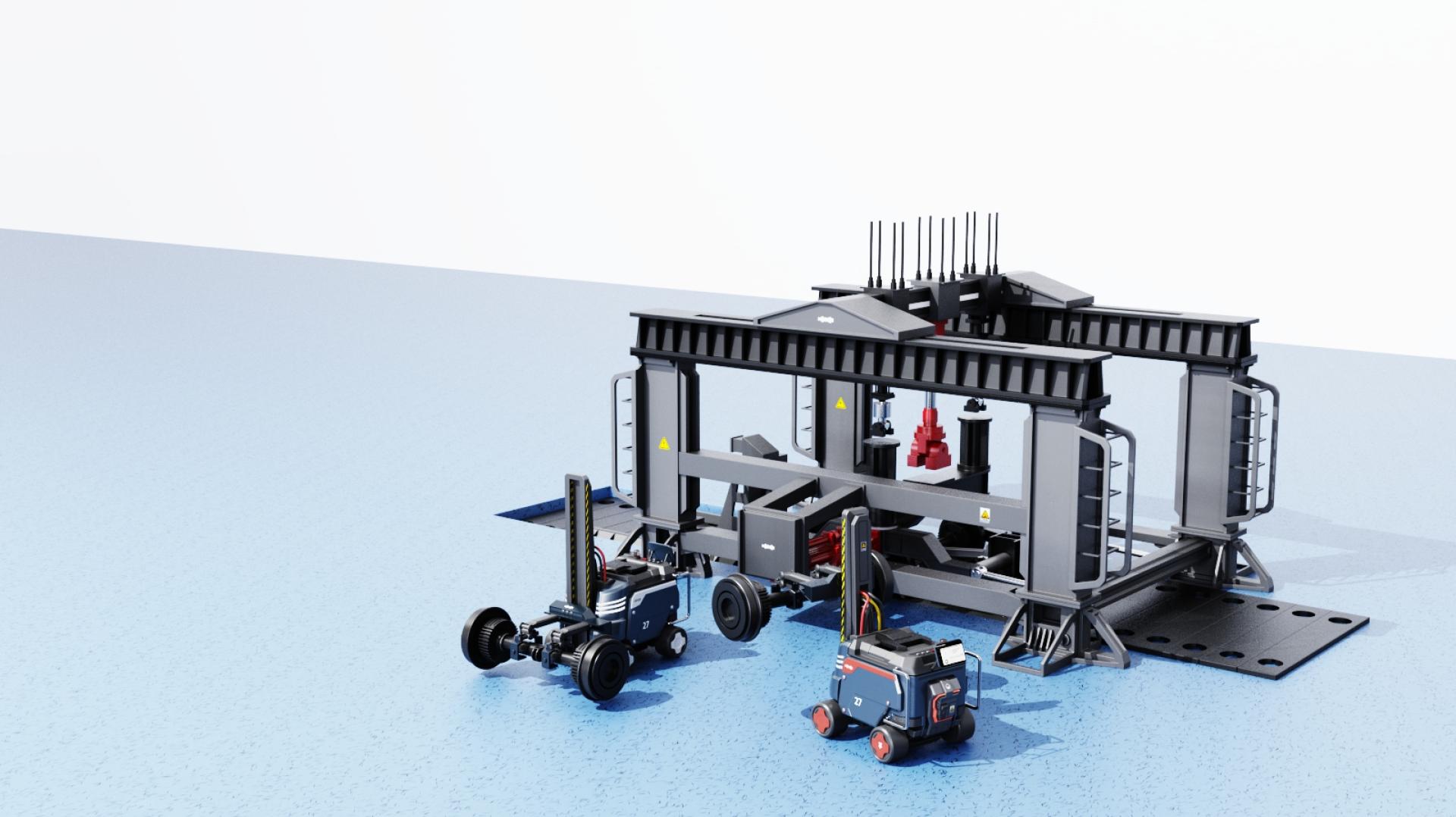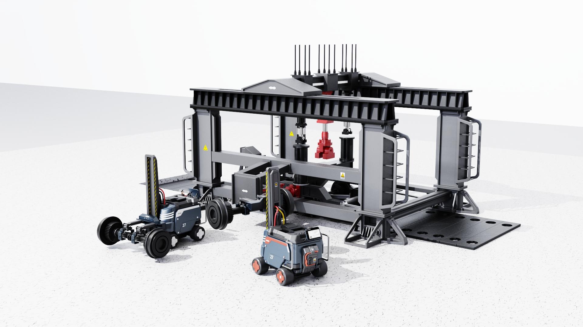 This product design integrates a test bench and an auxiliary handling robot, providing an efficient and precise test system for the wheel-rail operation of bullet trains. The auxiliary material handling robot helps users install and position the wheels on the test platform, reducing the complexity of manual operation and improving work efficiency. The core test bench precisely controls the contact position and creep state through the independent control function of the wheel-rail operation test bench, simulating parameters such as the wheel operation posture and wheel-rail contact pressure at different contact positions. The system can comprehensively test the wheel-rail contact behavior and evolution law, master the combined influence of wheel-rail relative position relationship, contact position, creep state, etc., provide scientific basis and experimental platform for the wheel-rail profile matching design of EMUs, service performance evaluation and evolution law prediction, and help improve the safety and reliability of EMU design.