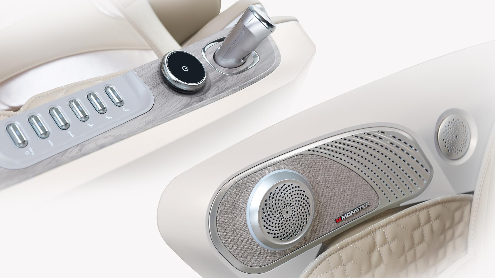 The premium massage chair integrates smart technology with multi-sensory healing, featuring an innovative dual-core "5D upper & 4D lower" mechanism. This delivers synchronized deep-tissue massage and precision percussion for shoulder/neck and waist/leg zones, shattering the limitations of conventional single-path massage. The 130cm LiFlex track dynamically adjusts to body's contours—from the cervical curve to the sacral pressure points—enabling a full 180° recline to decompress the spine and deliver weightless, floating-state rejuvenation. The chair integrates a holistic relaxation ecosystem through multi-system synergy—combining full-body airbag envelopment, lumbar-thermal therapy, motorized calf kneading with adjustable Gua Sha rollers, and Monster-customized audio—to create an immersive five-sensory experience encompassing pneumatic support (airbags), thermo-therapy (heat), kinetic massage (dynamic rollers), sonic immersion (Hi-Fi audio), and olfactory healing (aromatherapy ). This synchronized approach harmonizes physical relaxation with emotional well-being, delivering a profound healing journey from sensory stimulation to profound comfort.
