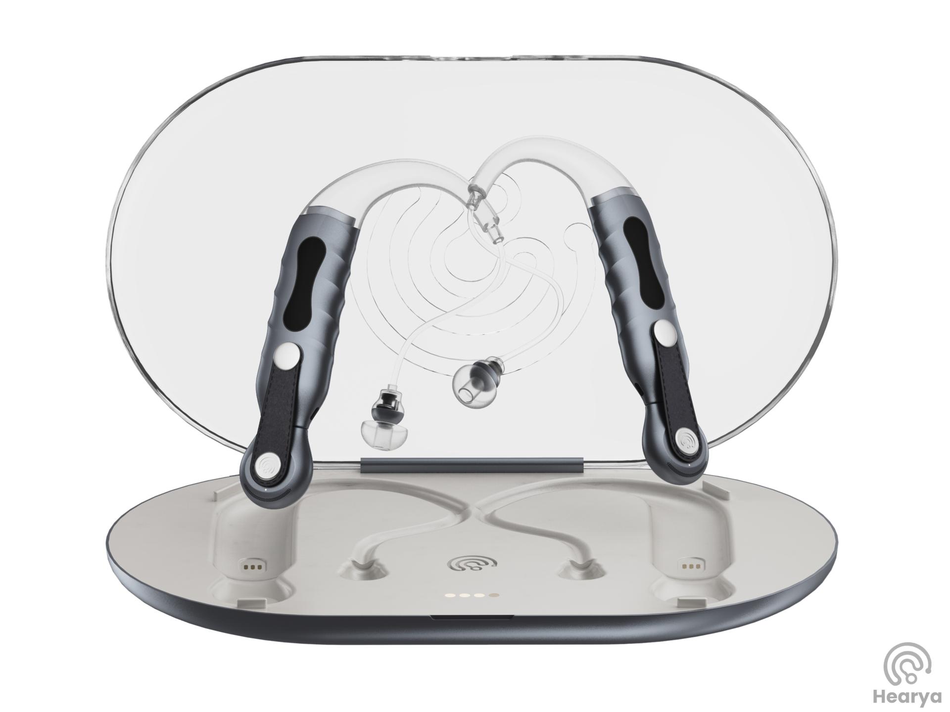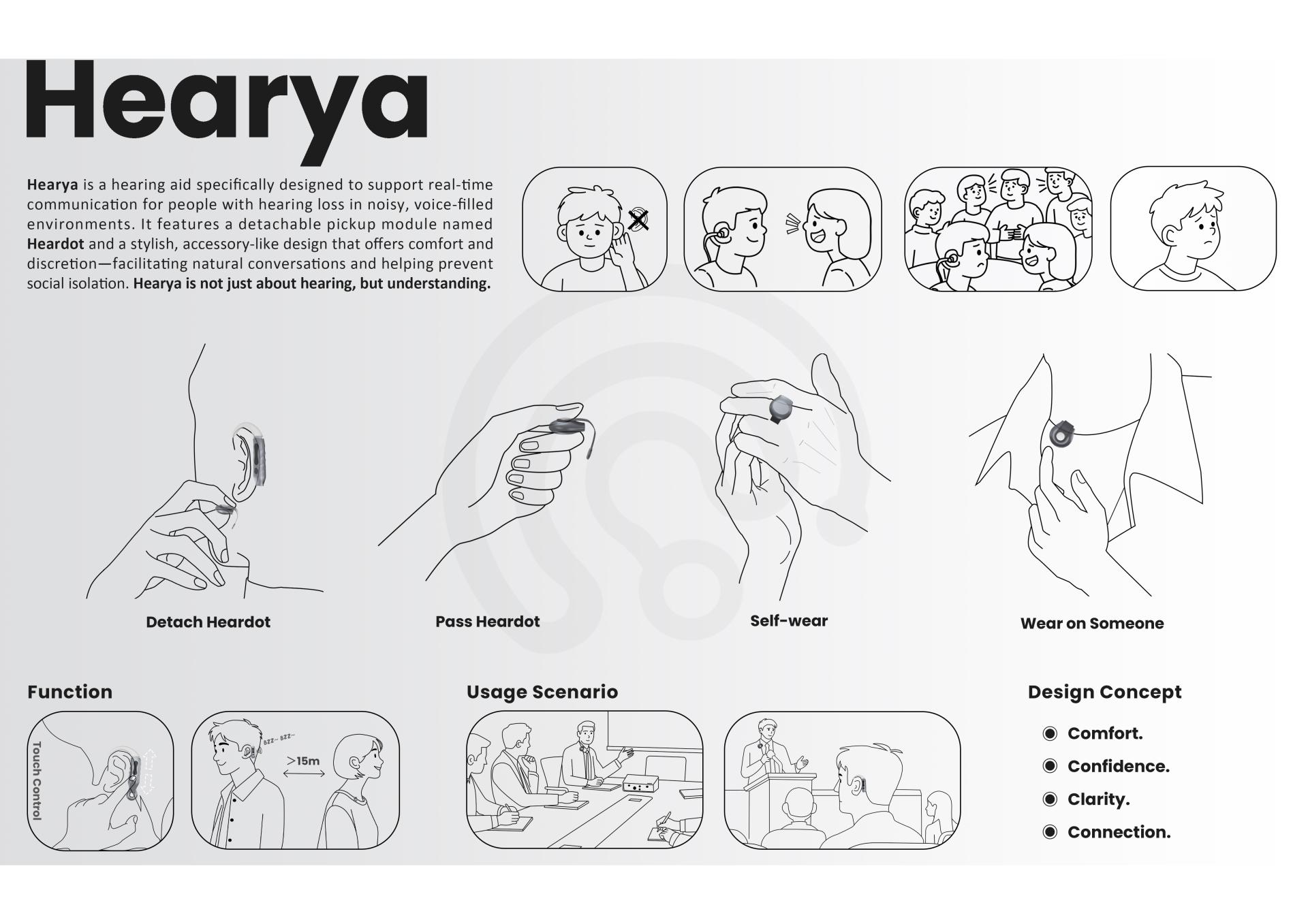 Hearya, derived from the colloquial expression “hear ya”, is a hearing aid designed to listen and understand—bridging communication between individuals. Traditional hearing devices often fall short in noisy, voice-dense environments due to limitations in pickup mechanisms and noise reduction technologies, leading to social isolation and reduced participation for people with hearing loss.