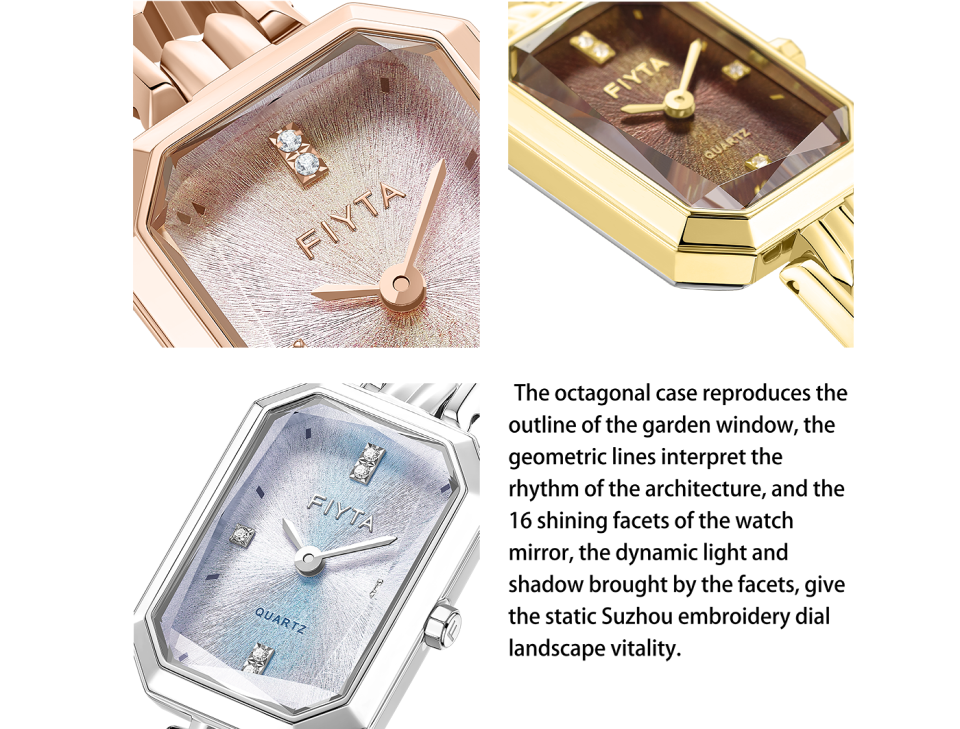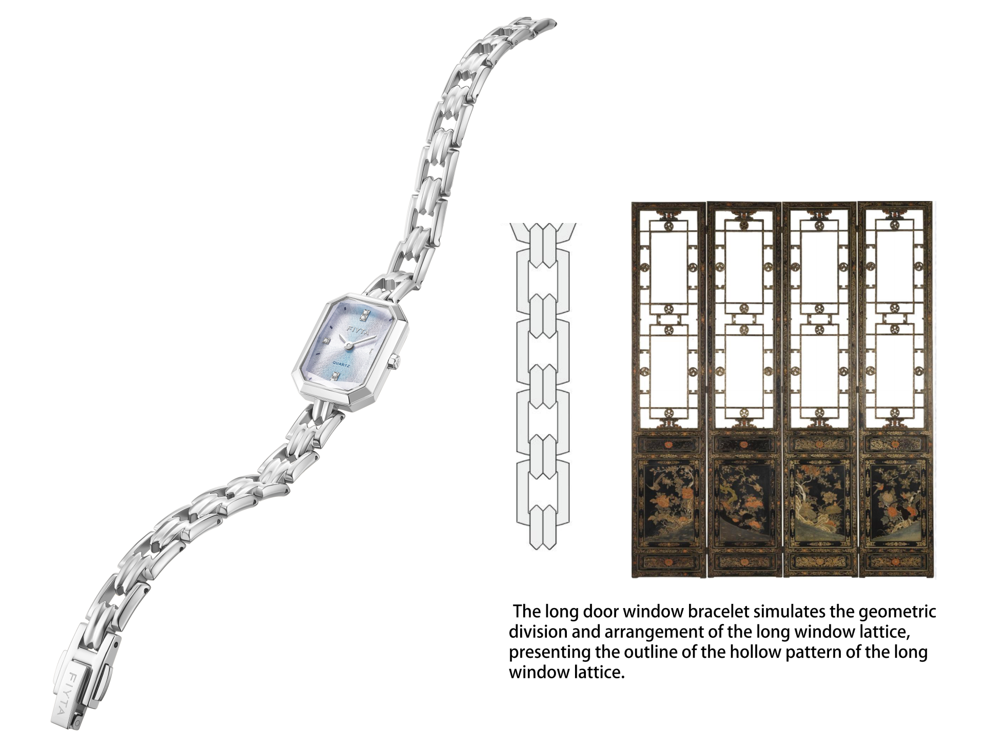 Inspired by the intangible cultural heritage of Suzhou embroidery, the dial is like a spread of Suzhou embroidery silk, with fine smudges to depict the garden scenery; the case is inspired by the "flower window" of Suzhou gardens, taking the beauty of the octagonal frame, opening the embroidered window of time to see the beauty of the East.
