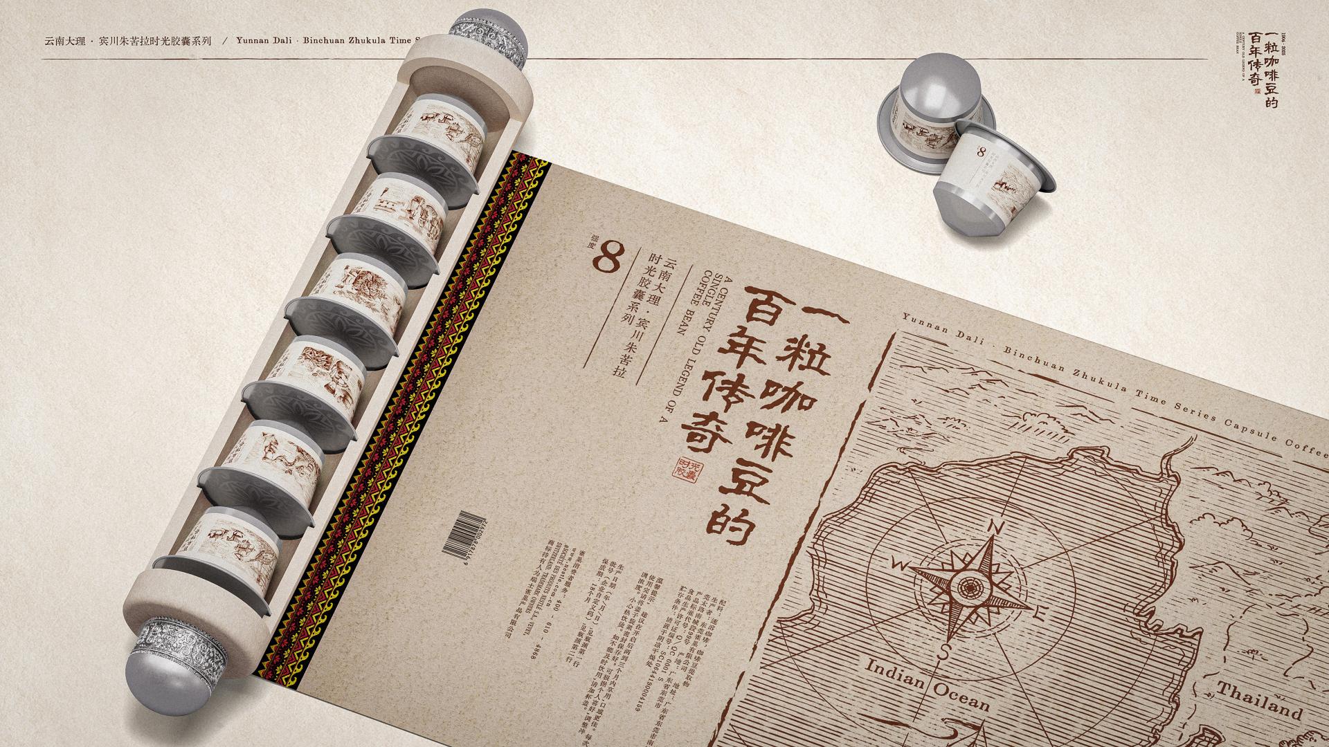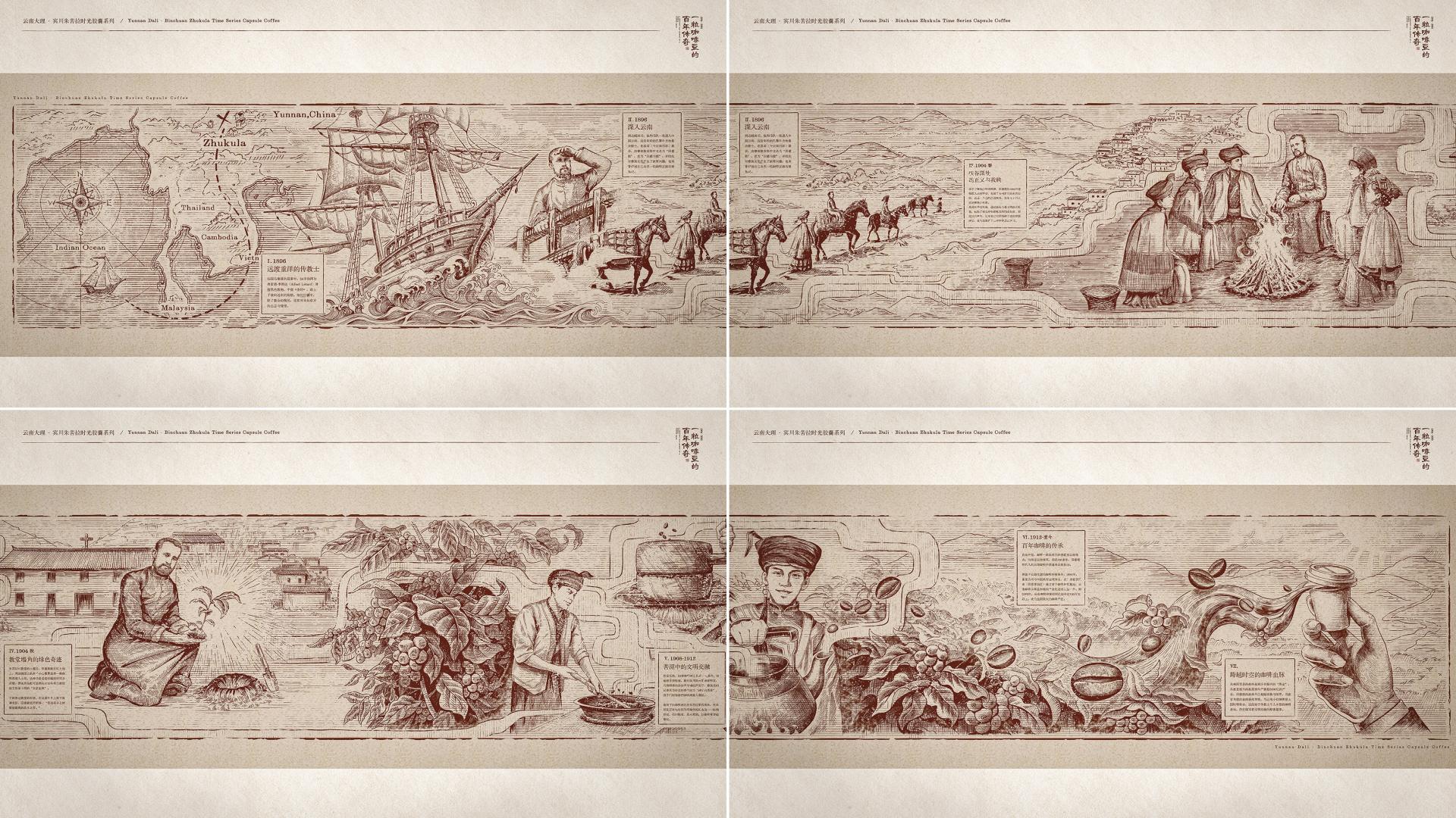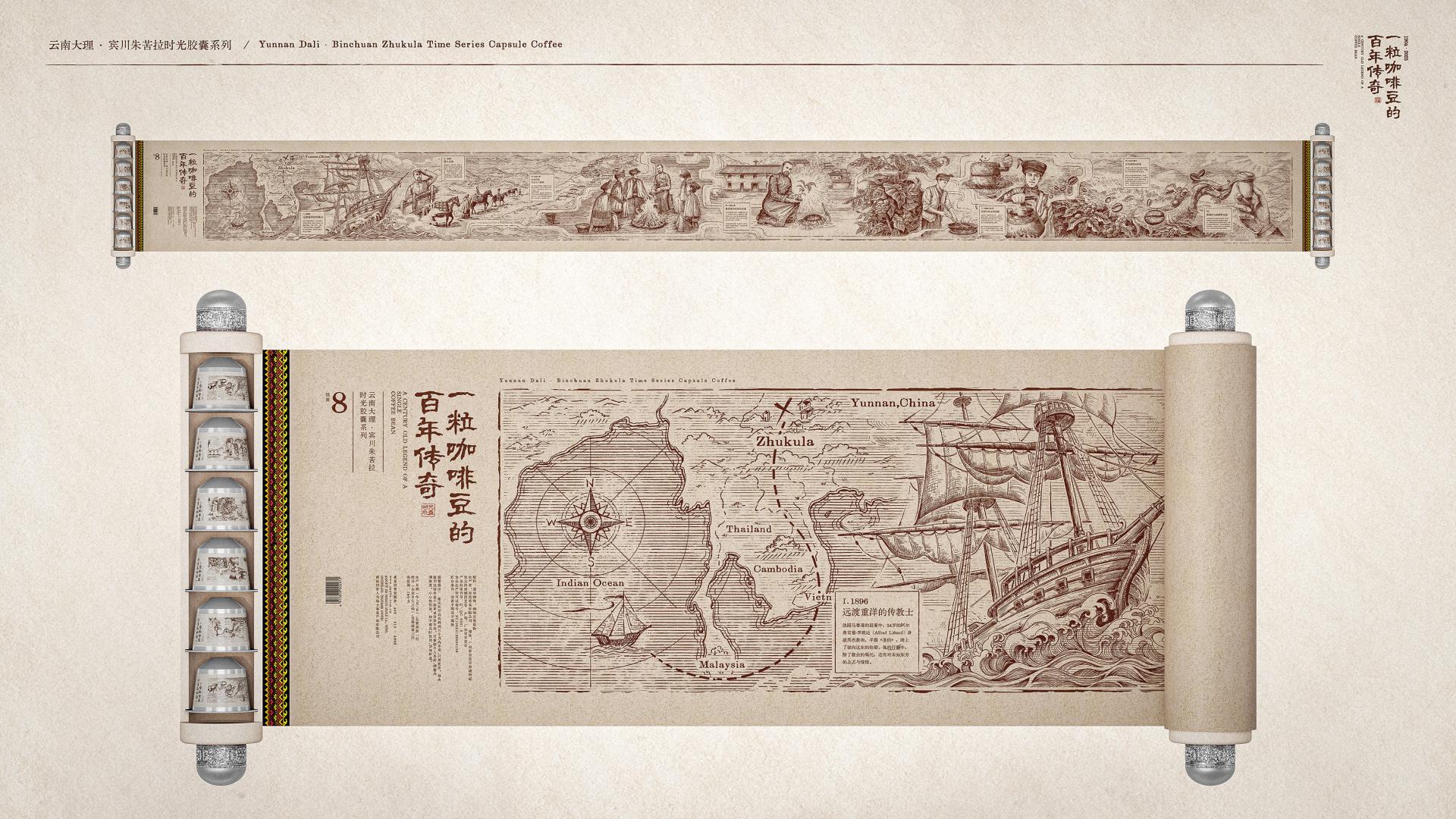 The key standout feature of this packaging is its unfoldable, scroll-like structure. The scroll tells the century-old legendary story of China's first coffee tree—the Zhukula coffee tree in Binchuan, Yunnan. Through vivid illustrations and descriptive texts, it highlights the historical significance of this coffee tree and its profound influence on the development of China's coffee industry, delivering a unique narrative about the intersection of coffee and Chinese culture.