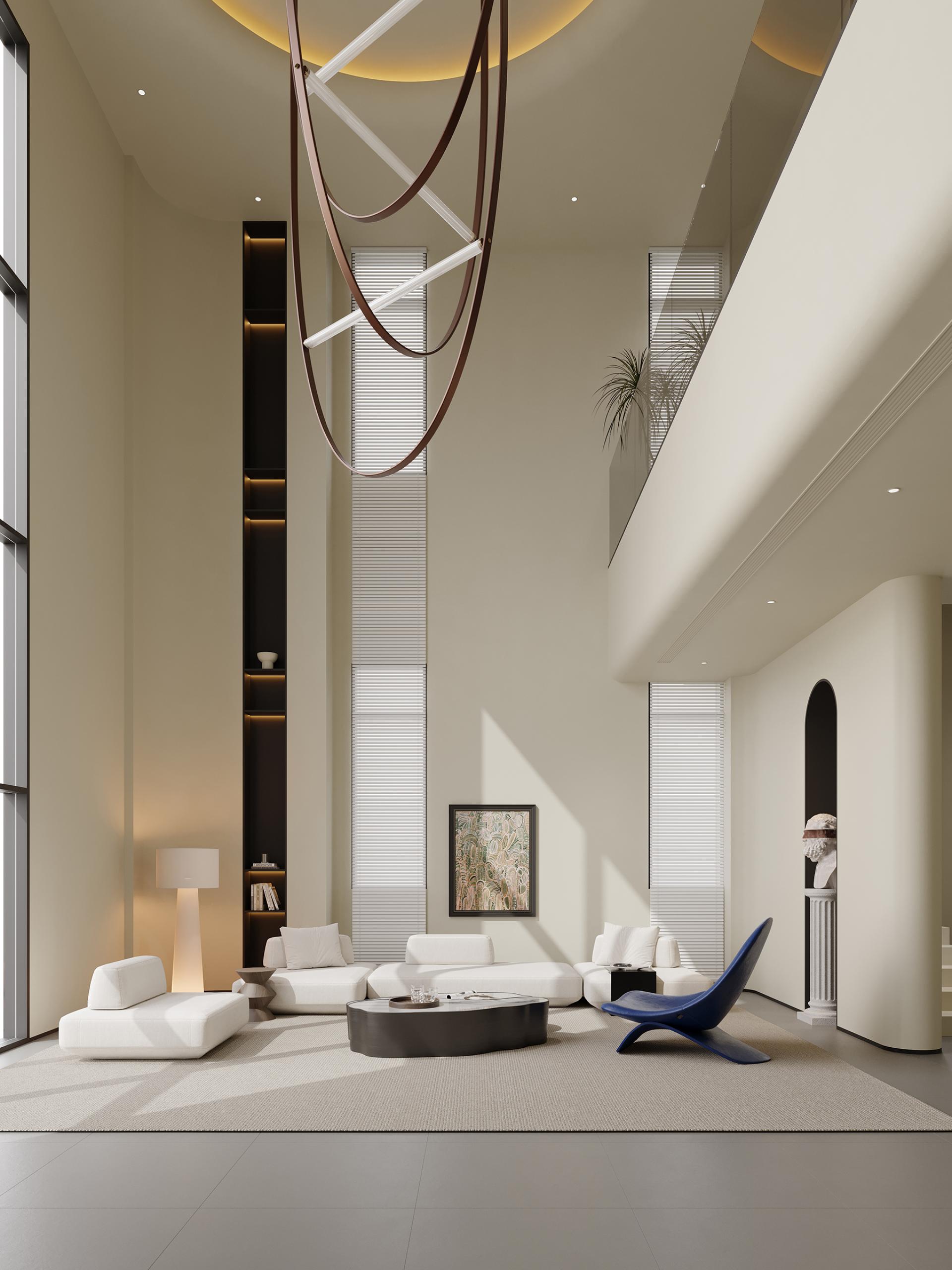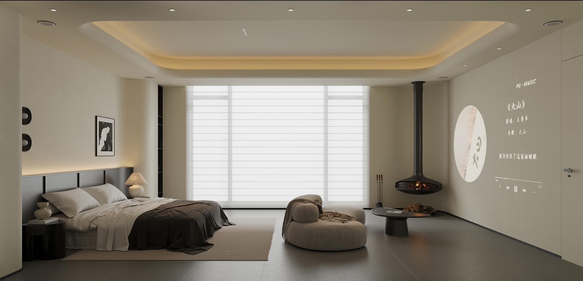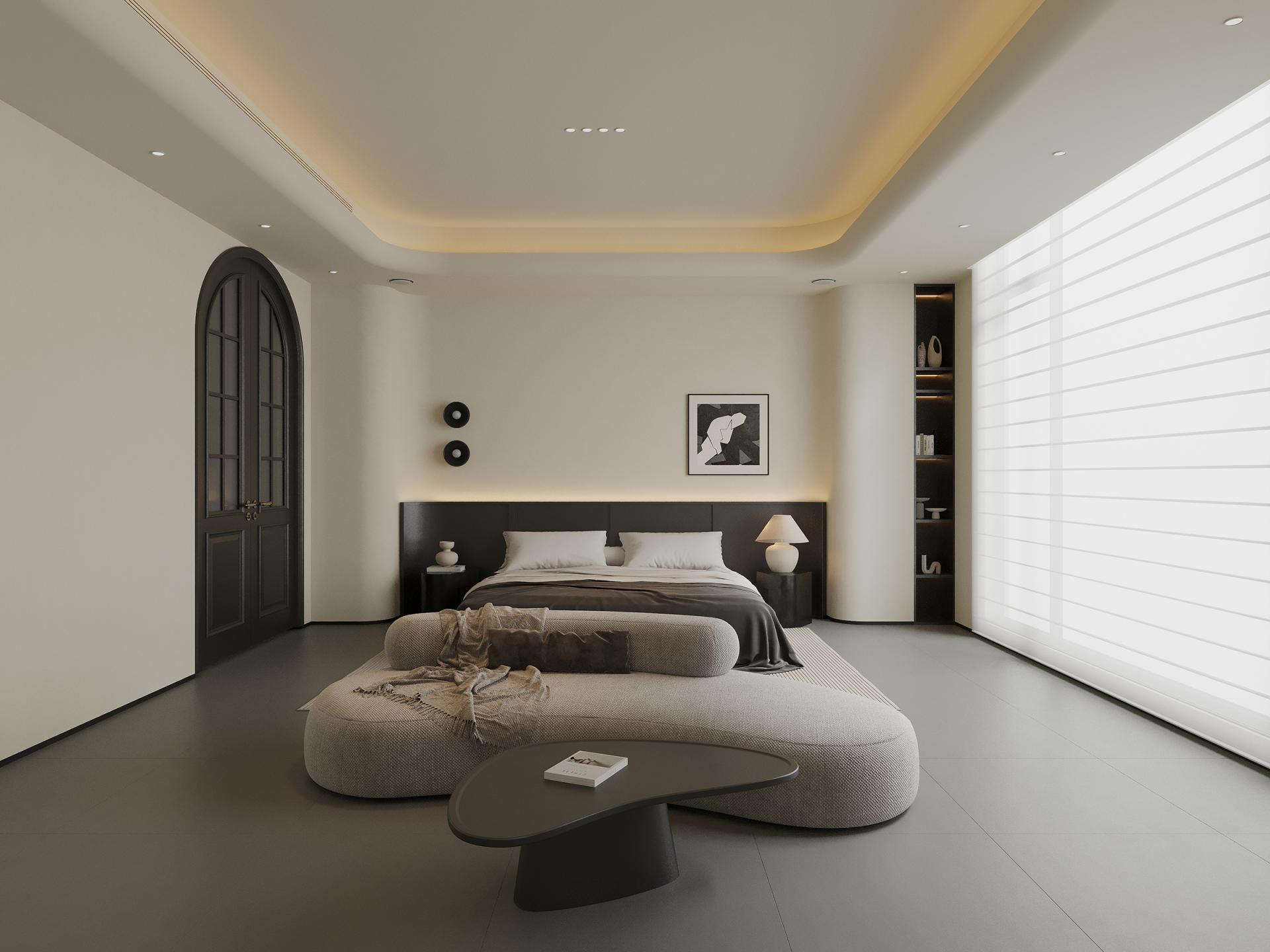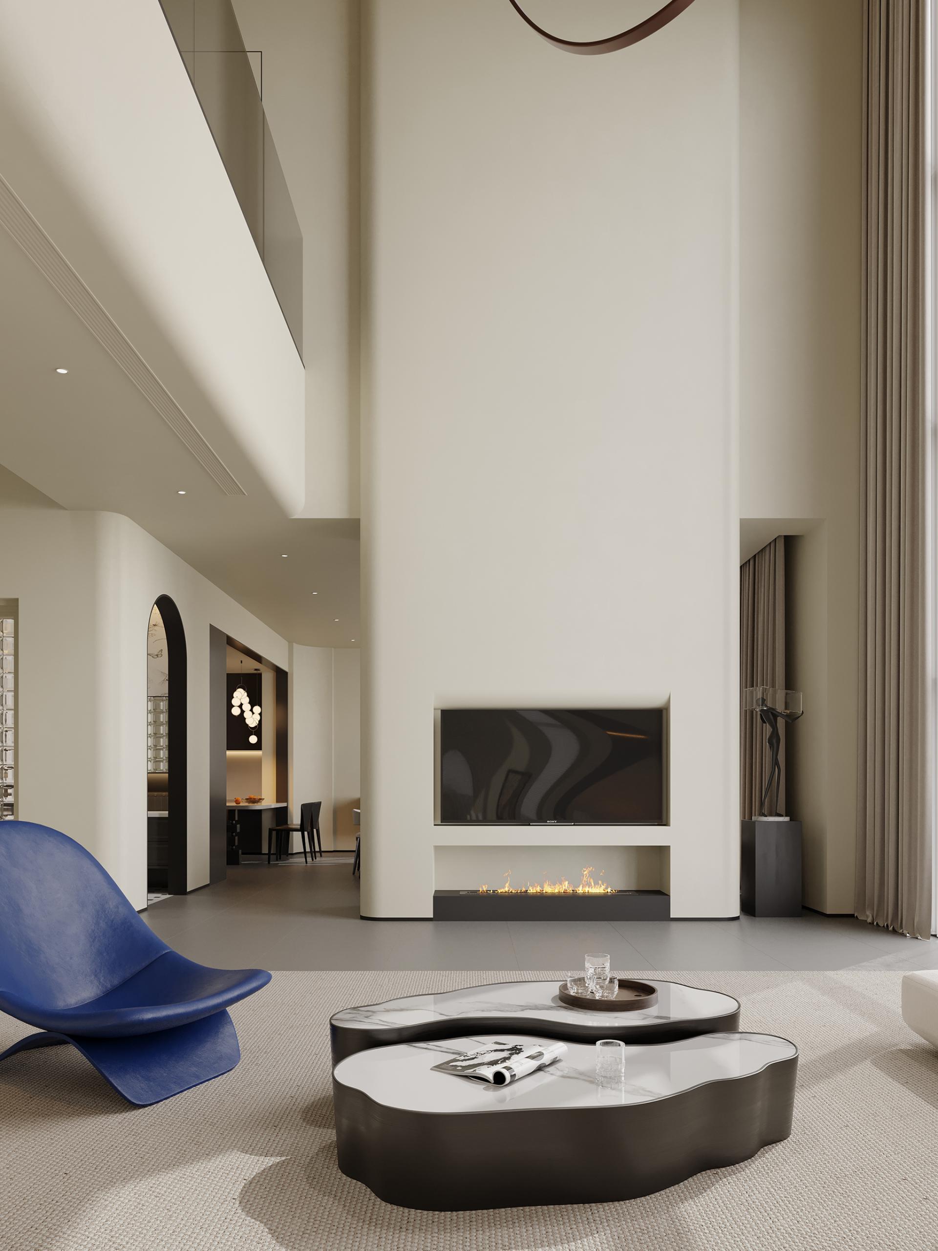 This residence embraces a minimalist French design style interwoven with Wabi-Sabi-inspired Chinese elements, crafting a refined yet serene living environment that emphasizes natural texture, calmness, and emotional comfort. The first floor houses a tea room that reflects a modern Chinese aesthetic, seamlessly blending traditional details with contemporary simplicity. Warm wooden furniture and soft-toned materials create a peaceful setting for tea drinking and relaxation. Large windows allow abundant natural light to pour in, enhancing the atmosphere with brightness and openness. Carefully placed wall decorations and greenery add vibrancy, connecting the interior to nature and enriching the sensory experience. This space is not only ideal for tea appreciation but also offers a moment of peace amid the pace of urban life. The second floor features a high ceiling that extends the visual dimension, with clean architectural lines outlining a sense of spaciousness. A neutral color palette dominates, complemented by blue leisure chairs and a striking black tea table, adding visual contrast and warmth. The sleek fireplace and minimalist TV wall fulfill functional needs while preserving aesthetic harmony, presenting a calm and stylish living area that reflects modern lifestyle preferences. On the third floor, the master bedroom adopts a balanced blend of gray and white tones to evoke serenity. Ambient lighting, symmetrical bedside lamps, and a built-in bookshelf offer both beauty and practicality. Large windows with adjustable blinds provide flexible lighting control. A circular lounge chair, cozy fireplace, and arched doorway leading to a refined dressing room reflect understated French elegance. The wardrobe’s black-and-white contrast, central island, pendant lights, and music projection further express the owner’s modern, tasteful way of living. In the courtyard, moss-covered stones, suspended greenery, and geometric white windows frame a poetic connection between nature and modernity, bringing harmony and a layered visual rhythm to the outdoor space.