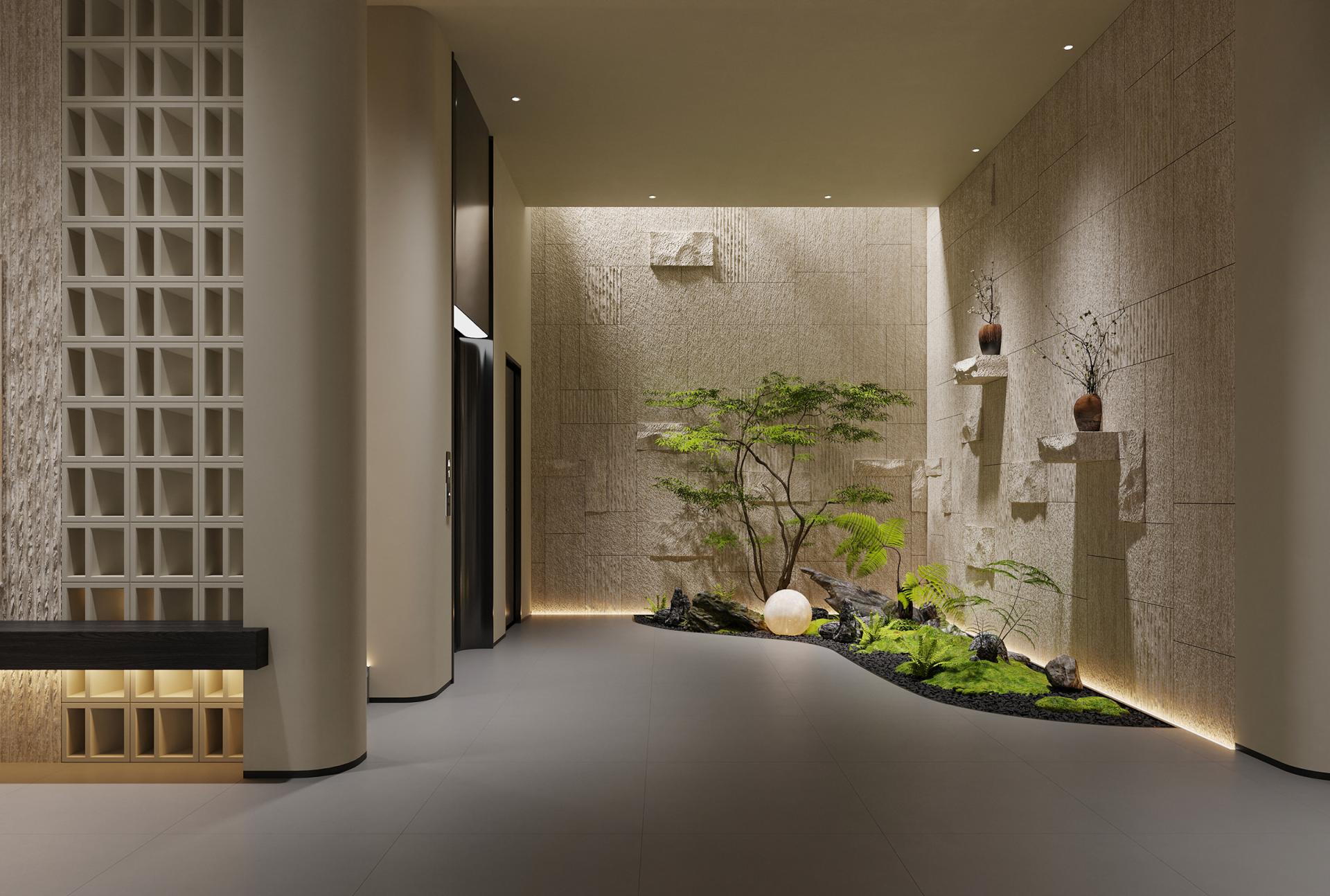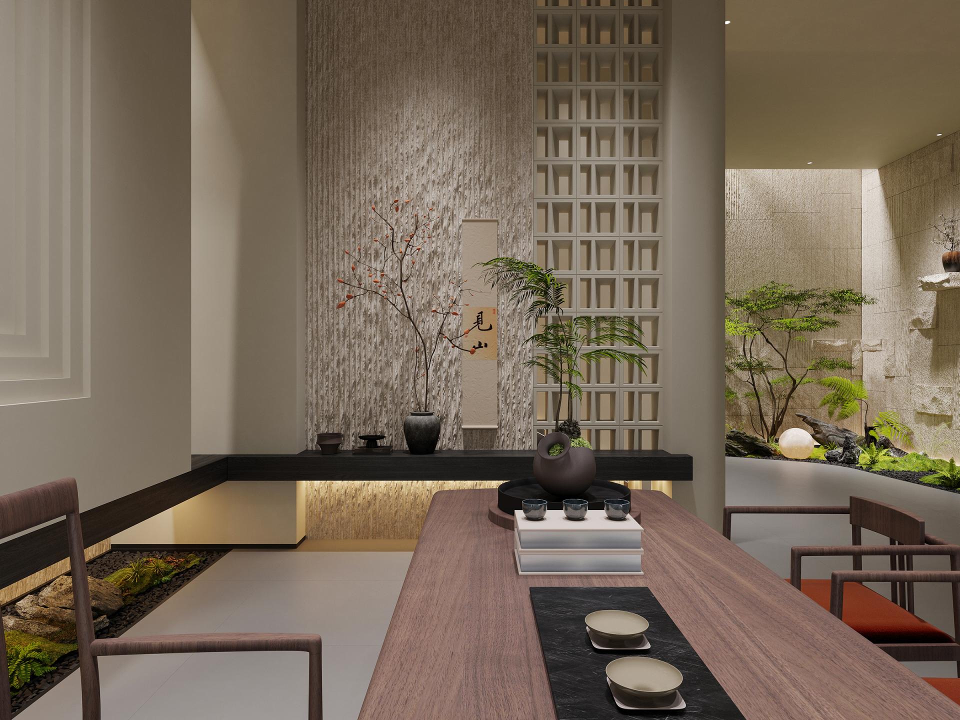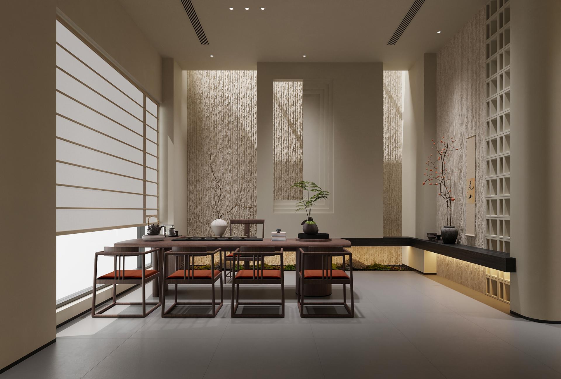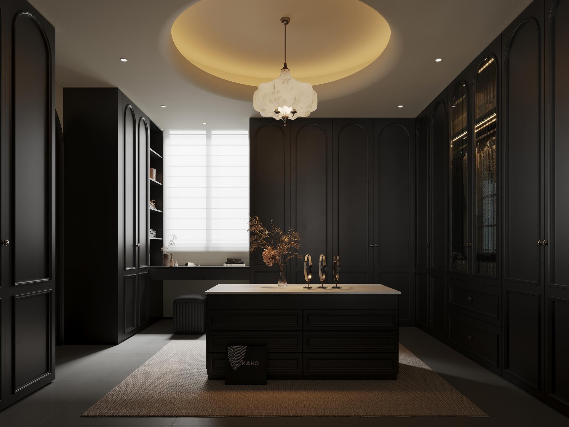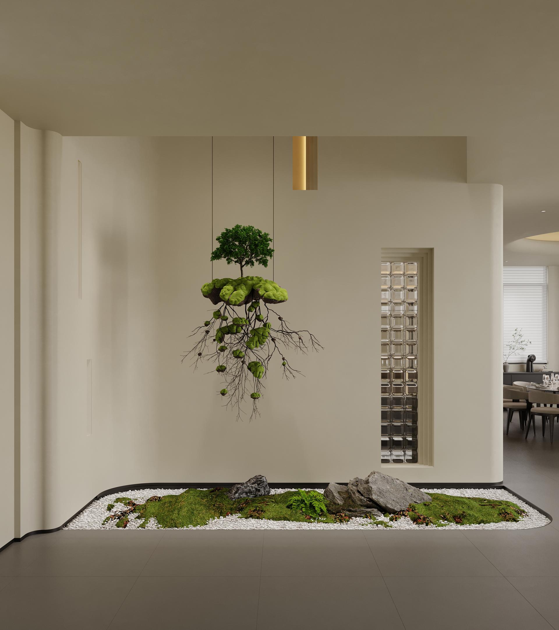 This residence embraces a minimalist French design style interwoven with Wabi-Sabi-inspired Chinese elements, crafting a refined yet serene living environment that emphasizes natural texture, calmness, and emotional comfort. The first floor houses a tea room that reflects a modern Chinese aesthetic, seamlessly blending traditional details with contemporary simplicity. Warm wooden furniture and soft-toned materials create a peaceful setting for tea drinking and relaxation. Large windows allow abundant natural light to pour in, enhancing the atmosphere with brightness and openness. Carefully placed wall decorations and greenery add vibrancy, connecting the interior to nature and enriching the sensory experience. This space is not only ideal for tea appreciation but also offers a moment of peace amid the pace of urban life. The second floor features a high ceiling that extends the visual dimension, with clean architectural lines outlining a sense of spaciousness. A neutral color palette dominates, complemented by blue leisure chairs and a striking black tea table, adding visual contrast and warmth. The sleek fireplace and minimalist TV wall fulfill functional needs while preserving aesthetic harmony, presenting a calm and stylish living area that reflects modern lifestyle preferences. On the third floor, the master bedroom adopts a balanced blend of gray and white tones to evoke serenity. Ambient lighting, symmetrical bedside lamps, and a built-in bookshelf offer both beauty and practicality. Large windows with adjustable blinds provide flexible lighting control. A circular lounge chair, cozy fireplace, and arched doorway leading to a refined dressing room reflect understated French elegance. The wardrobe’s black-and-white contrast, central island, pendant lights, and music projection further express the owner’s modern, tasteful way of living. In the courtyard, moss-covered stones, suspended greenery, and geometric white windows frame a poetic connection between nature and modernity, bringing harmony and a layered visual rhythm to the outdoor space.