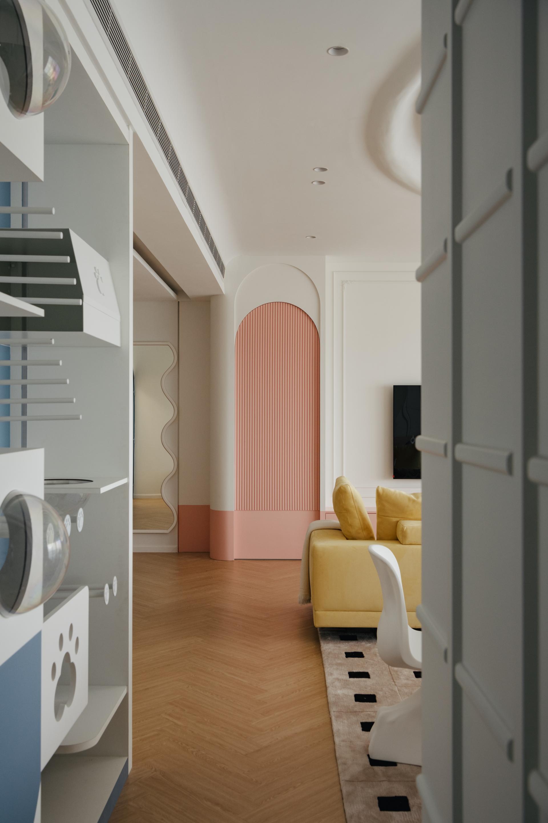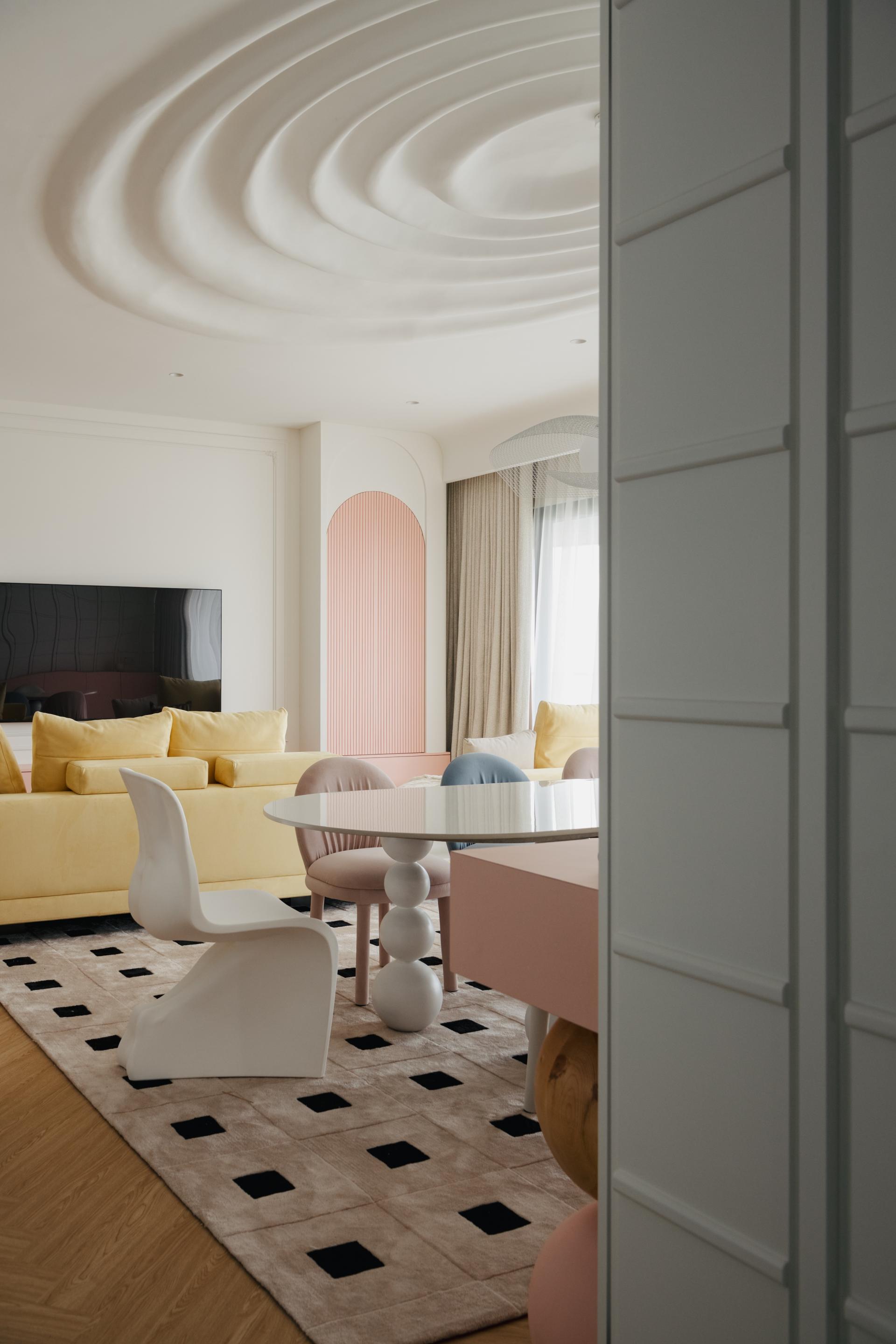 The color palette plays a key role in defining the mood: warm neutrals and soft pinks create a calming base, while pops of yellow and blue inject cheerfulness without overwhelming the room. The furnishings are intentionally eclectic mixing organic curves with clean lines, each piece chosen not just for function but for its character and contribution to the overall narrative.
