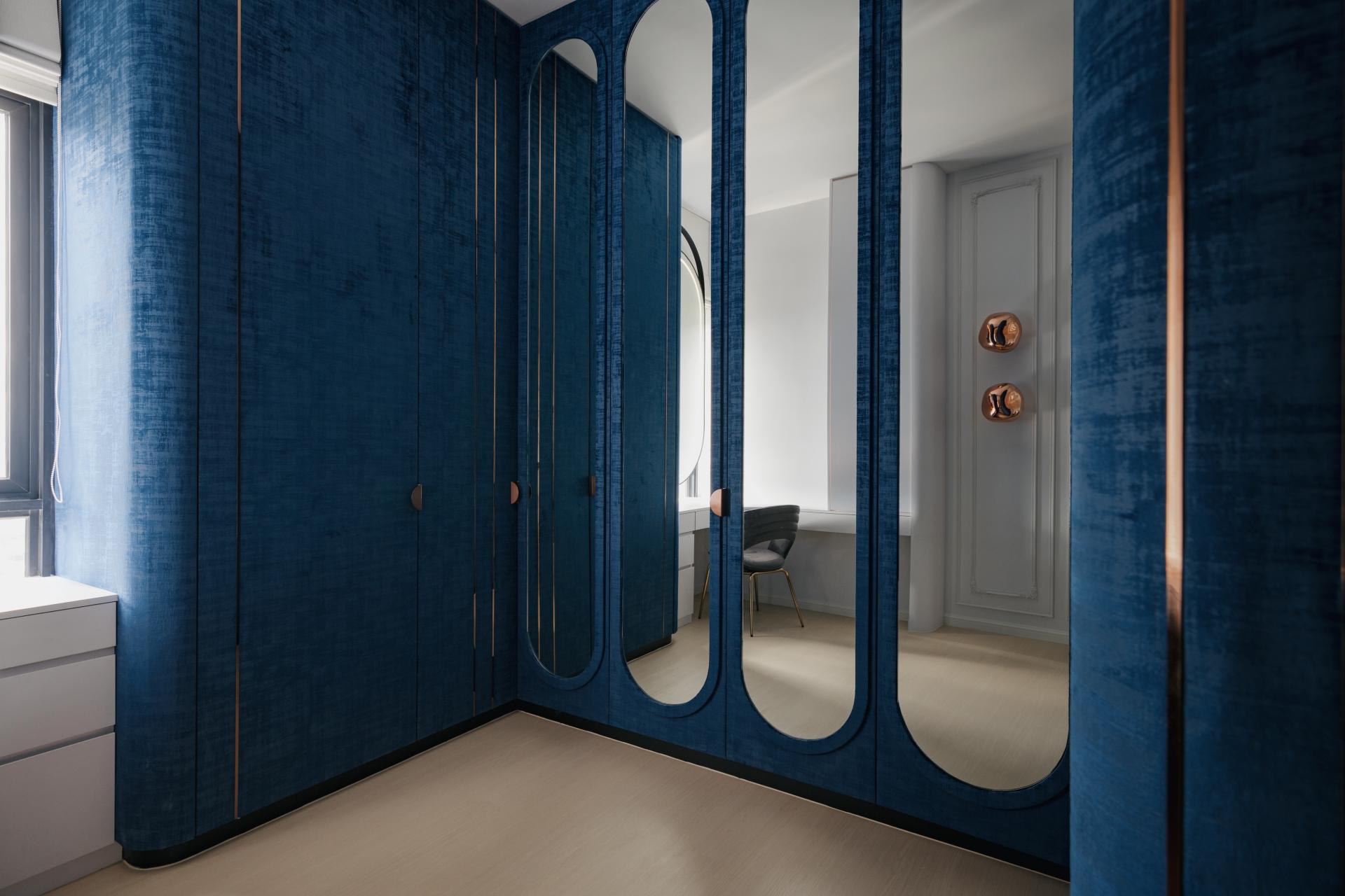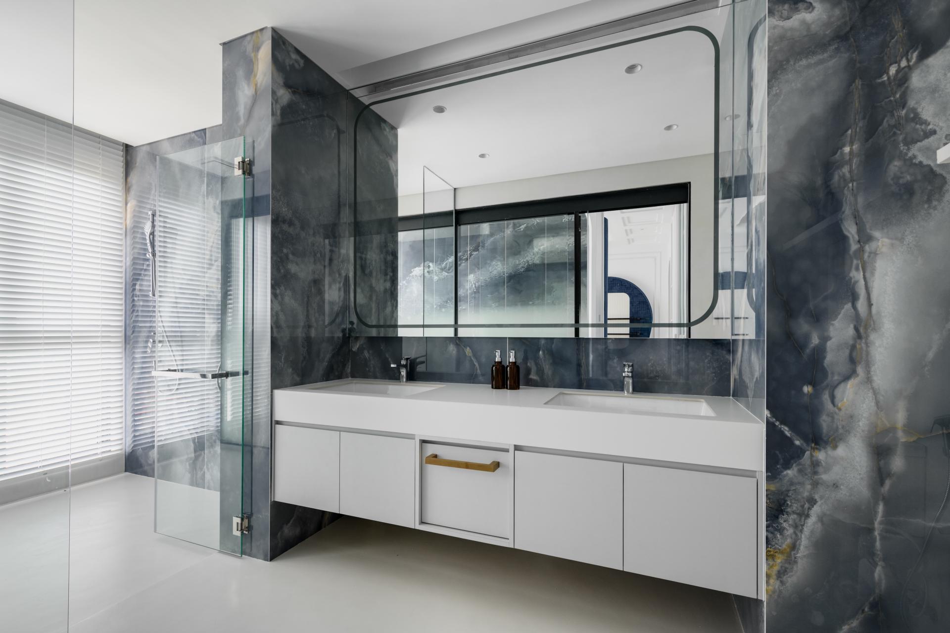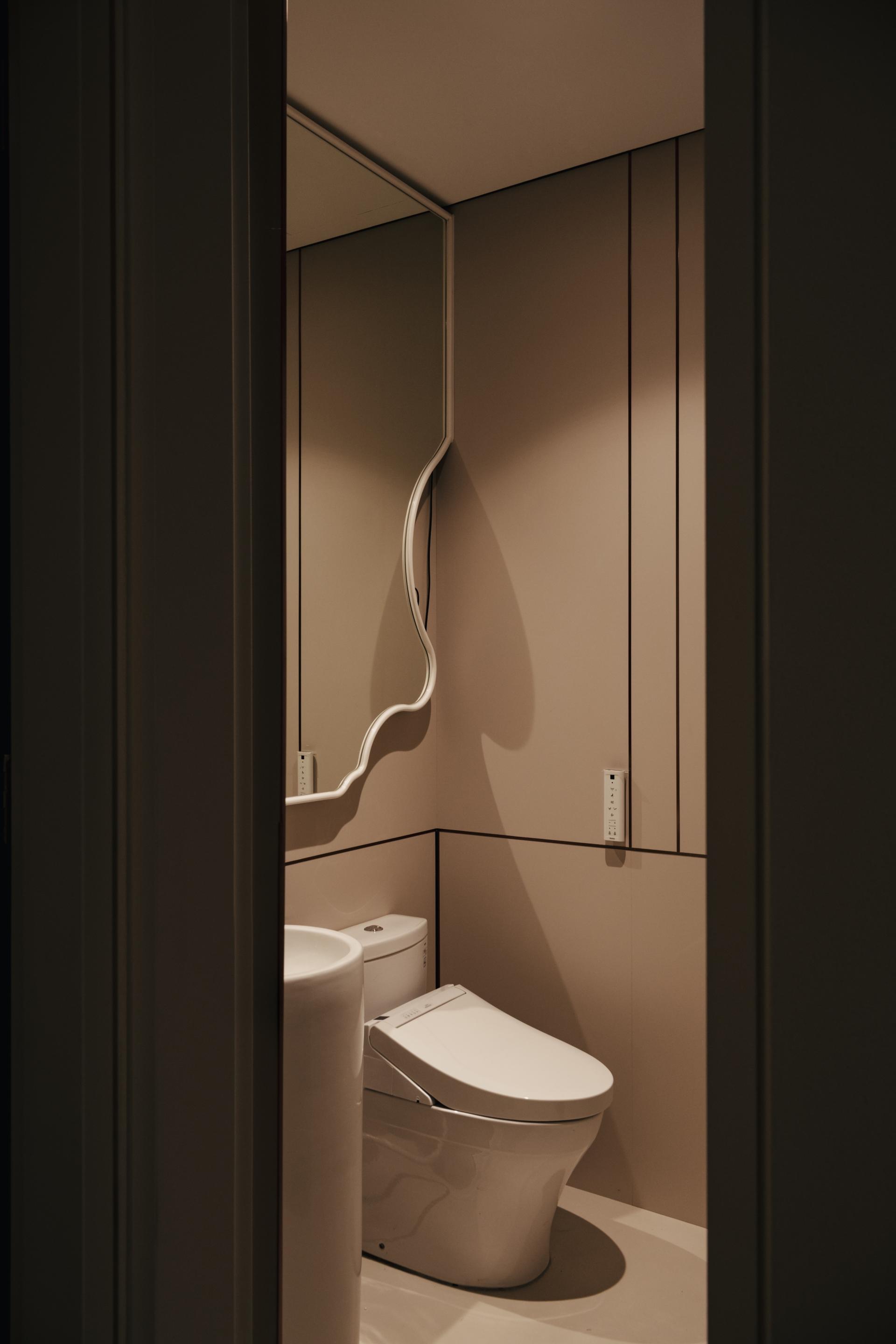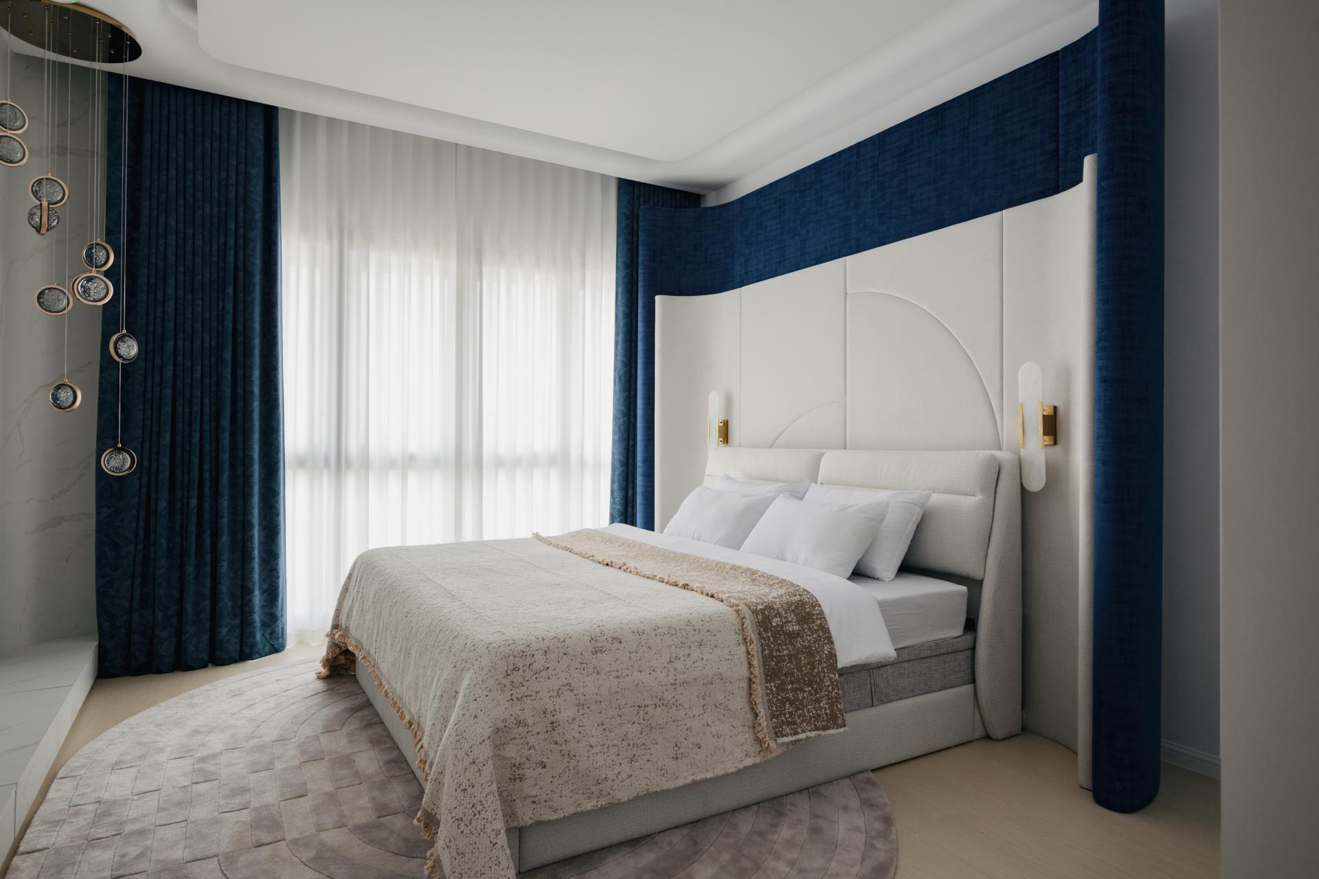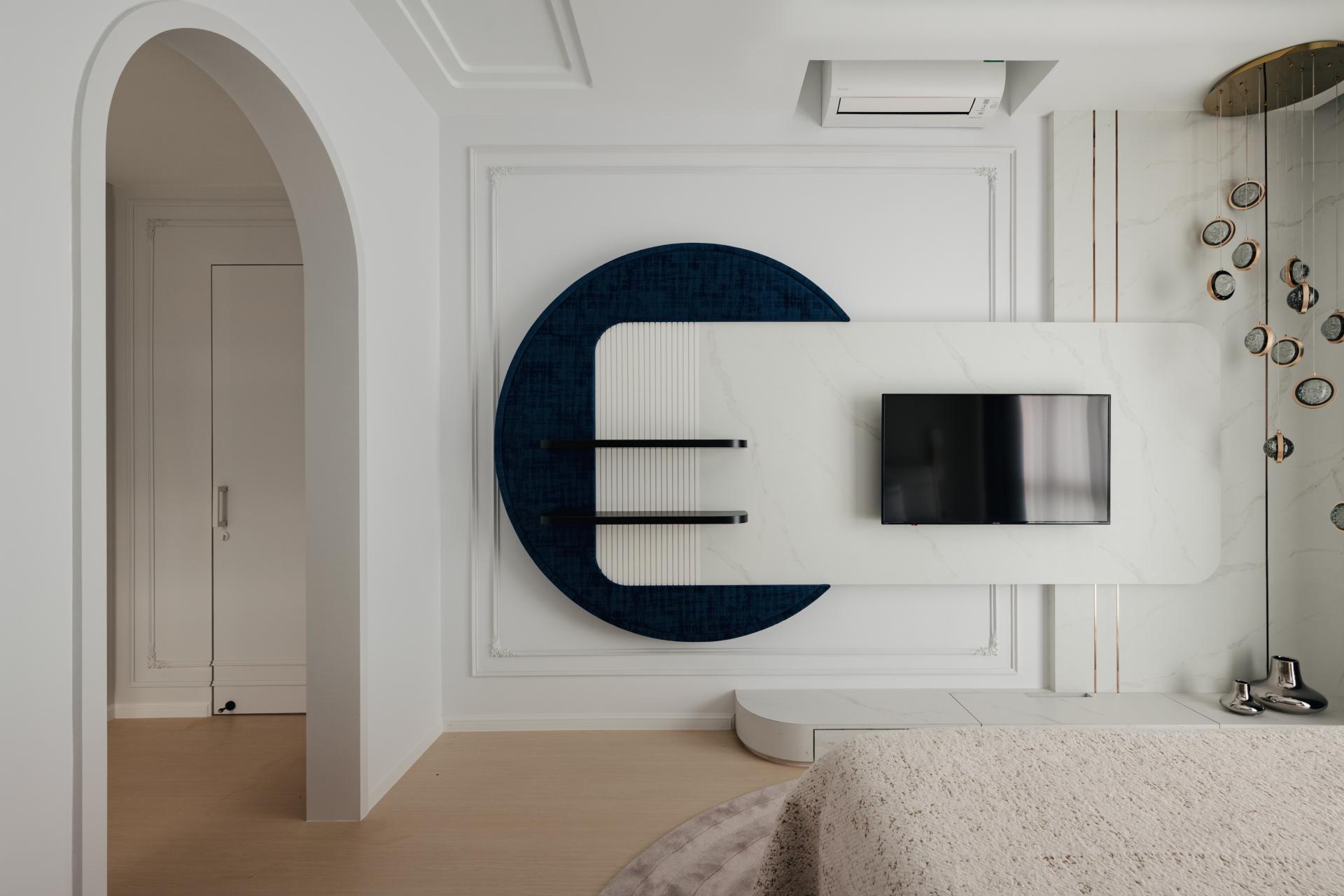 The ceiling design, with its ripple-like form, adds a dynamic sense of movement and becomes a sculptural focal point, mimicking the idea of calm water or sound waves evoking serenity and fluidity. The round mirror and playful pedestal console enhance the artistic atmosphere, while elements like the herringbone flooring and grid-paneled wall ground the space in modernity and structure.