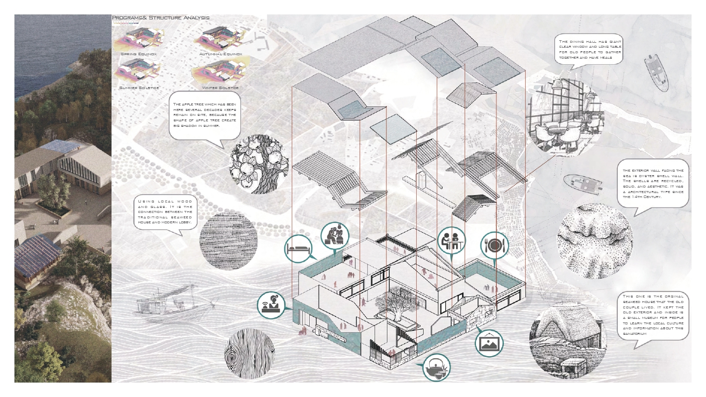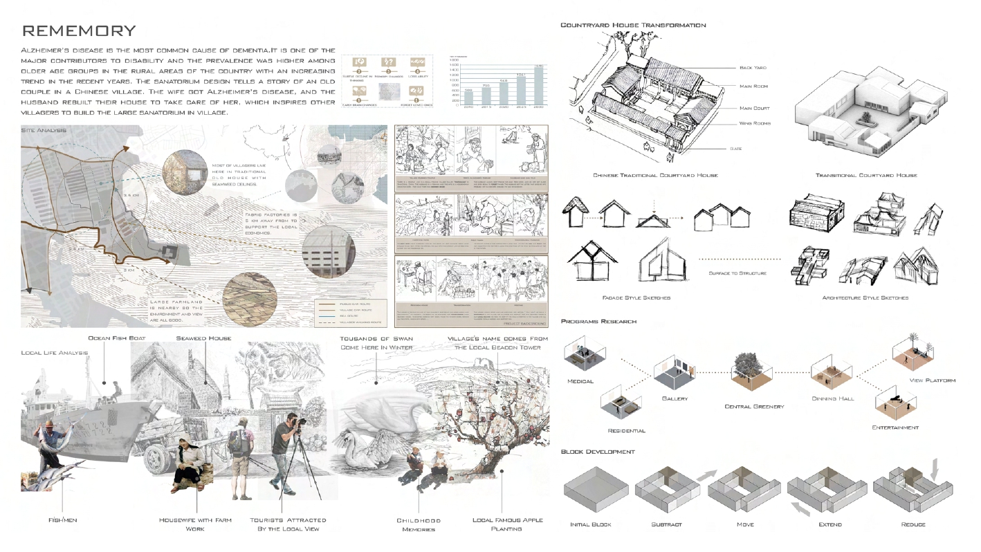 This project envisions a sustainable sanatorium in a coastal village, designed for individuals with Alzheimer’s. Inspired by a local couple’s story, it integrates memory, nature, and community to create a familiar, supportive environment. Combining traditional architecture with sustainable practices, it prioritizes residents’ physical, emotional, and cognitive well-being, offering a sense of home and connection to nature.