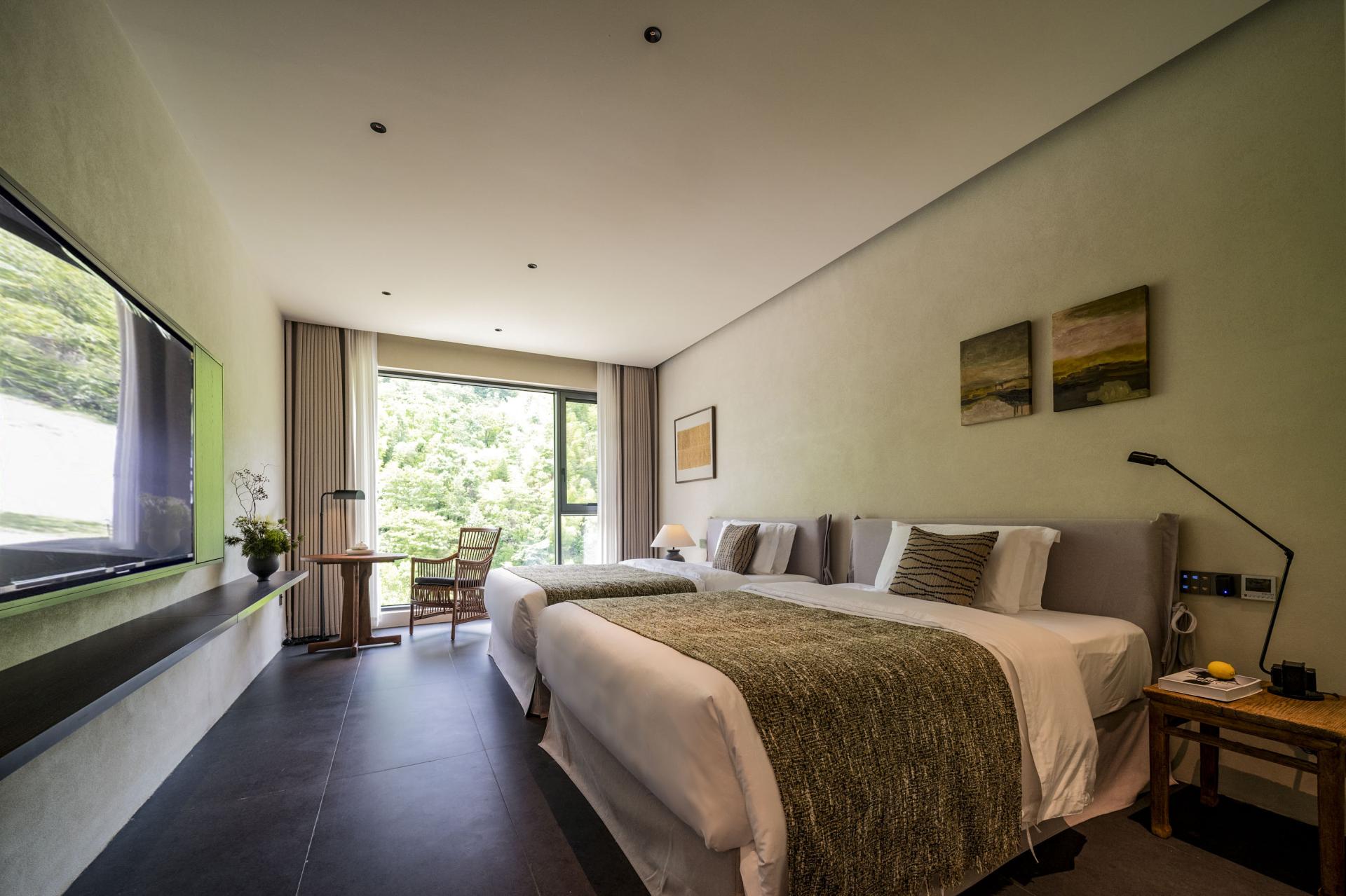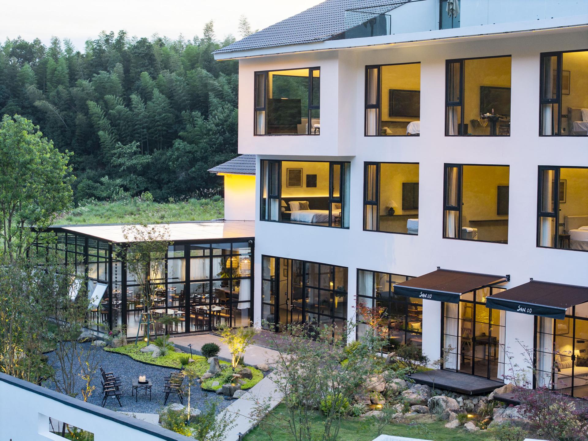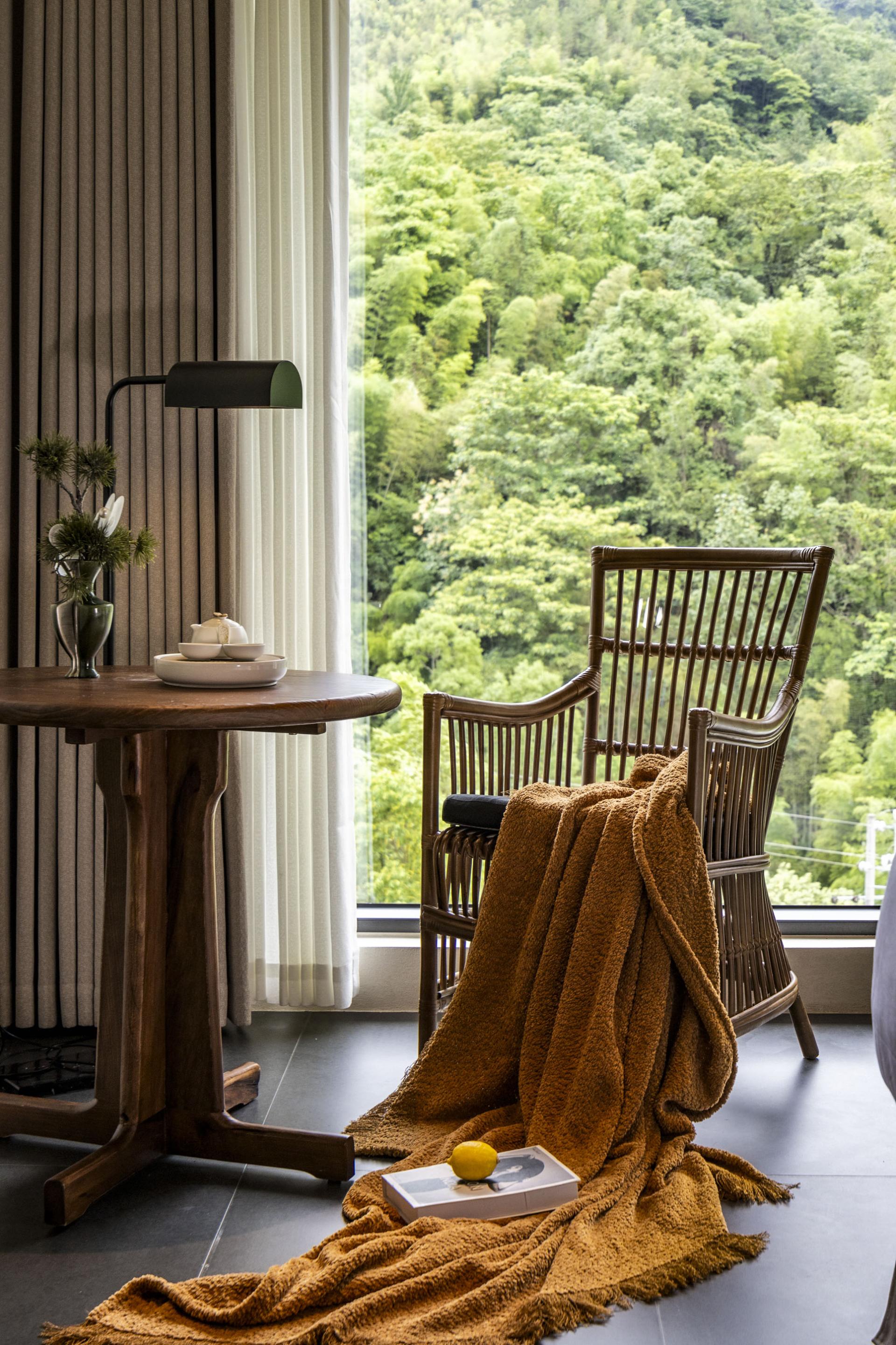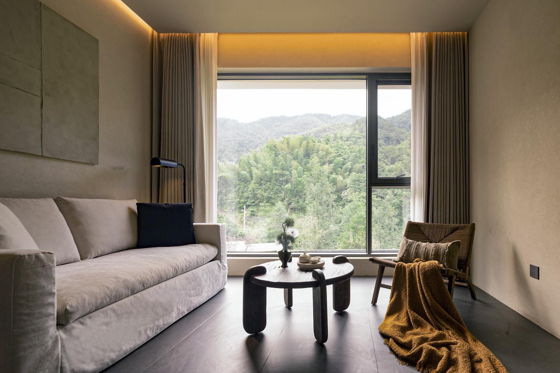 The design deeply integrates local Hakka culture with the surrounding natural landscape, emphasizing regional identity while crafting a relaxed, resort-like ambiance. Drawing inspiration from the basalt textures of nearby glacial relics, interior materials feature rough-textured walls and matte black flooring, forming a "dialogue between rigidity and softness" through their contrast. The overall design adheres to the principle of emphasizing soft decoration over hard decoration, presenting the spatial structure and functionality in a minimalist manner. By utilizing minimalist materials and techniques, ample white spaces are created throughout the design. In natural healing design, lighting eschews standardized hotel illumination, utilizing adjustable smart lighting and star trail-inspired lighting through large floor-to-ceiling windows. Acoustic control employs double-layered insulated glass to block wind and rain noise while preserving the stream's white noise. The space regularly hosts resident workshops by local intangible cultural heritage masters. It deeply integrates geological culture with natural healing, translating the geological features of Quaternary glaciers into spatial language. Through bamboo-woven furniture, plant installations of Taxus chinensis var. mairei, and an acoustic system utilizing the stream, it constructs a multi-dimensional natural experience. It also innovatively applies intangible cultural heritage, breaking through traditional limitations by transforming Xia cloth nto a modern functional carrier. Old objects form a "mini folk museum," endowing the space with a sense of temporal depth. Additionally, it has created a low-intervention healing system, enhancing the experience through light therapy systems and acoustic healing. The design process encountered numerous difficulties. Issues such as damage and incompleteness of old objects were addressed through restoration, mounting, classified display, and the creation of electronic archives. Xia cloth, prone to wrinkling and shrinking, was treated with composite backing technology and pre-shrinking processes, with plant-dyed Xia cloth selected. This reduced the loss rate from 25% to 8% while making the colors more durable and natural. Sustainability permeates every detail: a 100% reuse policy for recycled materials (from stone piers to wardrobes) achieves zero-waste renovation. Material carbon footprints are strictly controlled, with all timber FSC-certified and artistic coatings meeting EU Ecolabel standards.