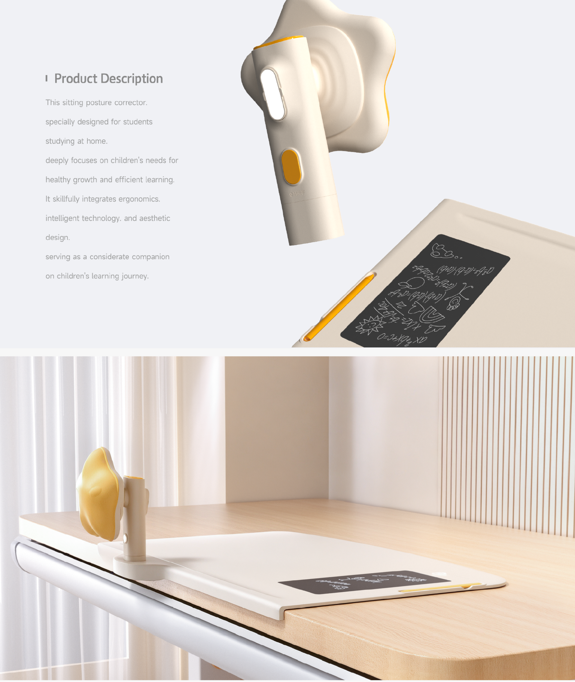 This is a sitting posture corrector designed for children's daily life and study. It is used to regulate children's sitting posture and protect their eyes and physical health. In addition, it is equipped with a handwriting screen in consideration of study habits, making daily calculations convenient.