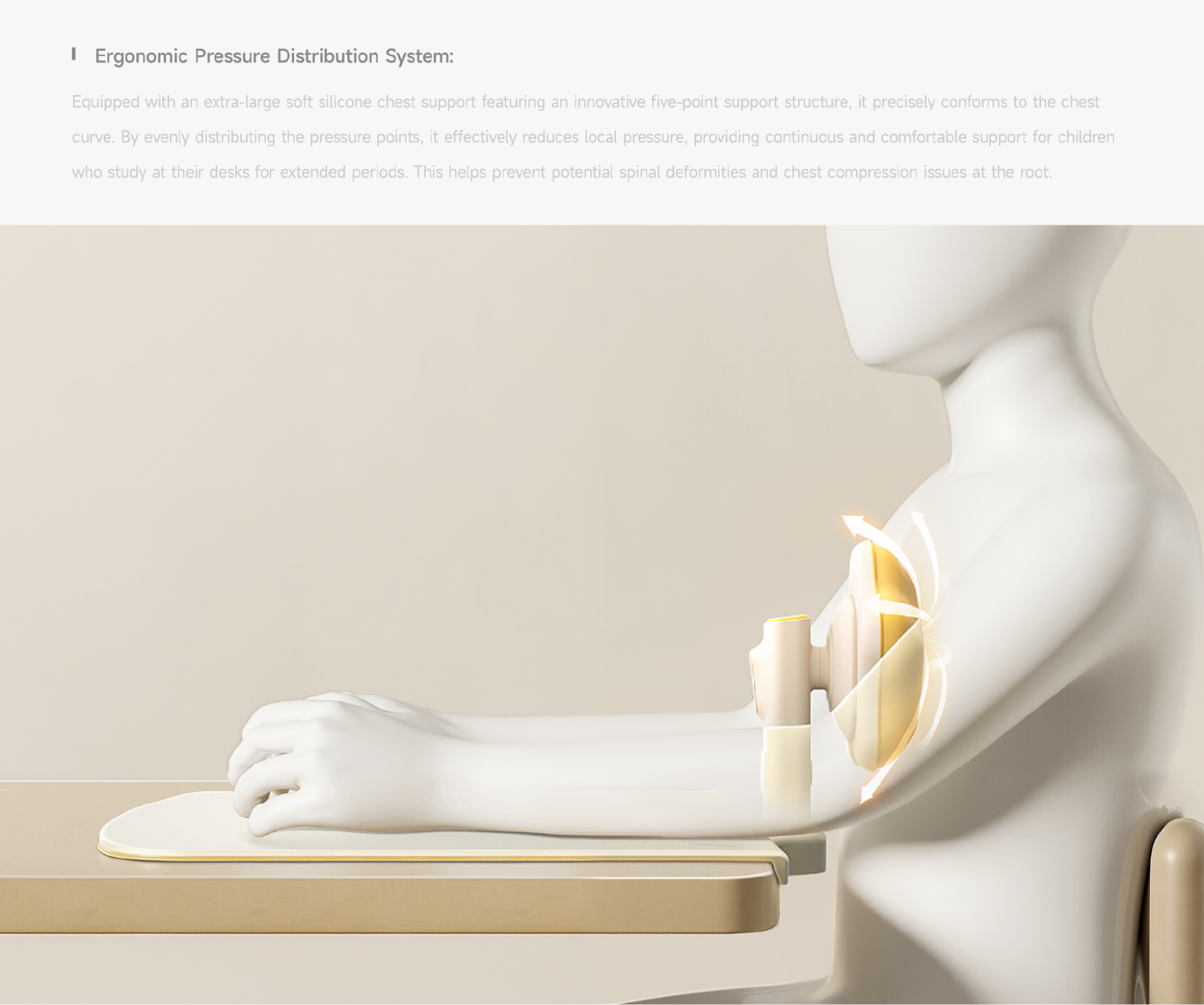 Equipped with an extra-large soft silicone chest support featuring an innovative five-point support structure, it precisely conforms to the chest curve. By evenly distributing the pressure points, it effectively reduces local pressure, providing continuous and comfortable support for children who study at their desks for extended periods. This helps prevent potential spinal deformities and chest compression issues at the root.