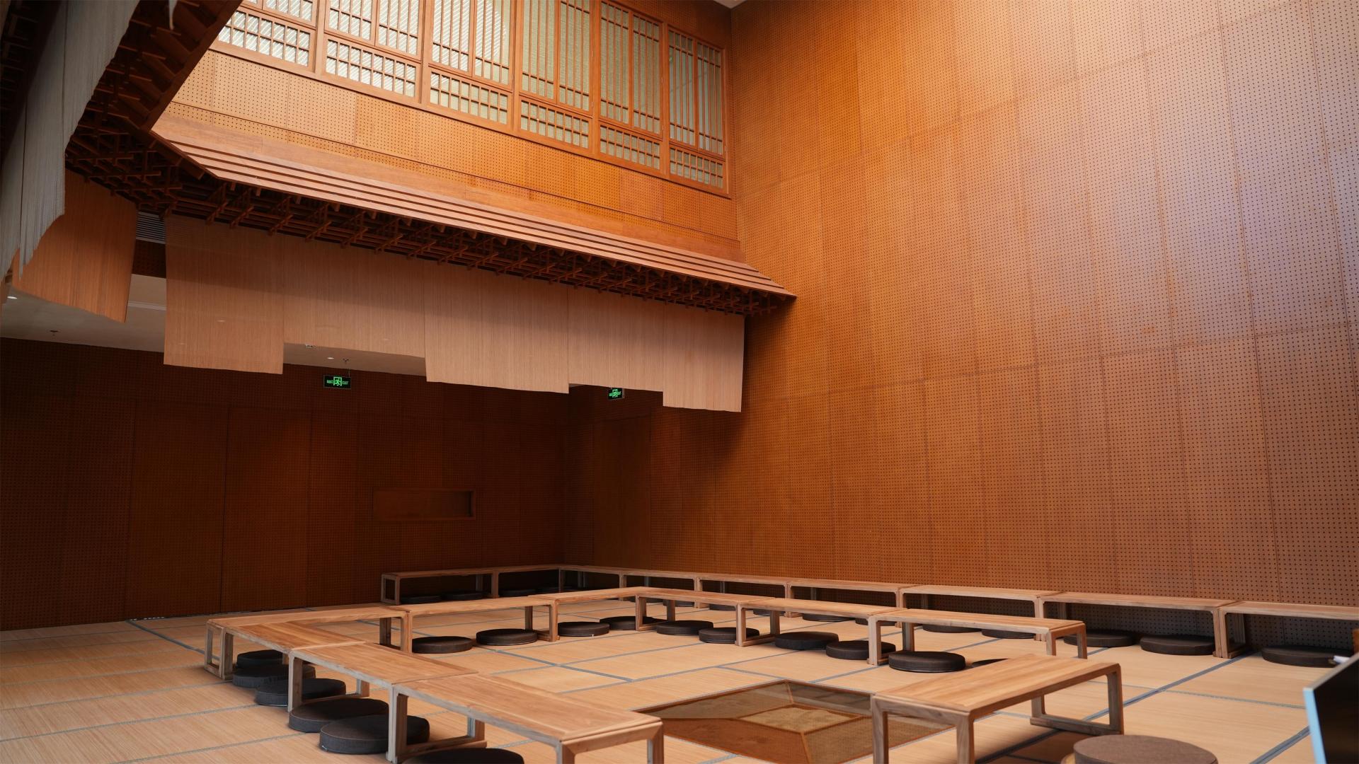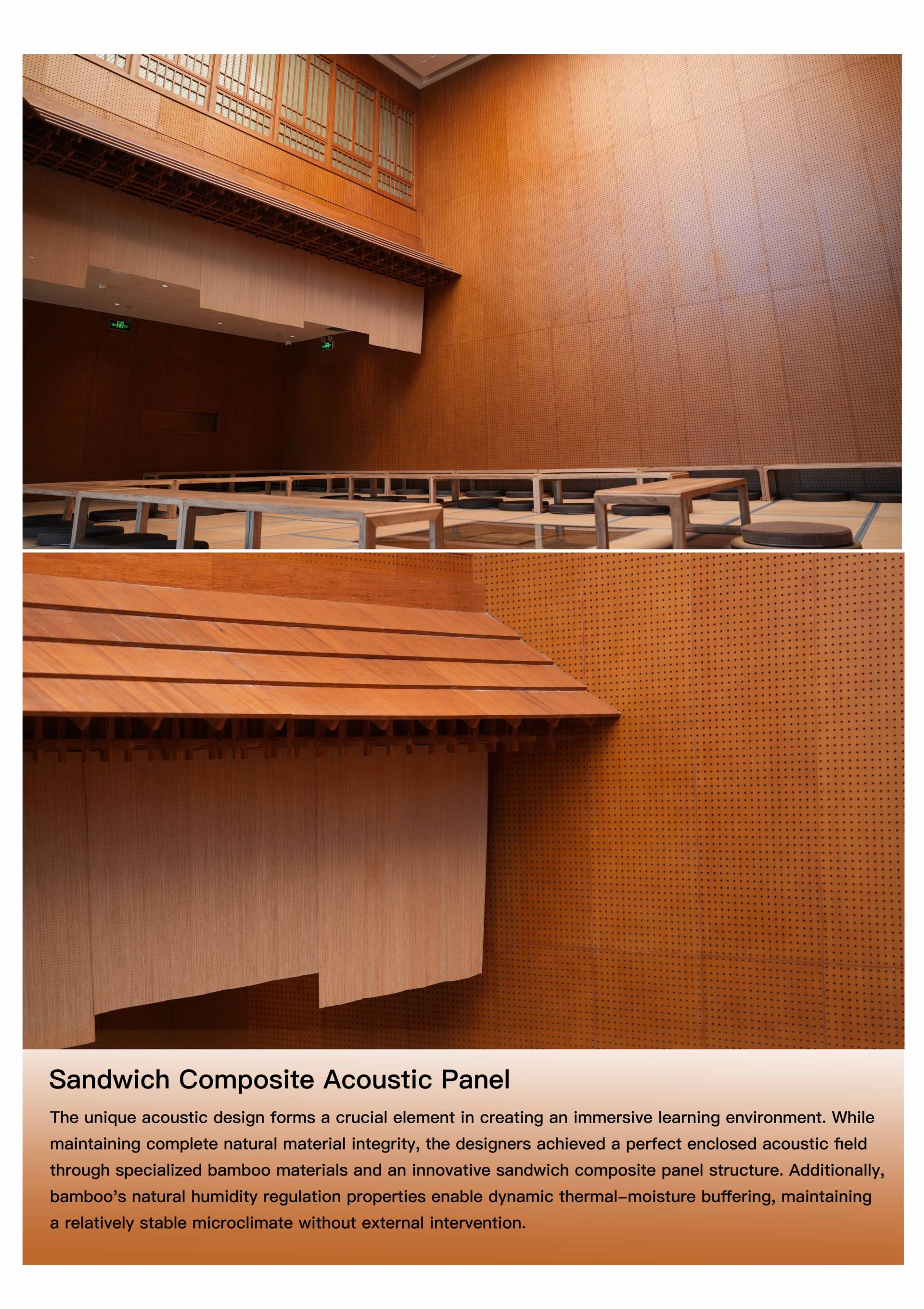 The dojo employs bamboo and sandwich composite panels to create a perfectly enclosed acoustic field. High-frequency sound waves are absorbed by microporous materials, while low-frequency waves are dissipated through cavity resonance, notably reducing reverberation time and eliminating echo interference. The walls and floor are coated with sticky rice mortar containing particles of the five-colored soils, leveraging the pyroelectric effect to release high concentrations of negative oxygen ions and intelligently regulate humidity, achieving self-balancing moisture levels, inhibiting mold, and enhancing comfort.