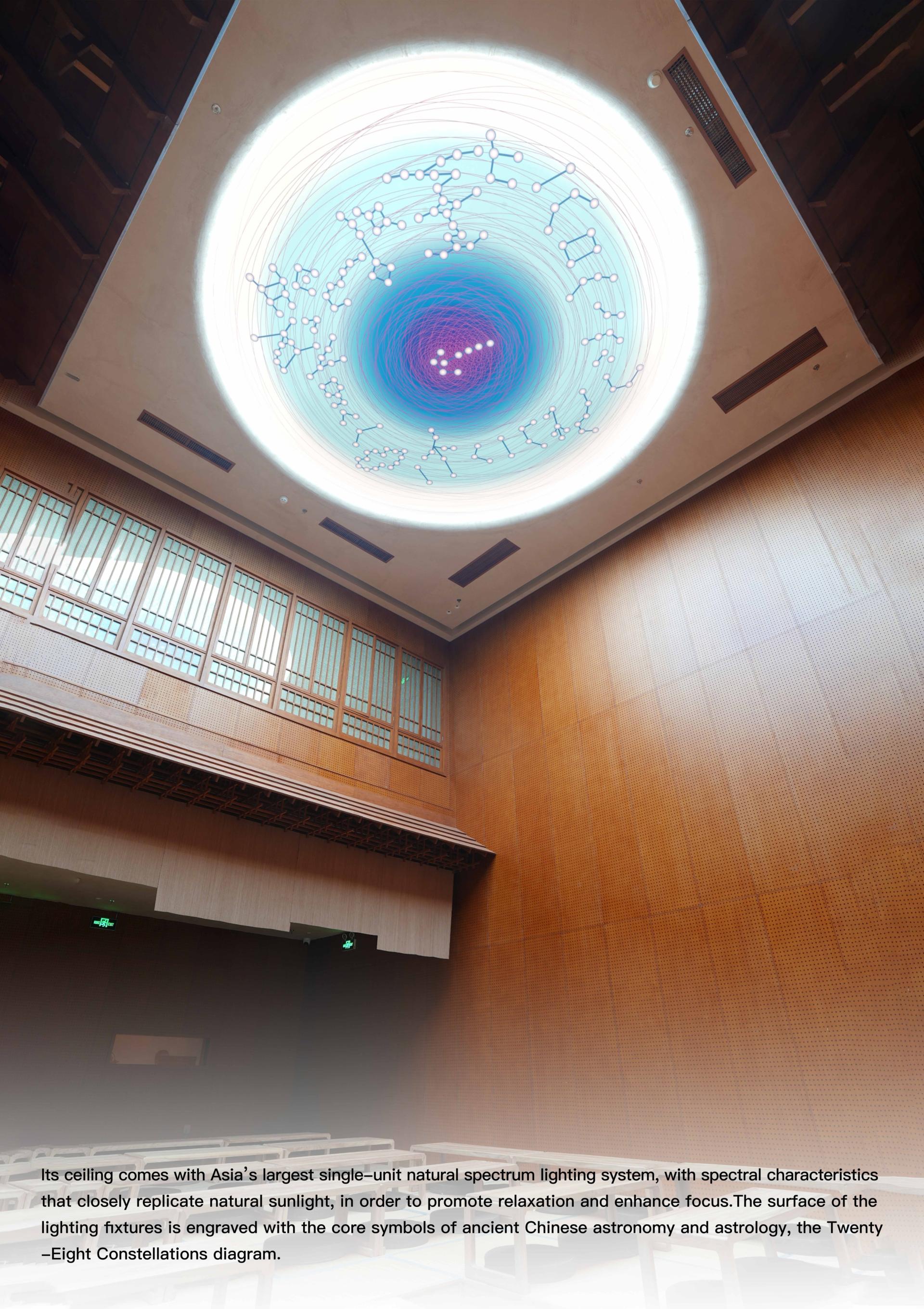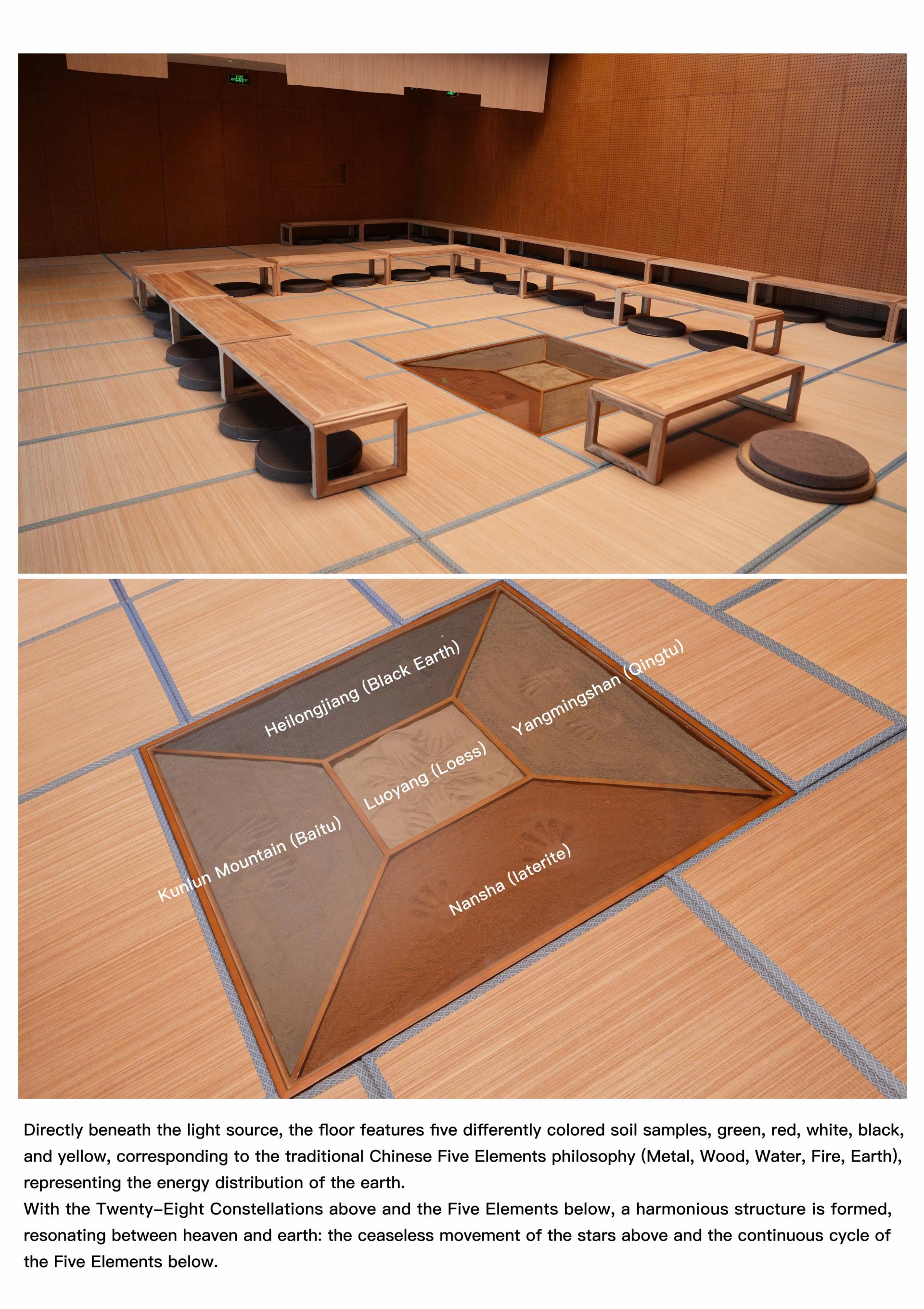 The core of the space, the dojo, features Asia’s largest single-unit natural spectrum lighting system, inscribed with the Twenty-Eight Constellations diagram. Directly beneath the light source, soil samples in five colors, green, red, white, black, and yellow, corresponding to the Five Elements philosophy (metal, wood, water, fire, earth) are displayed, symbolizing the energy distribution of the earth.