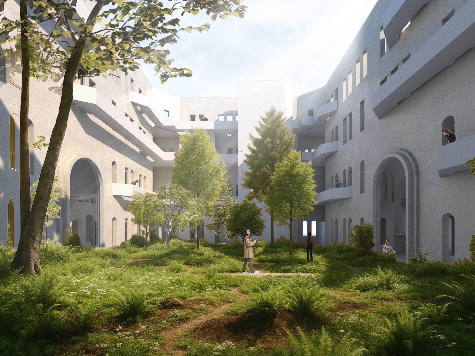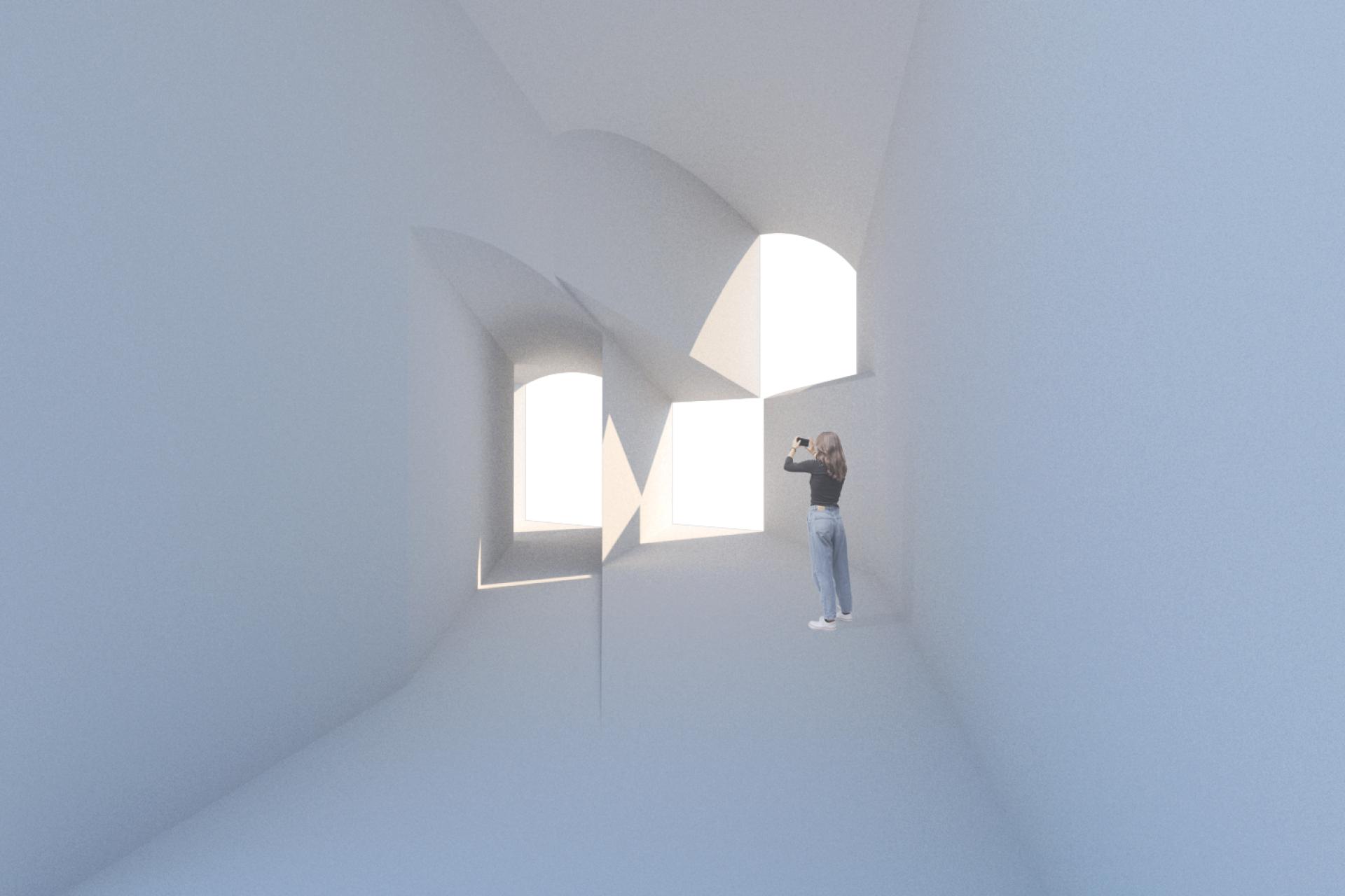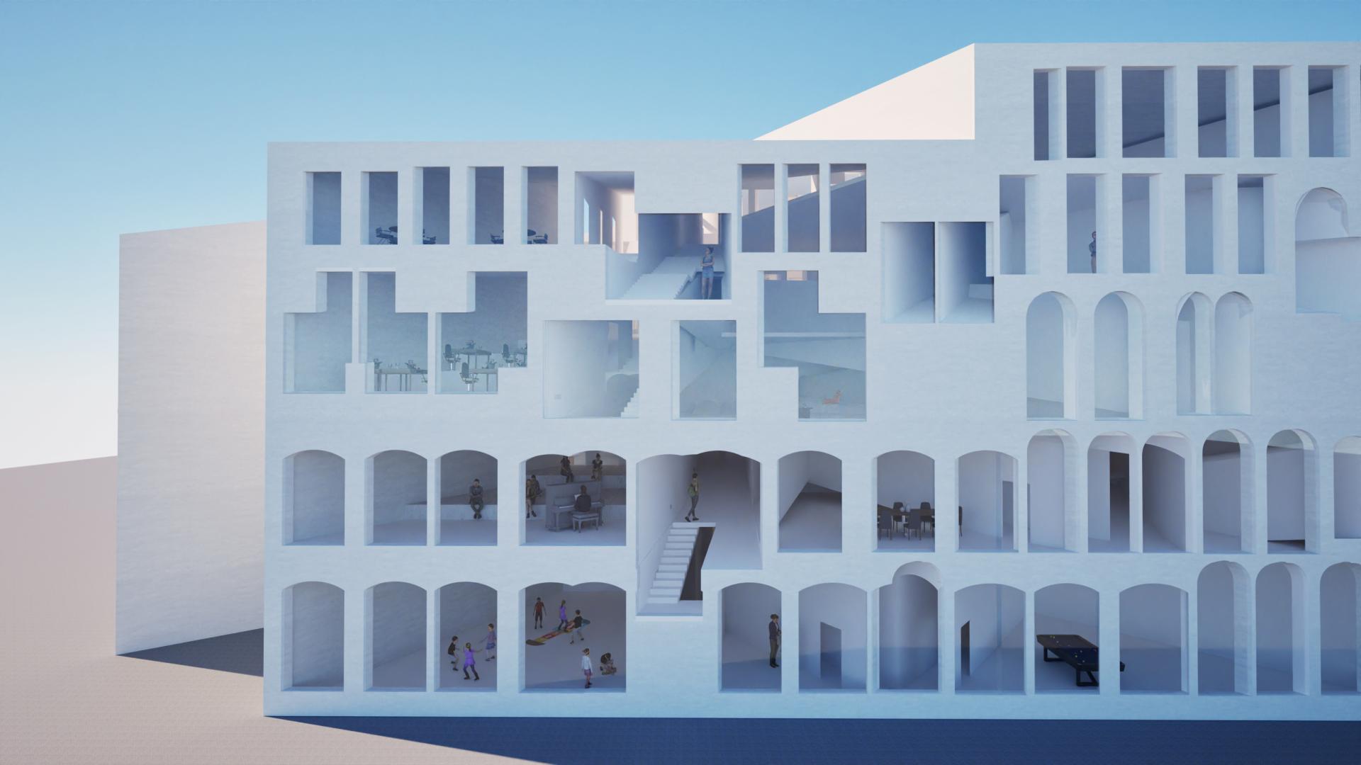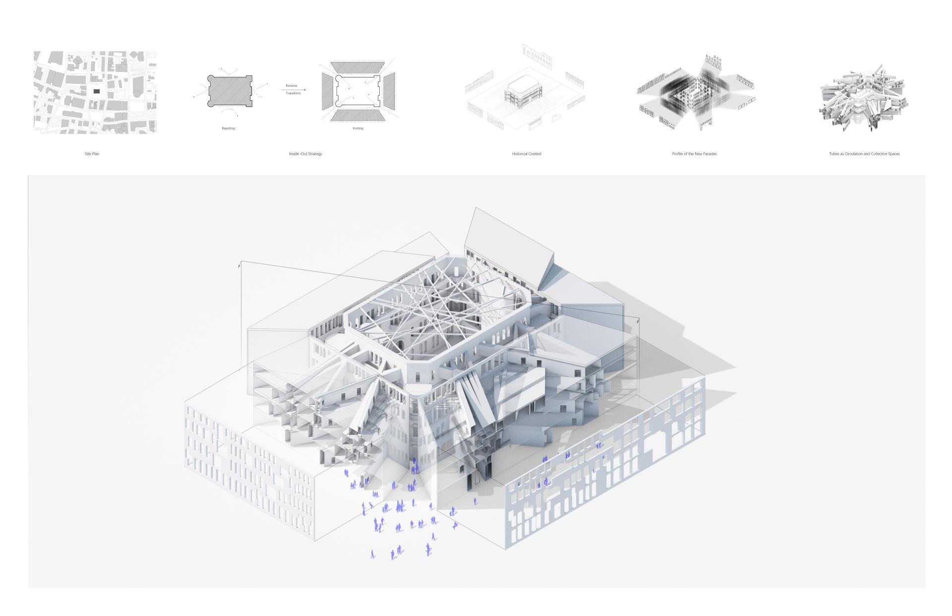 To create a façade that reflects both the original building and its urban surroundings, the design maps the windows of adjacent buildings and the old city hall, connecting them with lines that intersect the boundary of the new volume. These intersections generate hybridized window forms that echo the historical context while forming a new architectural language. Many of these connecting lines materialize as "tubes", structural and spatial elements that shape the building’s façade, circulation, and communal spaces.