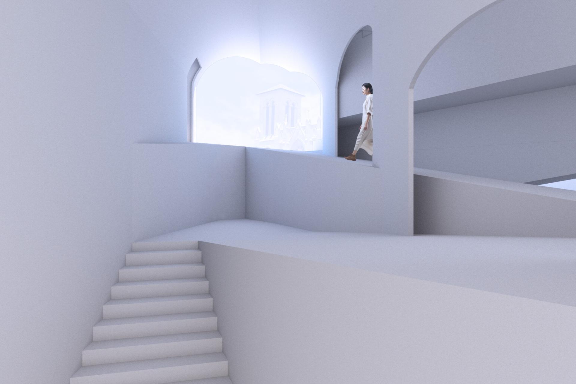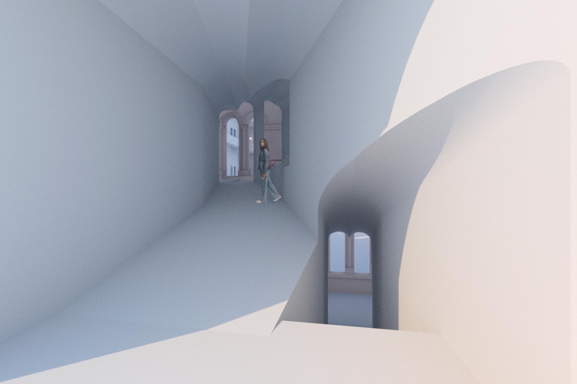 The resulting architecture invites transparency not only through materiality but through spatial experience. Visitors move along platforms beside the old façade, view overlapping historical windows, and navigate through double-height common areas formed by intersecting geometries. The vertical structure is integrated into the side walls and tubes, reinforcing the idea of continuity between old and new.