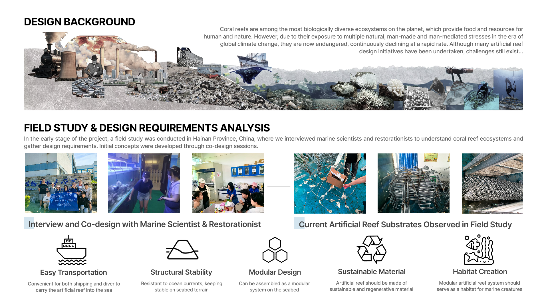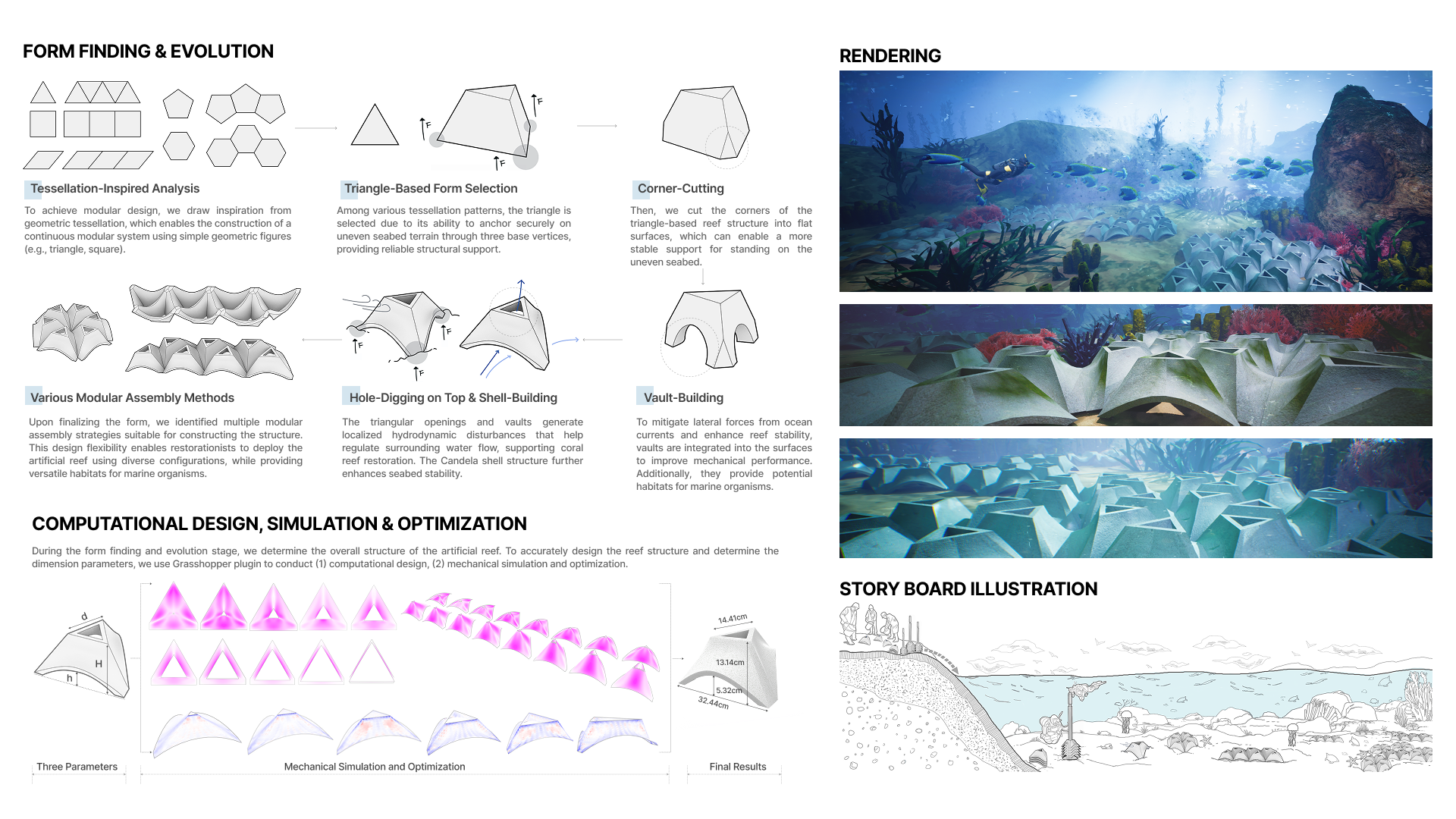 We conducted a field study through interviewing marine scientists, while observing existing artificial reef structures to define the design requirements: (1) easy transportation, (2) structural stability, (3) modular design, (4) sustainable material, and (5) habitat creation. And the Geometric Mosaic patterns provide us with crucial design inspirations because of its ingenious spatial division and tight interlocking features.The modules feature a Candela shell vault design that disperses oceanic impact forces while providing topological interlocking, making them resilient against strong currents. Using computational tools such as Grasshopper, the design team optimized key structural parameters (vault height, overall height, and triangle edge lengths) to balance fluid dynamics and ecological integration.