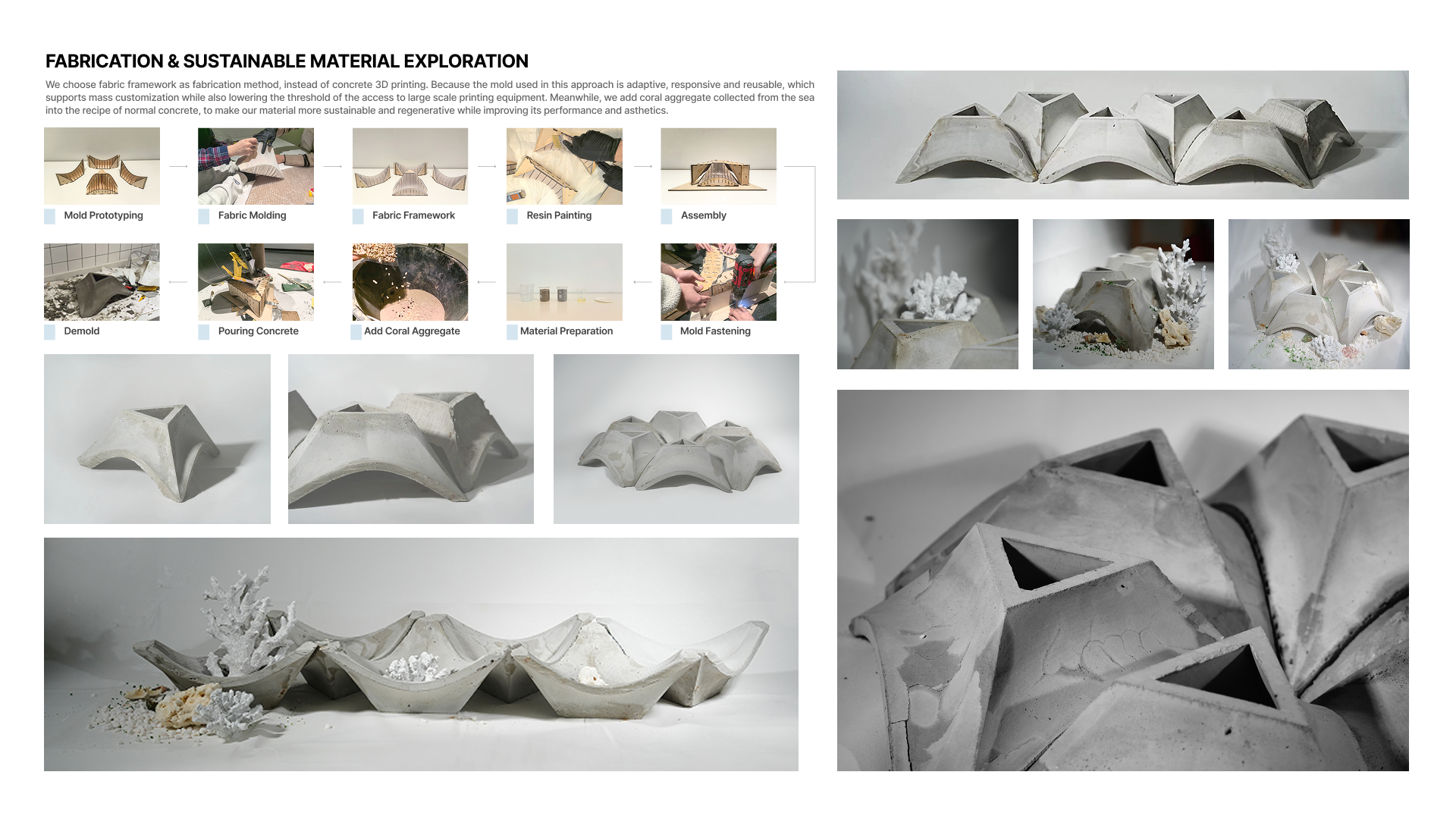 Technologically, ReefNexus leverages a sustainable fabrication strategy using fabric-based concrete casting, bypassing the energy-intensive and equipment-heavy 3D printing methods. Coral aggregates collected from marine environments are integrated into the concrete mixture, enhancing both biological attachment and material compressive strength. These bio-receptive surfaces accelerate biofilm formation and calcification, ultimately enabling the reef to become a self-sustaining ecosystem that boosts marine biodiversity.