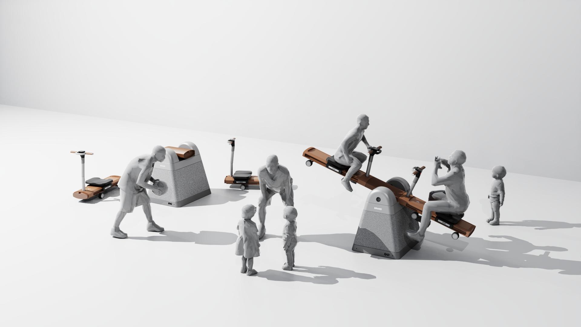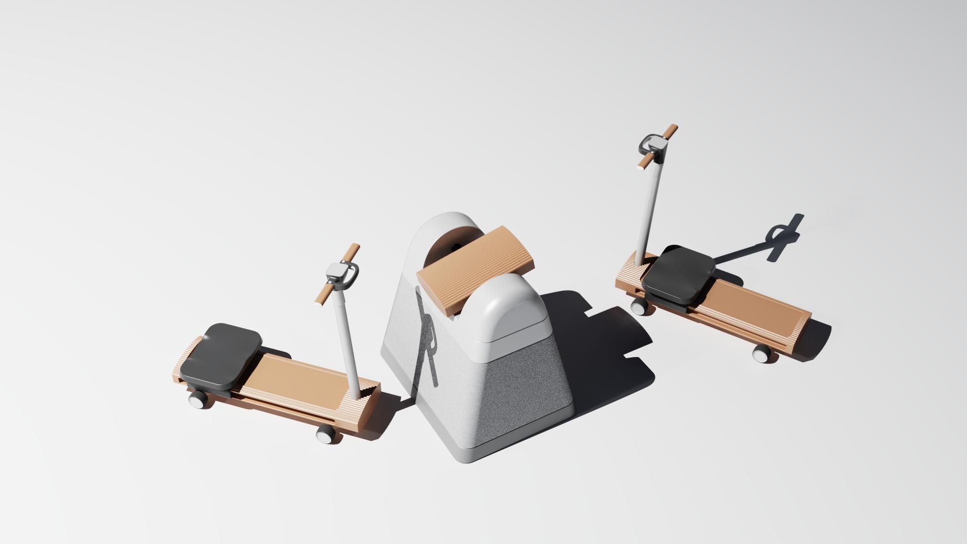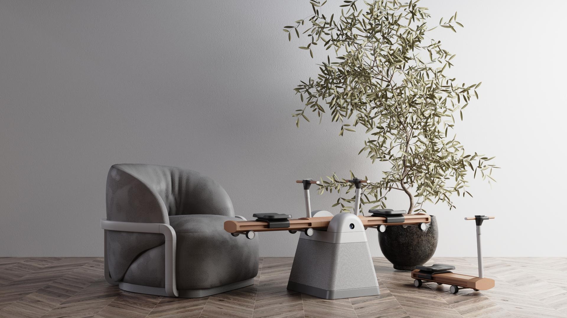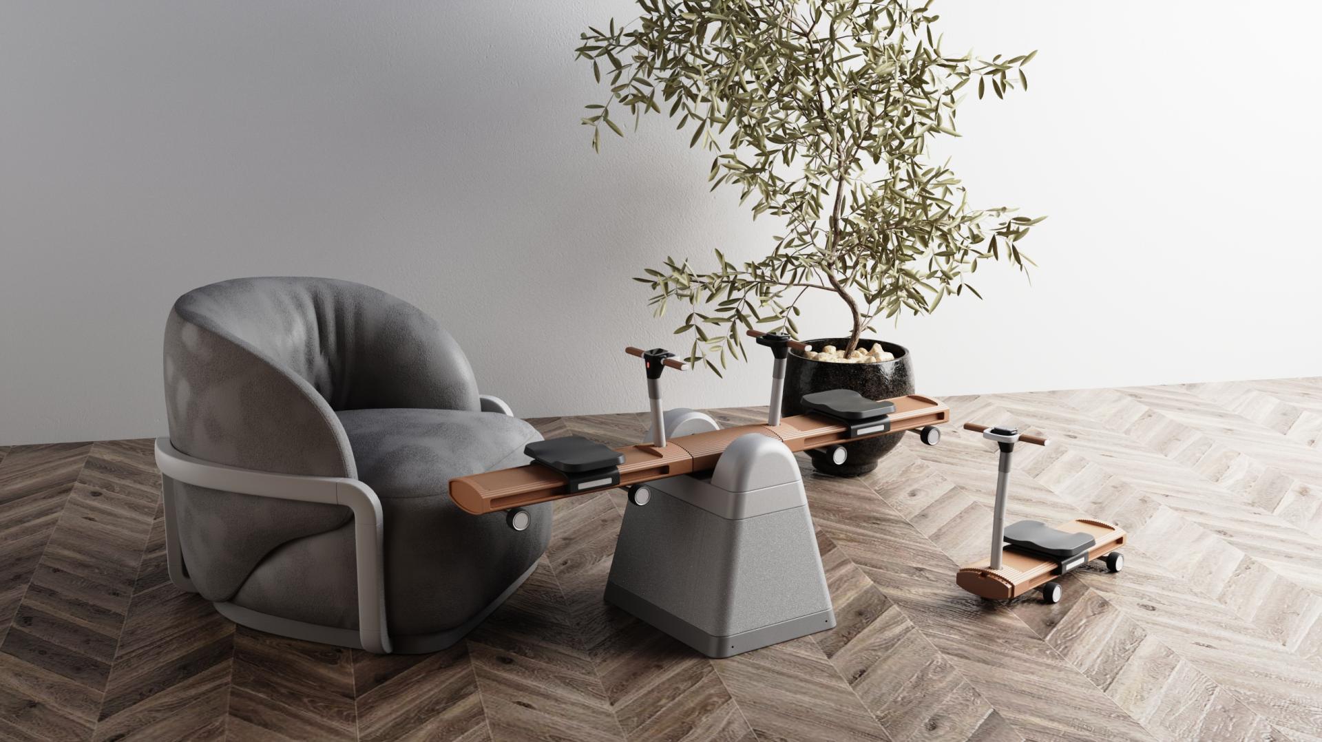 The indoor intelligent seesaw design is combined with the scooter to integrate the interactive elements of the game. The seesaw seat can be disassembled according to the needs of the child and converted into a scooter, providing two different ways for the child to play. One side of the seesaw is equipped with a projection camera, which can project the game picture onto the wall, and children can move up and down the seesaw seat to interact according to the game tasks on the projection. The product is designed with easy storage in mind to facilitate indoor storage.