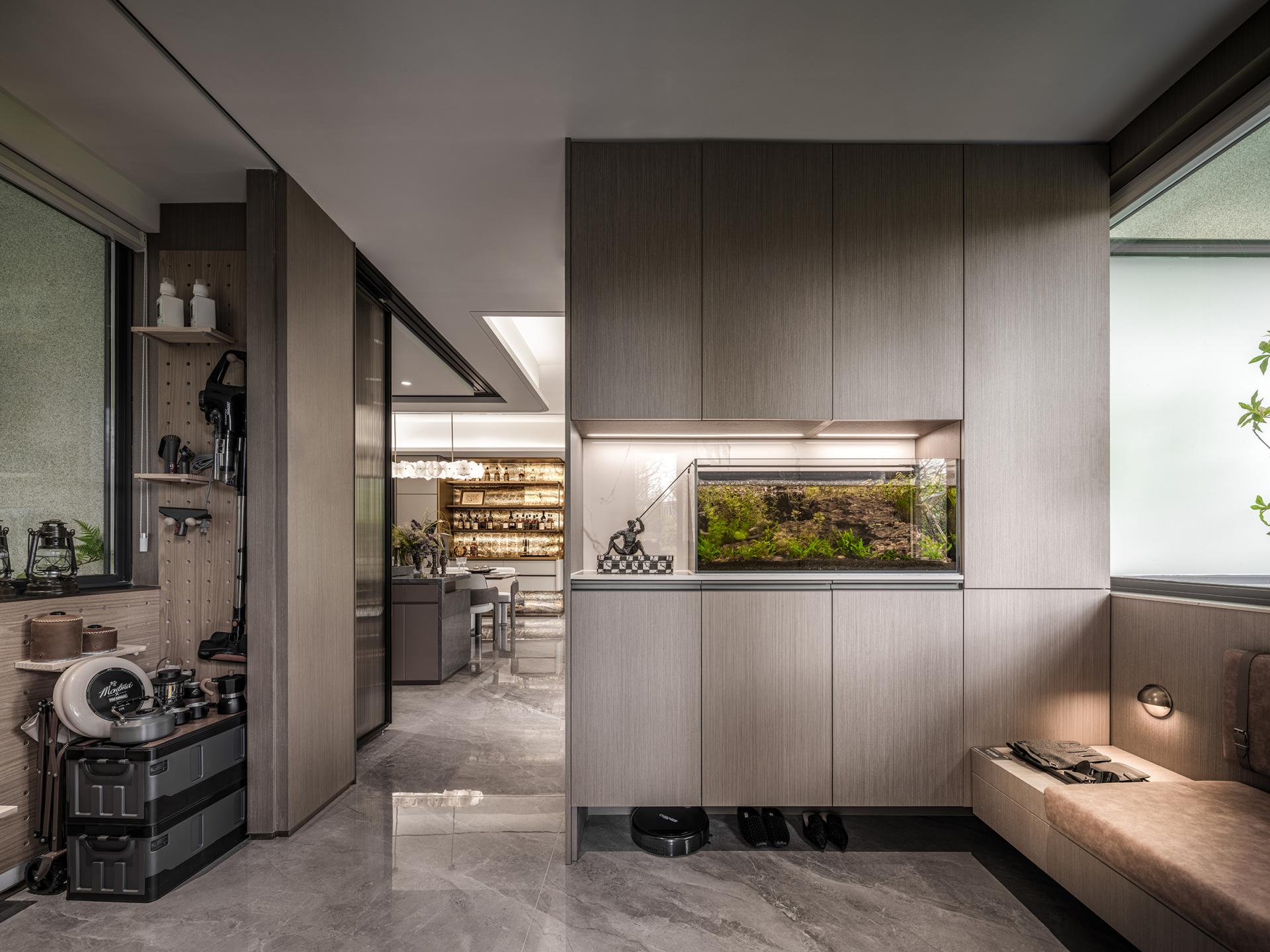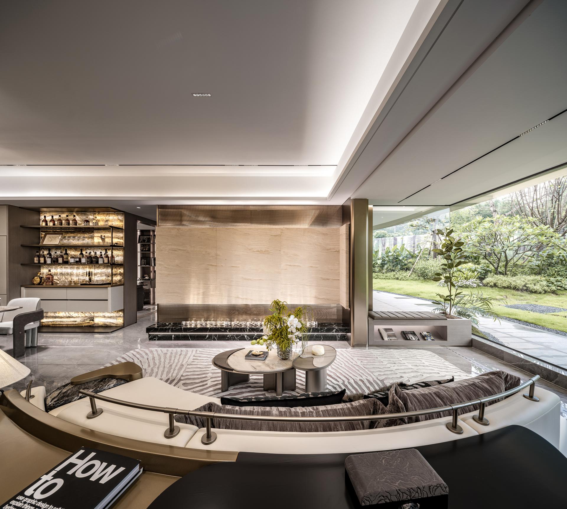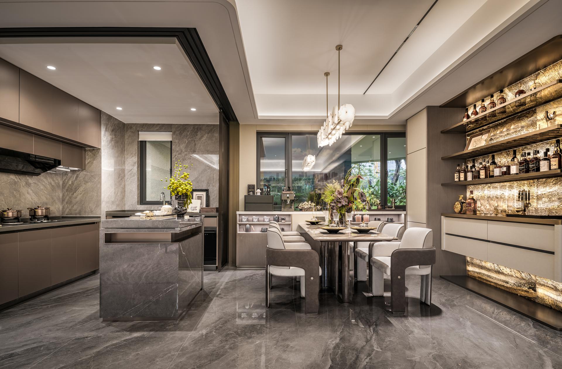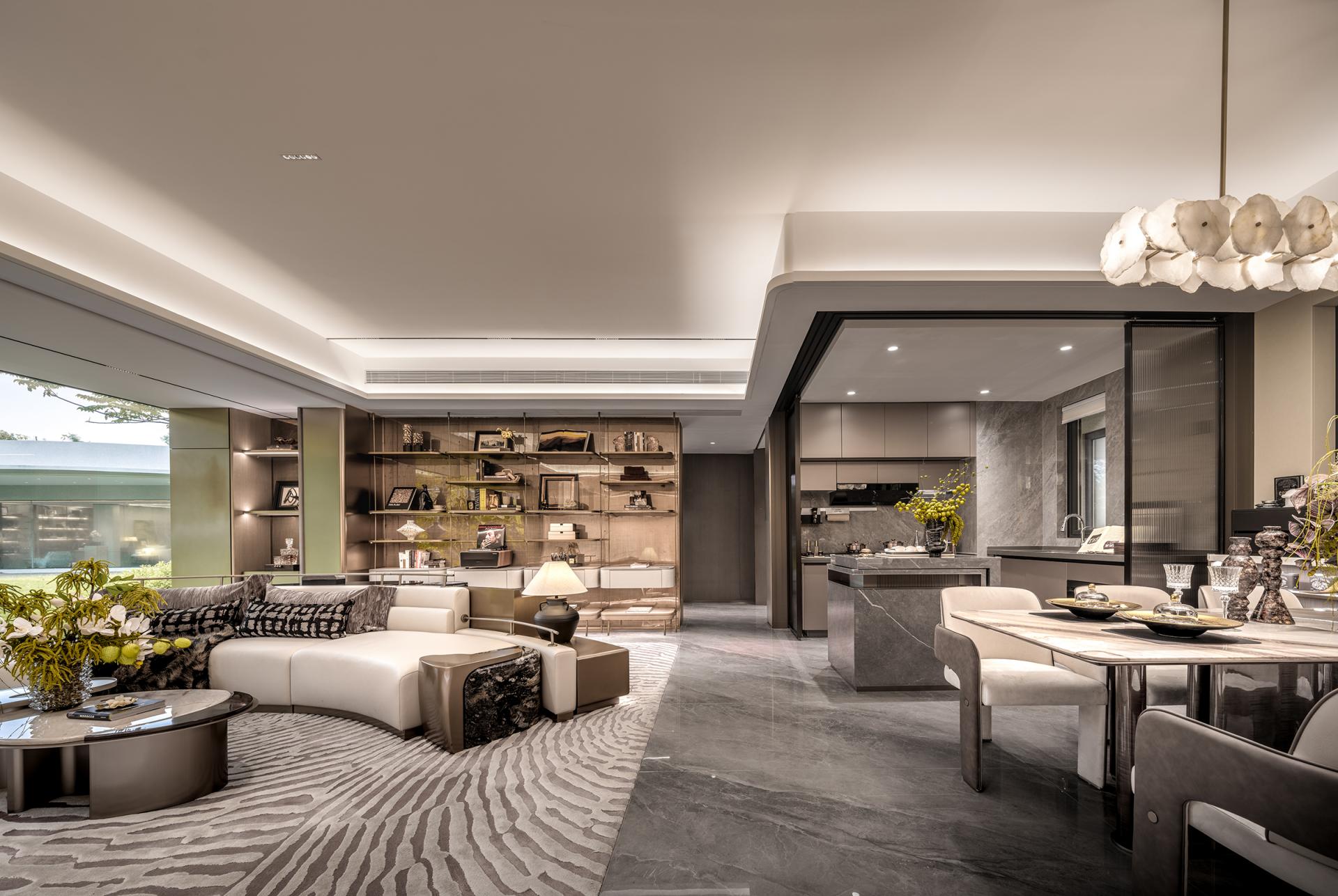 Innovations: The design transcends traditional spatial boundaries and functional limitations: removing balcony sliding doors creates an unobstructed flow between the living room and the outdoors, allowing natural light and shadow to permeate freely. Dynamic water ripple lights embedded in the platform channel the shimmer of the Pearl River indoors, redefining the soul of the space through light. The dining room breaks free from singular functionality, merging the warmth of Chinese home-cooking, the ease of Western-style living, and the ritual of displaying collections, embodying the multifaceted possibilities of grand residence living. Meanwhile, the entryway's storage is reimagined through the "philosophy of concealment and revelation," reconciling practicality and aesthetics, and innovatively fusing function with ambiance in every detail.