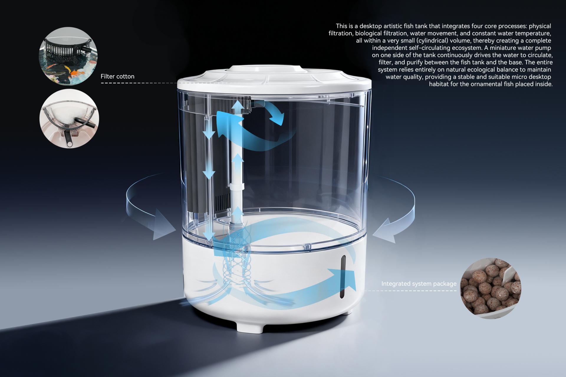 This Artistic Desktop Ecosystem Aquarium integrates physical filtration, biological filtration, water circulation, and constant temperature control within a compact cylindrical form, creating a complete, self-sustaining ecosystem. It ensures fish thrive healthily even without frequent water changes.
