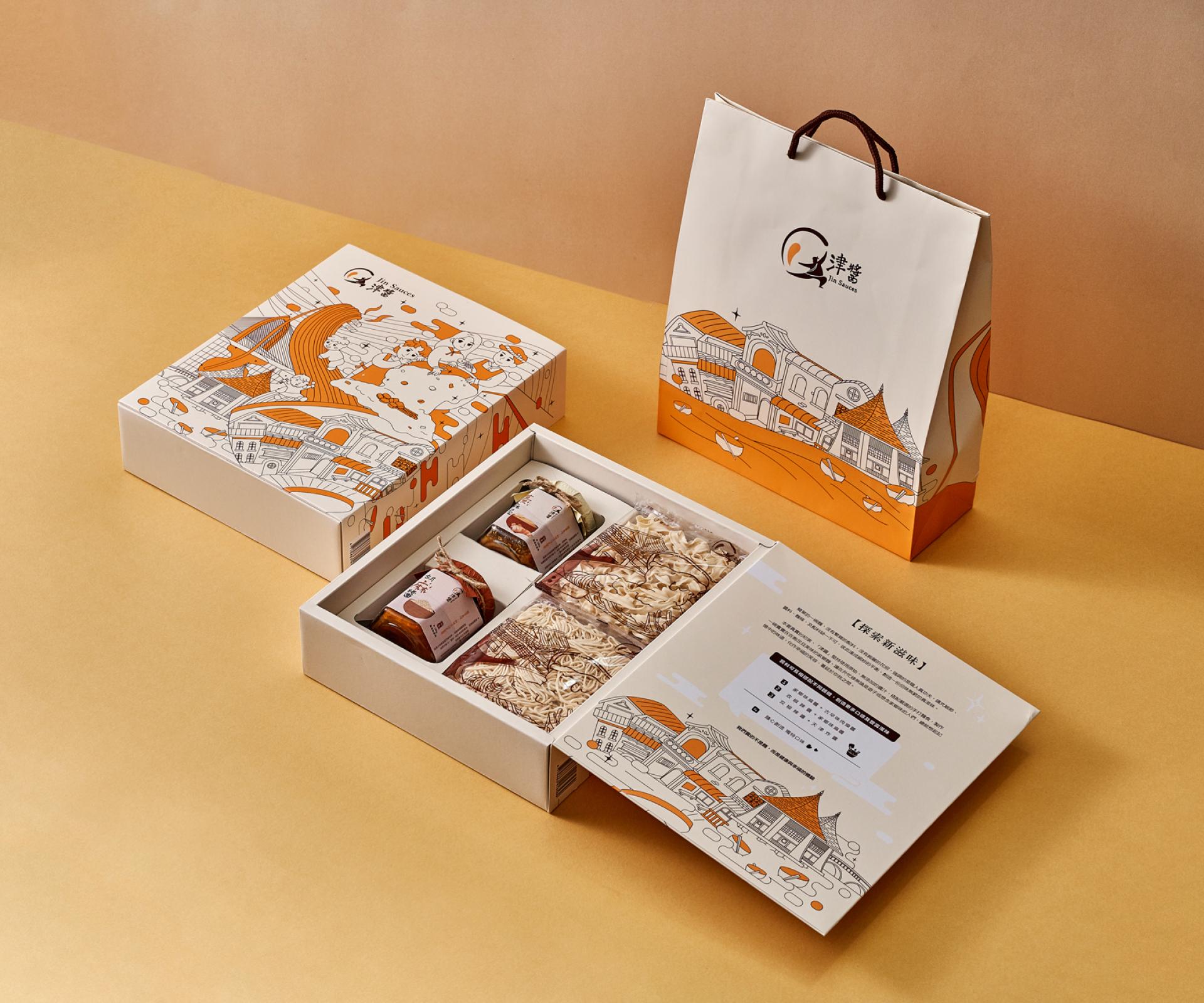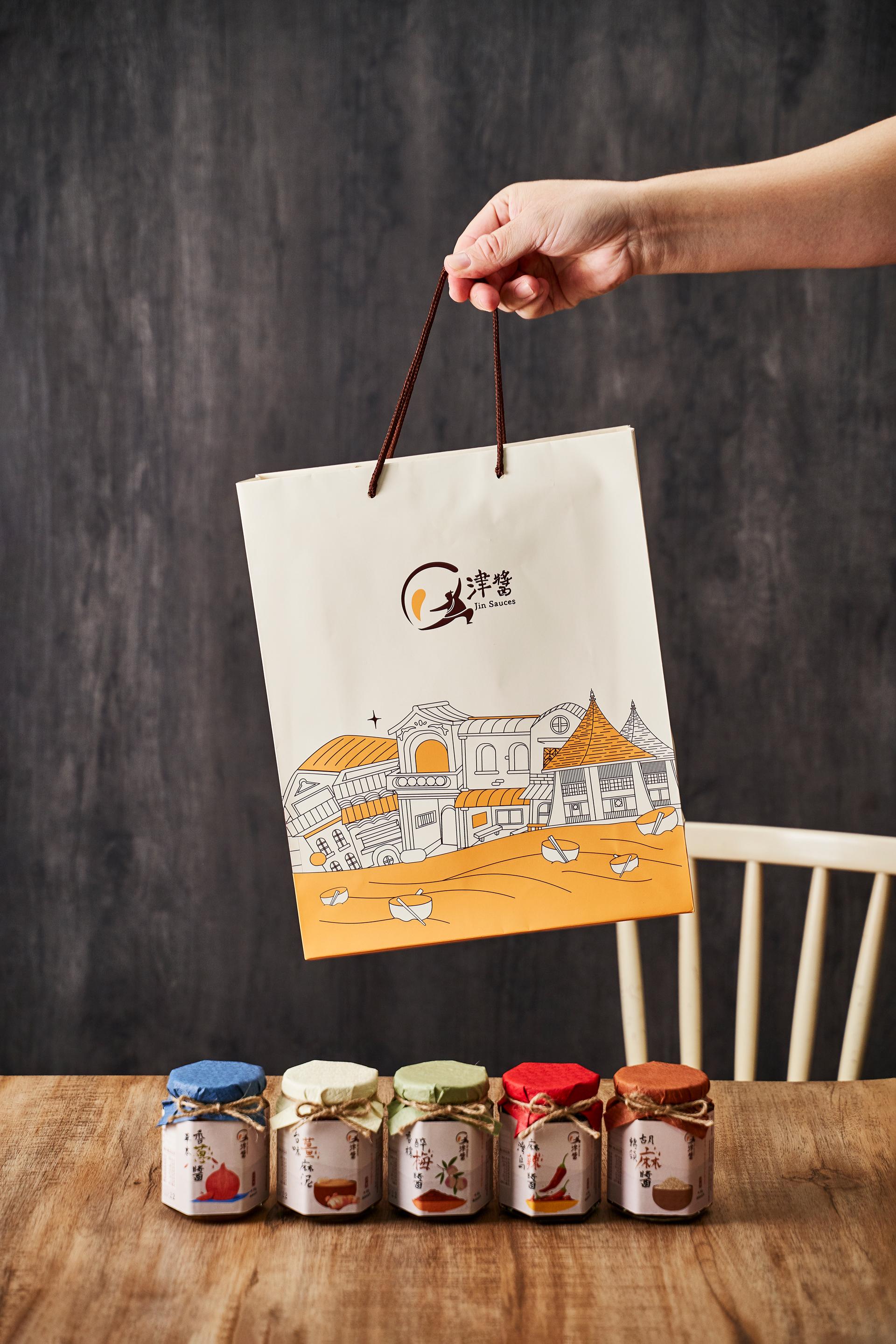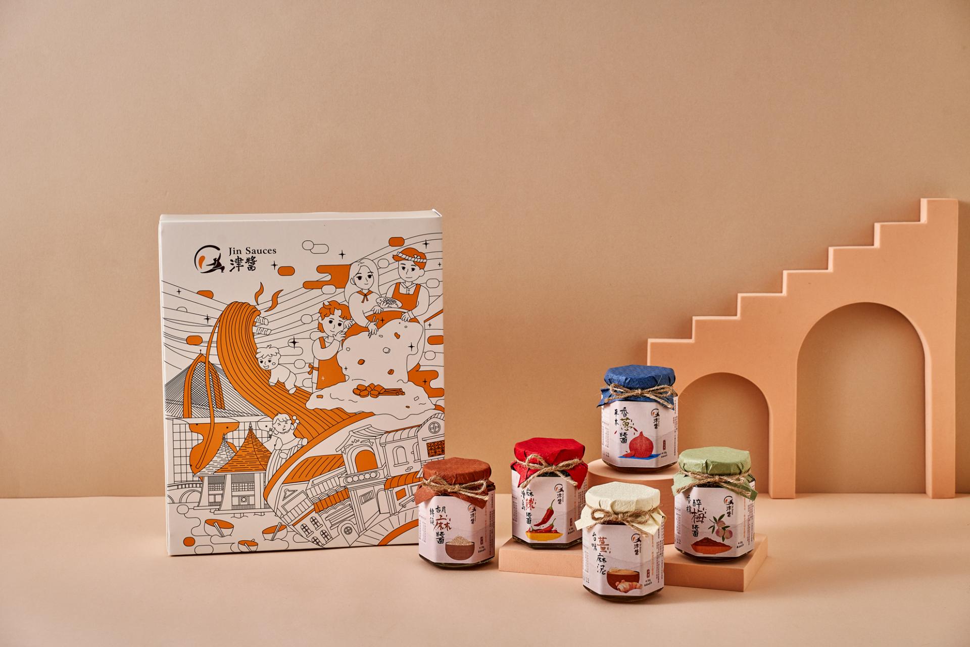 The “Jin Sauce” gift box starts from local farm produce and blends illustration with food culture to capture scenes of rural life and traditional markets. The packaging design brings together Taiwanese ingredients, emotions, and memories through colorful visuals. The colors reflect the natural tones of farm products, paired with hand-drawn buildings and characters to create a “sauce-flavored lifestyle magazine” that can be read visually. Sustainable materials like recyclable glass jars, twine, and recycled paper are used throughout the packaging, including the outer bag and info card. From farm to table, it connects sight, smell, and taste to express the cultural aesthetics of Taiwanese flavor.