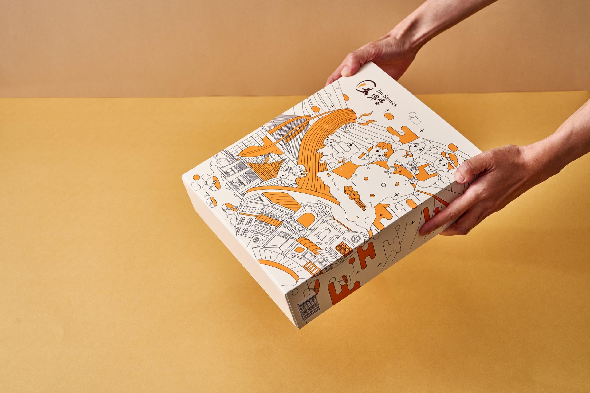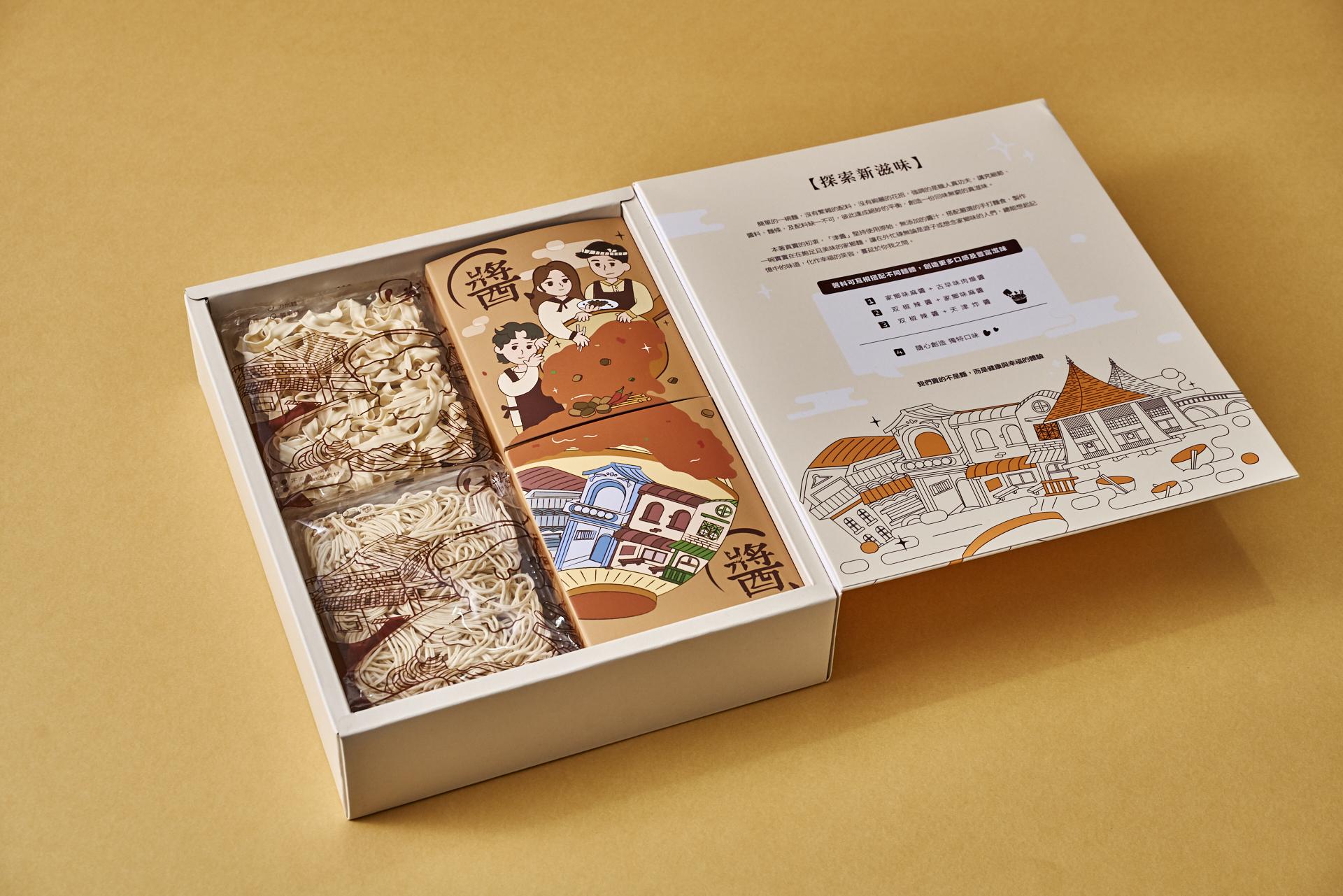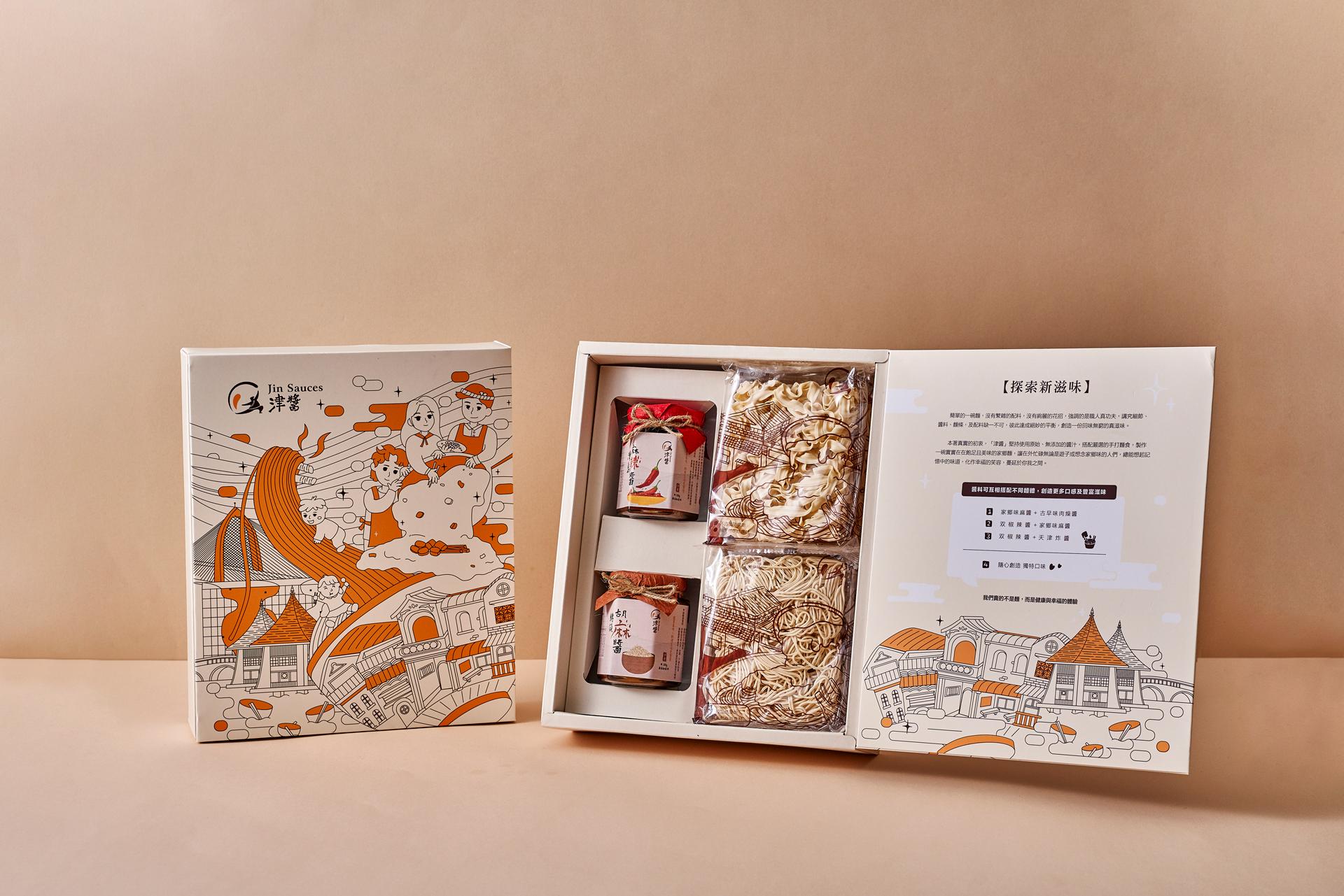 The “Jin Sauce” gift box starts from local farm produce and blends illustration with food culture to capture scenes of rural life and traditional markets. The packaging design brings together Taiwanese ingredients, emotions, and memories through colorful visuals. The colors reflect the natural tones of farm products, paired with hand-drawn buildings and characters to create a “sauce-flavored lifestyle magazine” that can be read visually. Sustainable materials like recyclable glass jars, twine, and recycled paper are used throughout the packaging, including the outer bag and info card. From farm to table, it connects sight, smell, and taste to express the cultural aesthetics of Taiwanese flavor.
