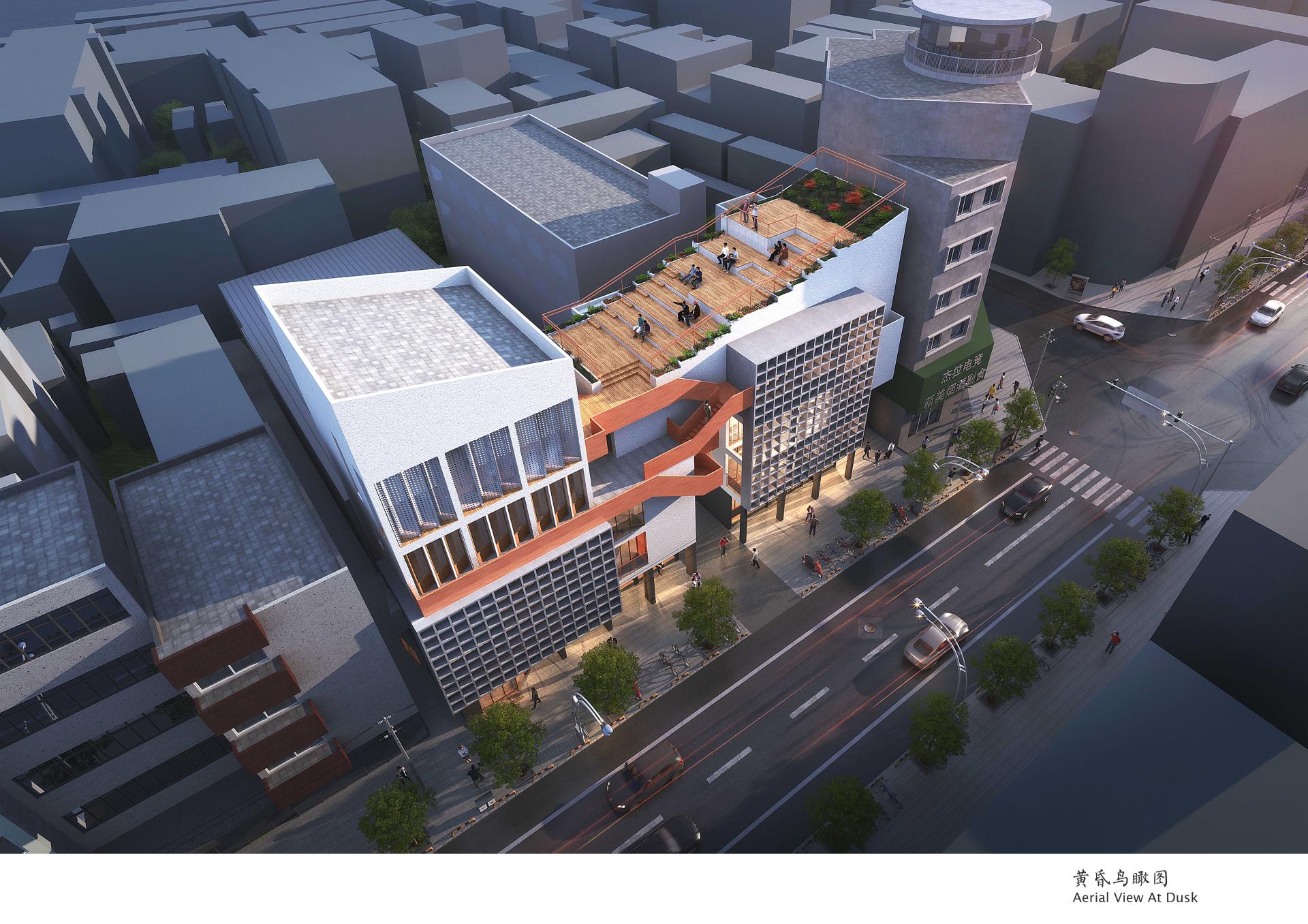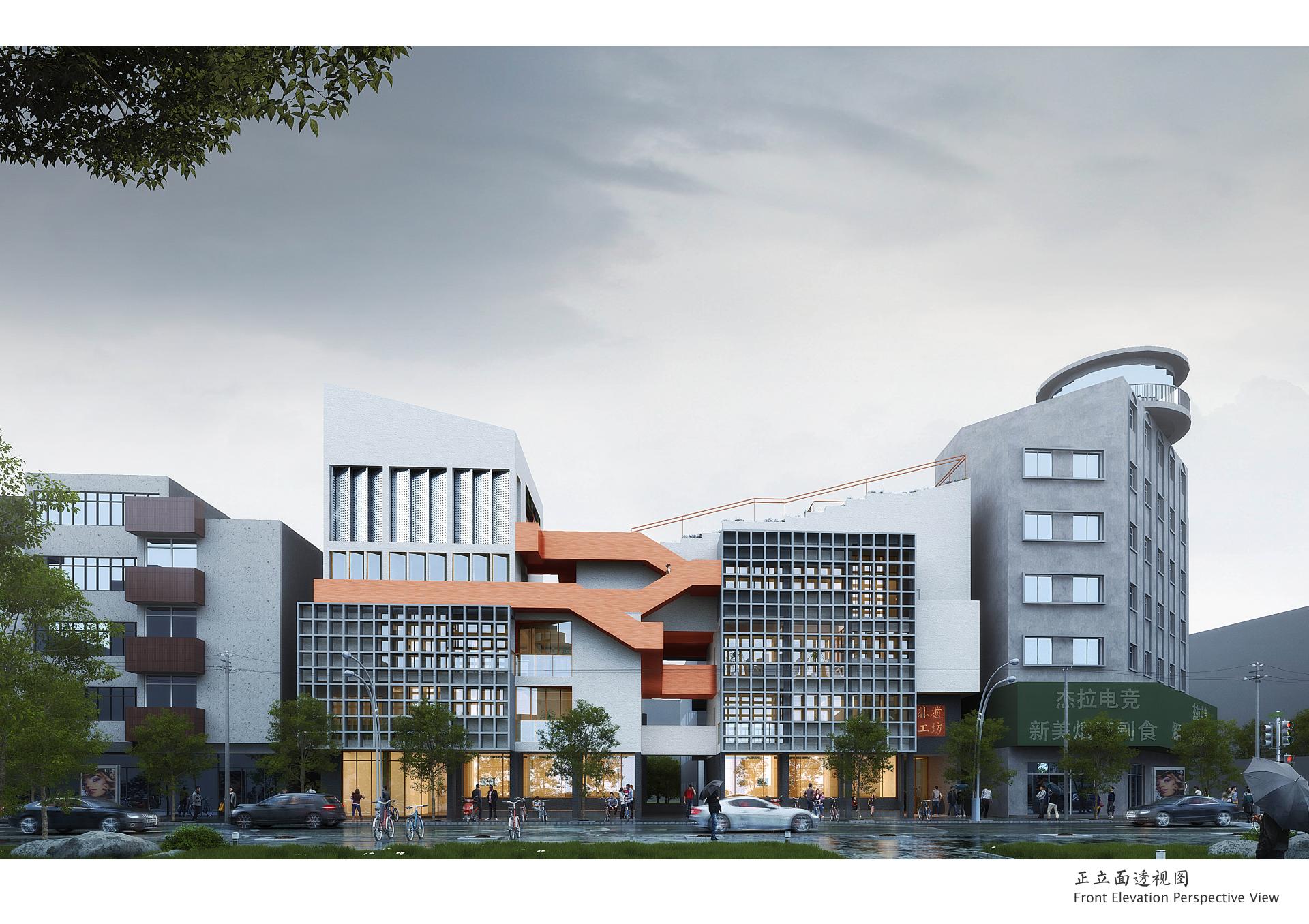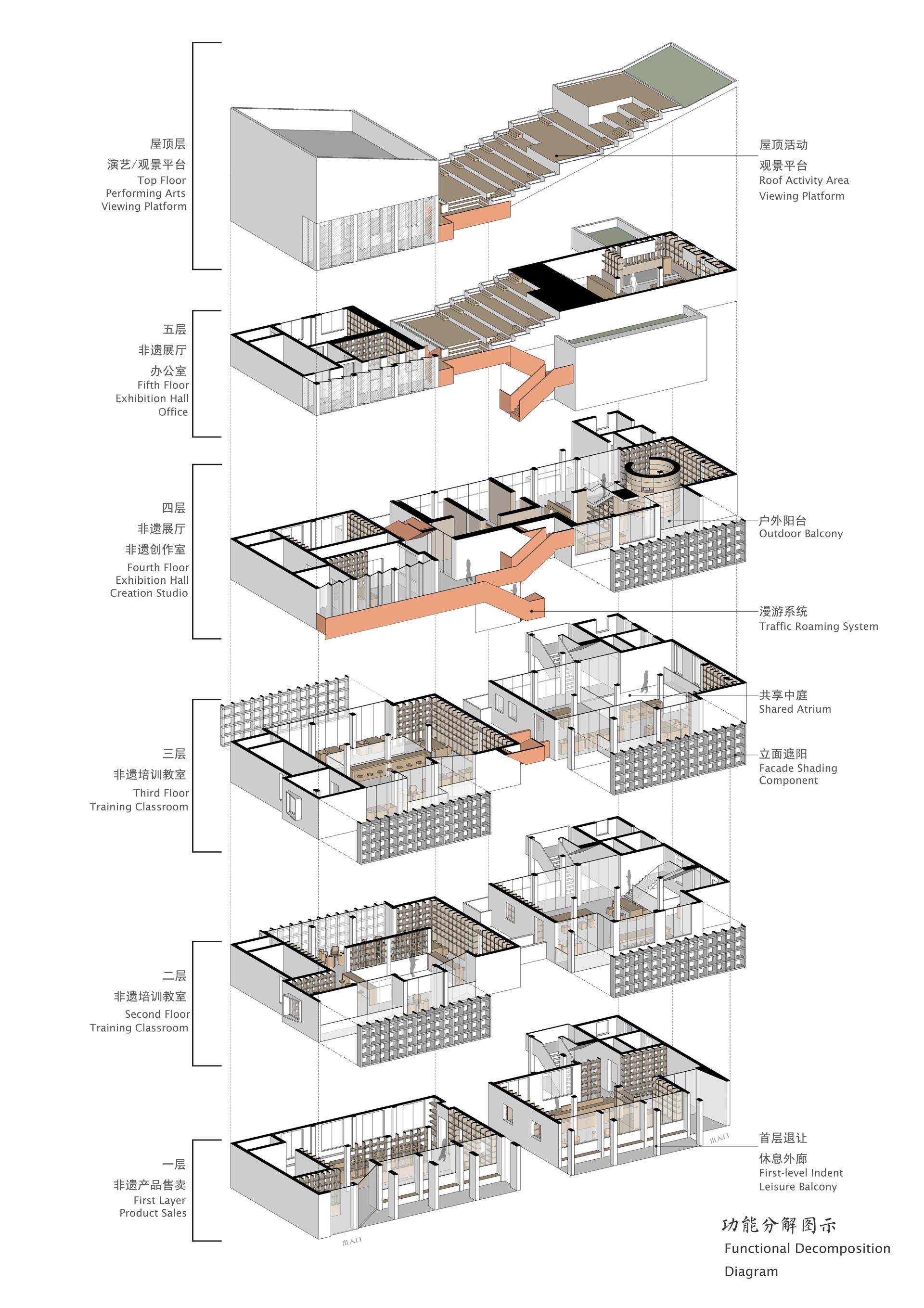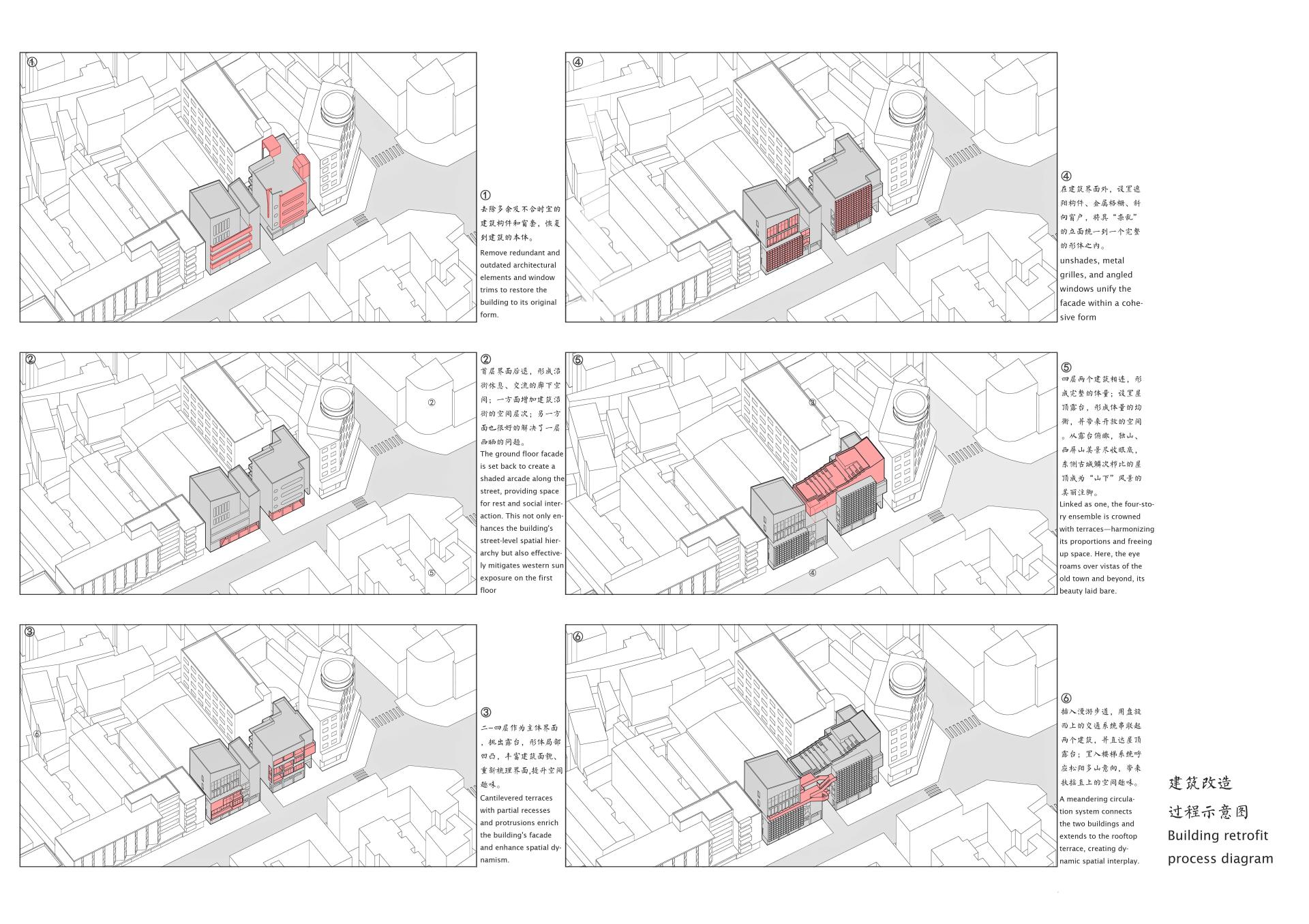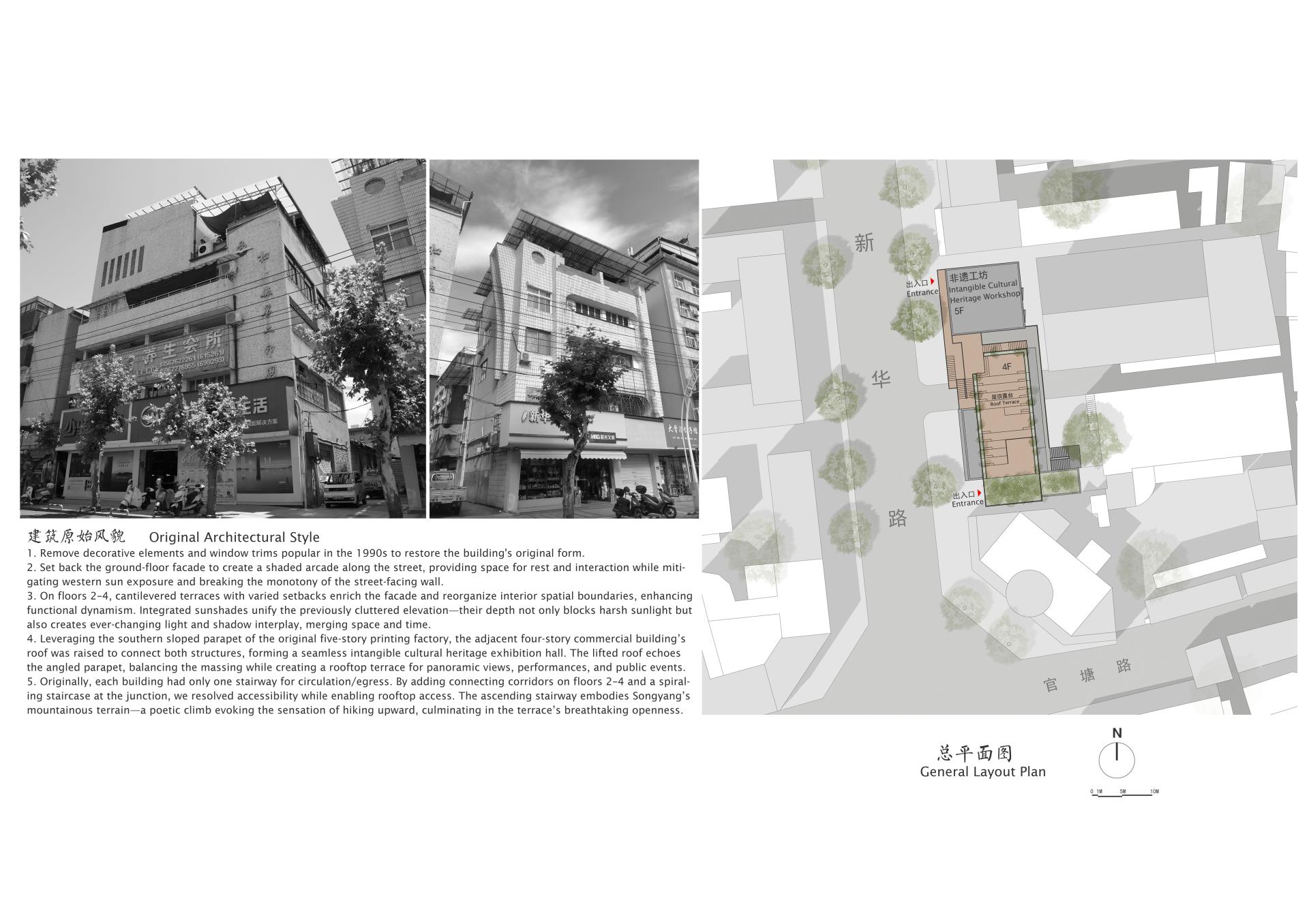 Spatial Re-Integration: The ground floor is set back to create a shaded public arcade; the original parapet slope is leveraged to elevate level 4 and bridge the two buildings, forming an intangible-heritage gallery and roof terrace that balance massing and enhance public life.