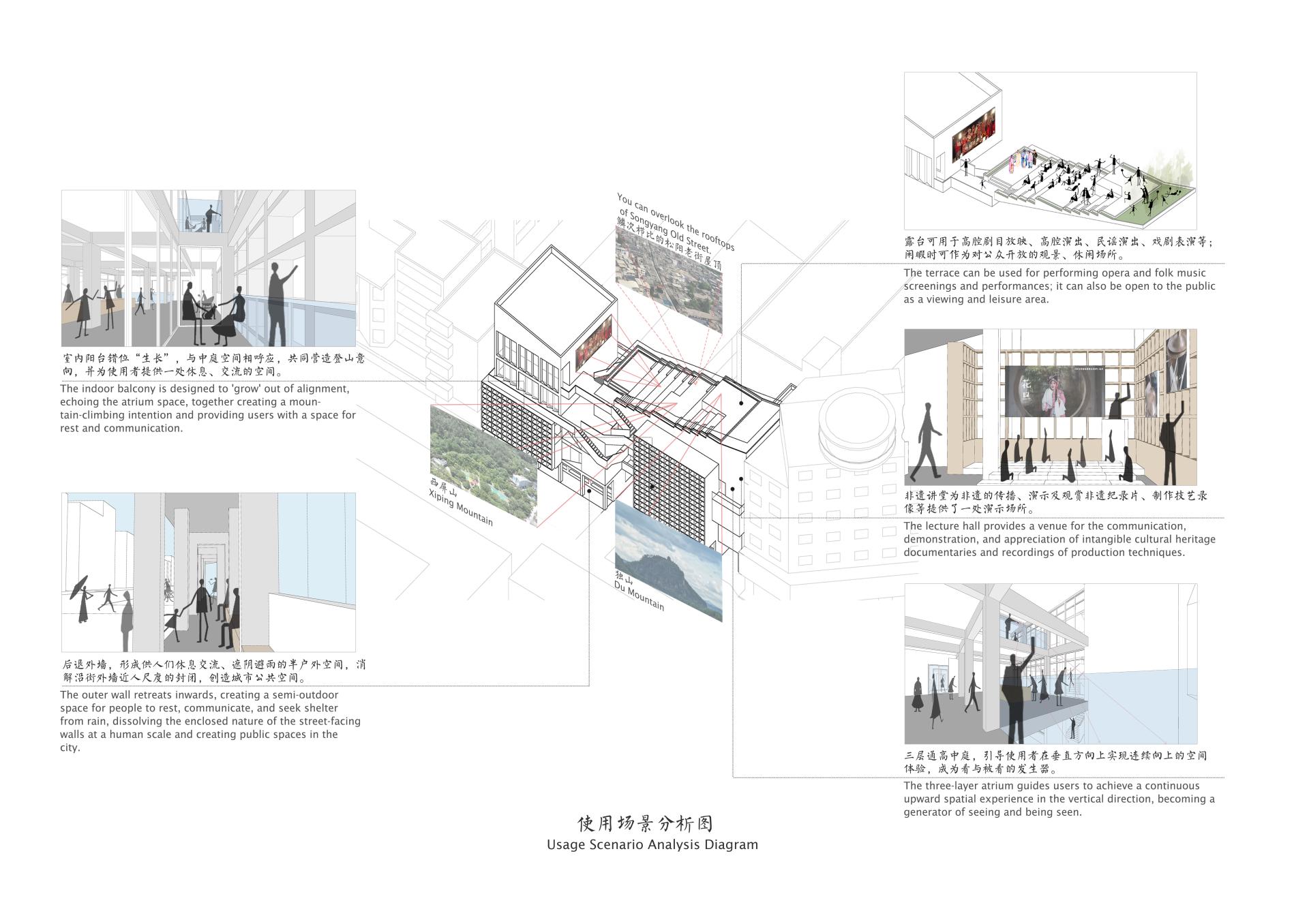 Circulation Upgrade: A new sky-bridge and sculptural spiral stair resolve egress and embody Songyang’s mountain silhouette, crafting a spiraling promenade culminating in panoramic views of the ancient city.