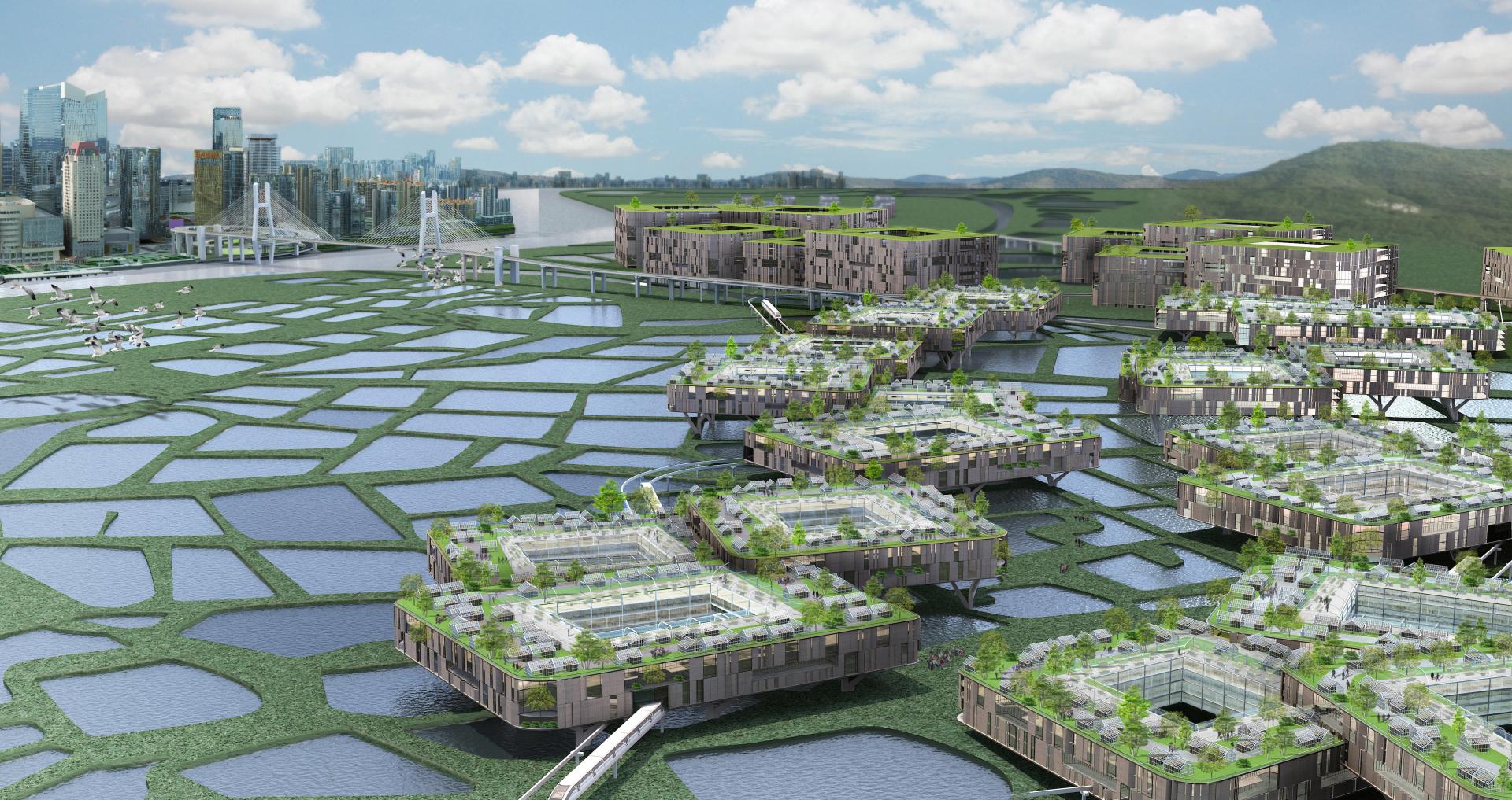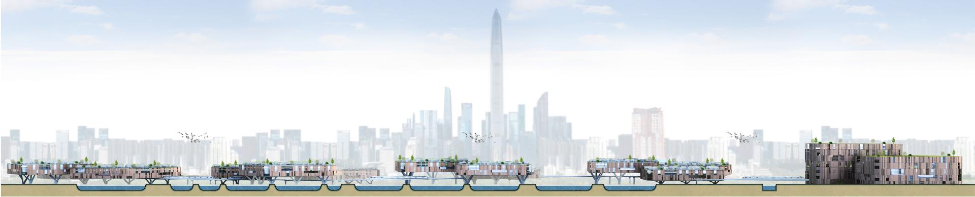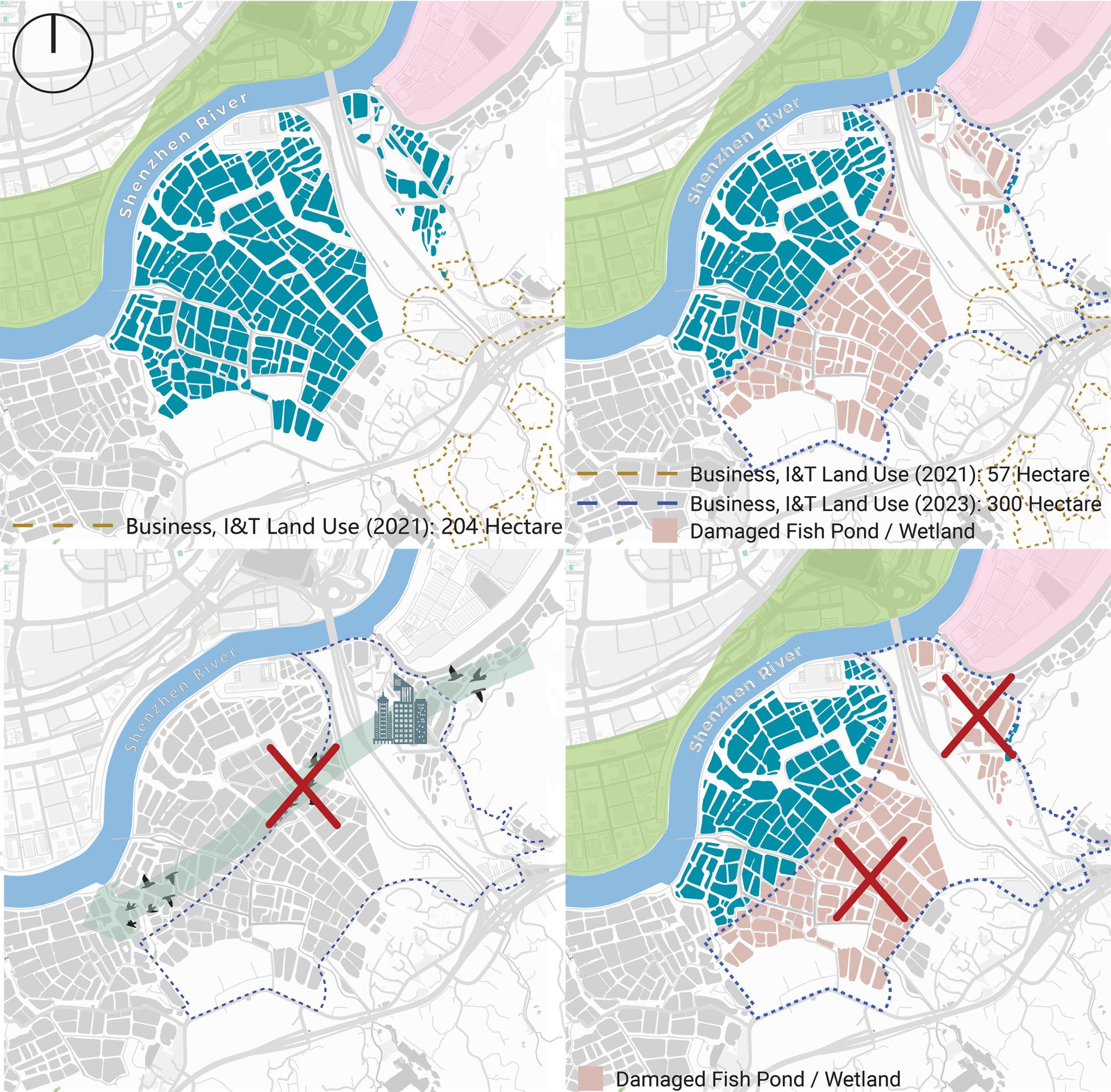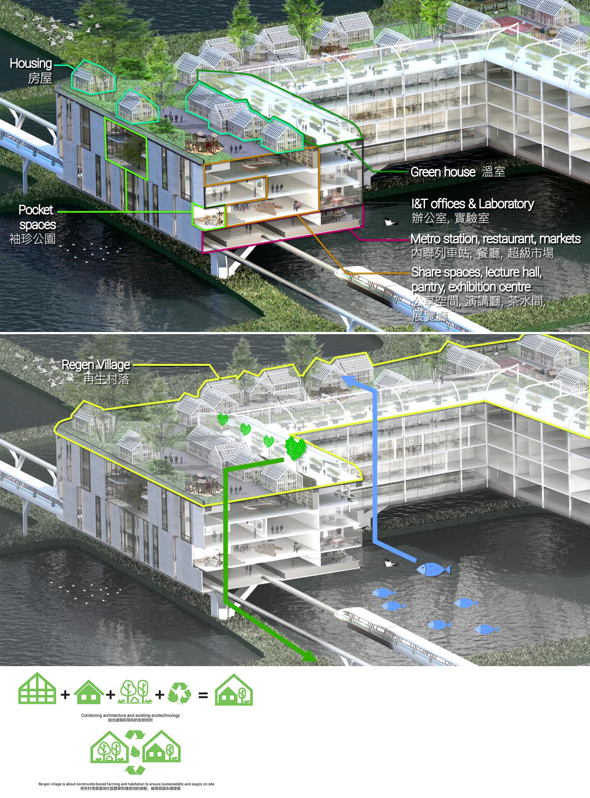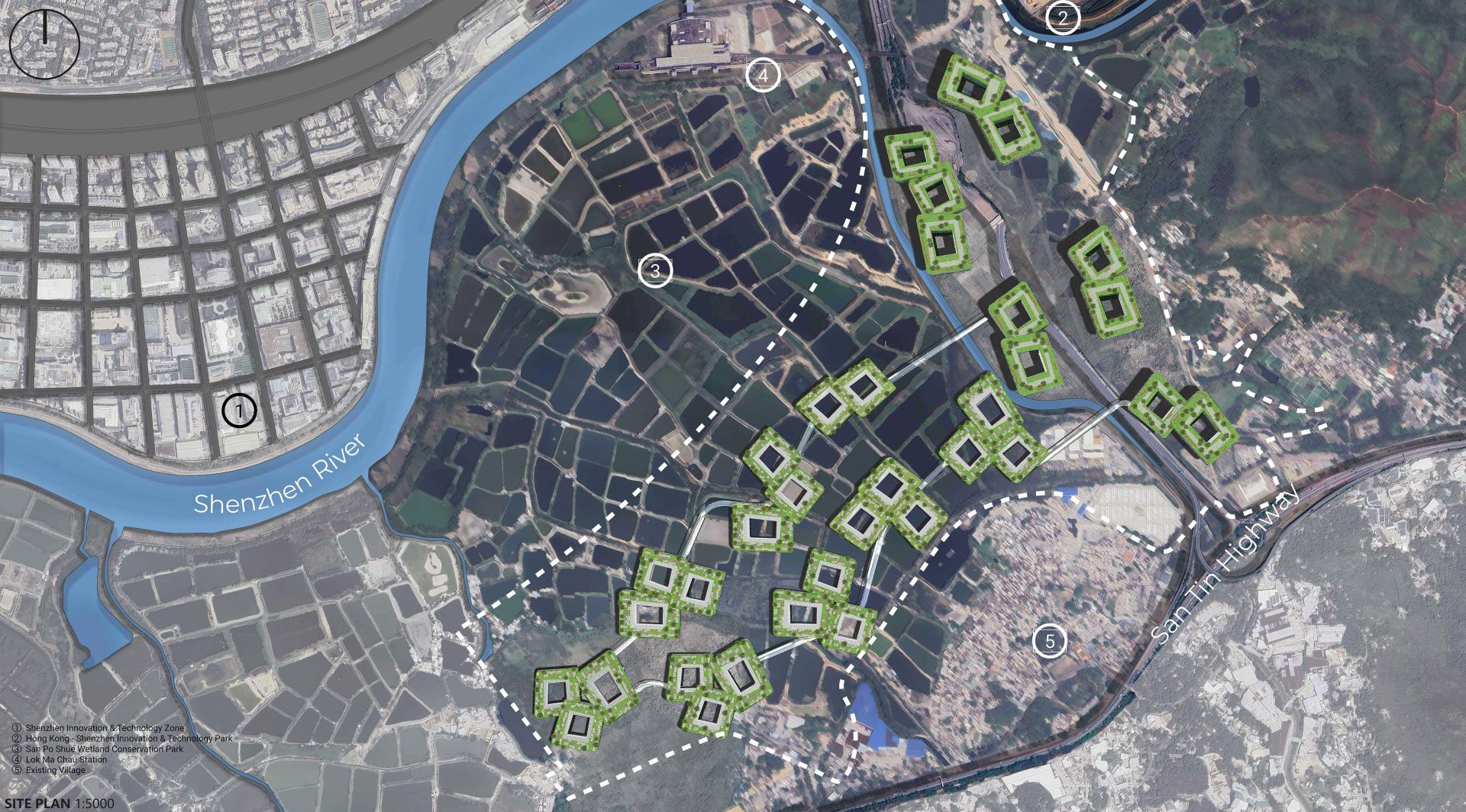 Hong Kong plans to further develop the rural land near the northern border to Shenzhen with an Urban Scheme encompassing 30,000 hectares of land. In one particular region, it plans to reclaim 116 hectare of existing fish ponds and agricultural land with high ecological value for a new “Innovation & Technology Zone”. In our Conceptual Urban Design, we explore alternative ways of new development in this region that contrasting dichotomies embodied :