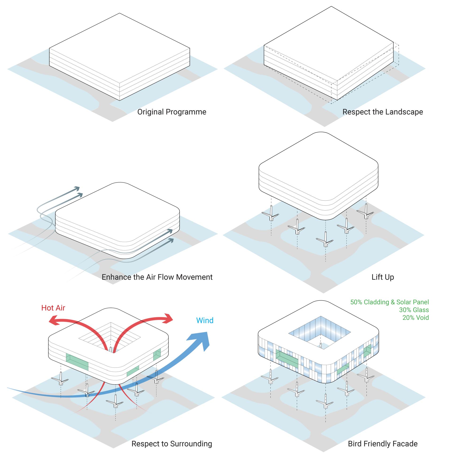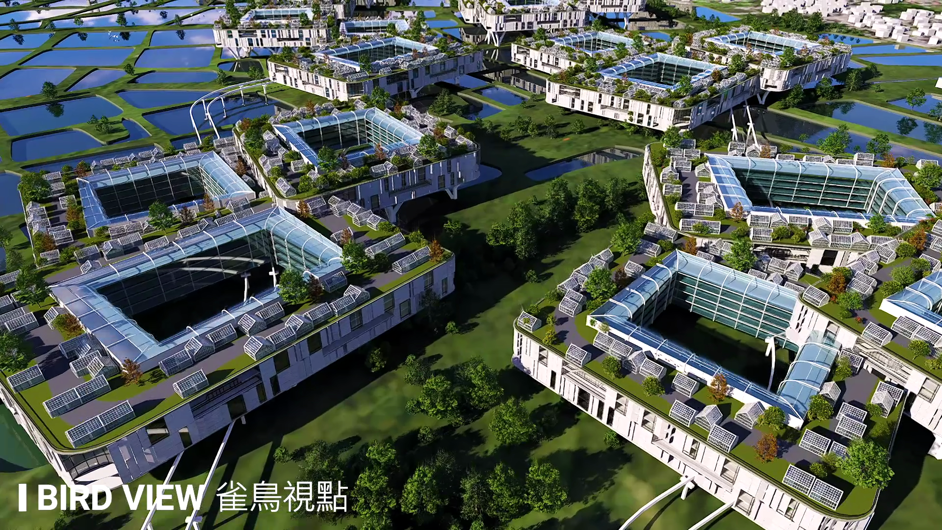 1. Rural VS urban harmony: By preserving the existing fish ponds and agricultural land, we aim to retain the existing villagers livelihood and reconnect to the adjacent Wetland. Simultaneously, the elevated courtyard buildings allow airflow beneath and natural light to permeate to the ponds and lands below. In harmony with the surrounding, the building shall be low-lying, and shaped similarly to the parcel of land below.