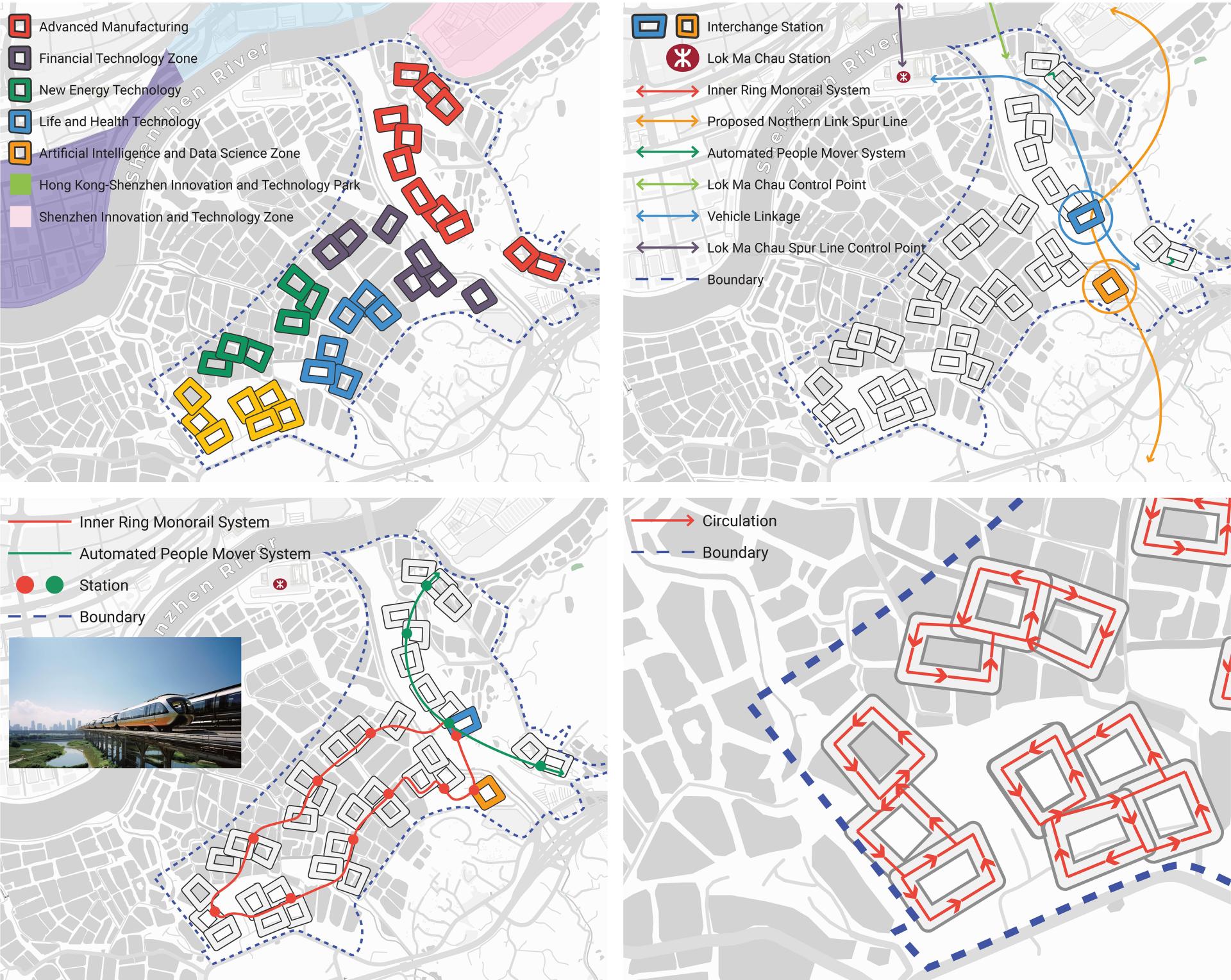 4. Integration and Differentiation of HongKong and Shenzhen: For internal circulation of clusters of I&T buildings, we proposed car-less, eco-friendly monorail system, and on-grade automated people movers. These internal circulation systems connect with the existing railway infrastructure to cross the border. By “TOUCHING THE EARTH LIGHTLY”, we aim to harmonize new development against existing agricultural fabric.