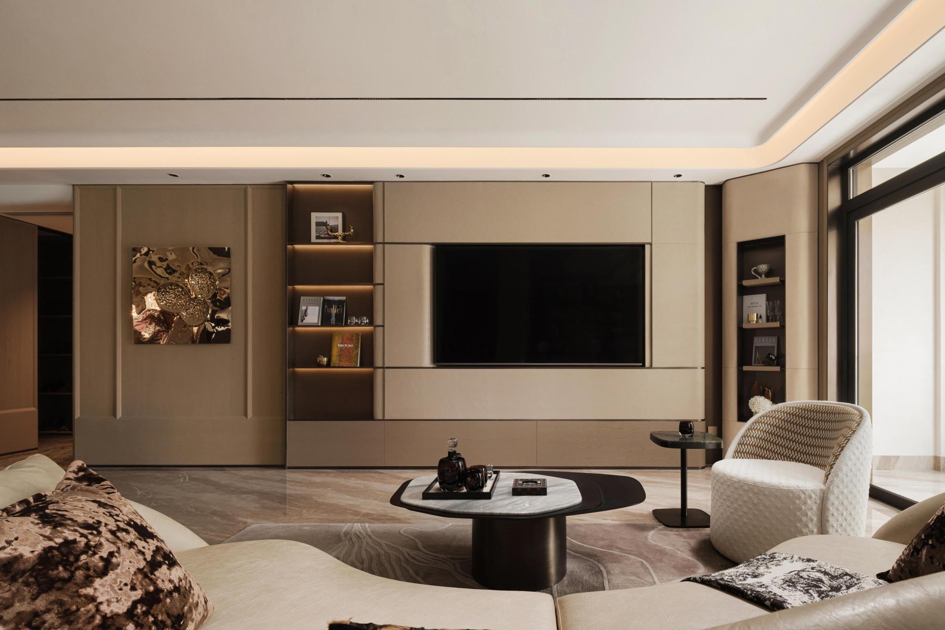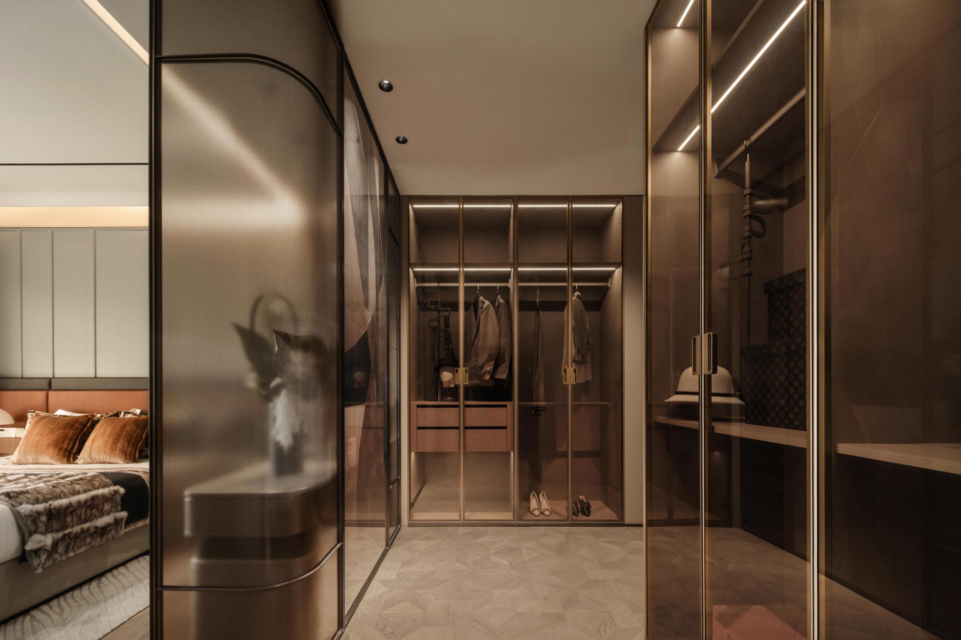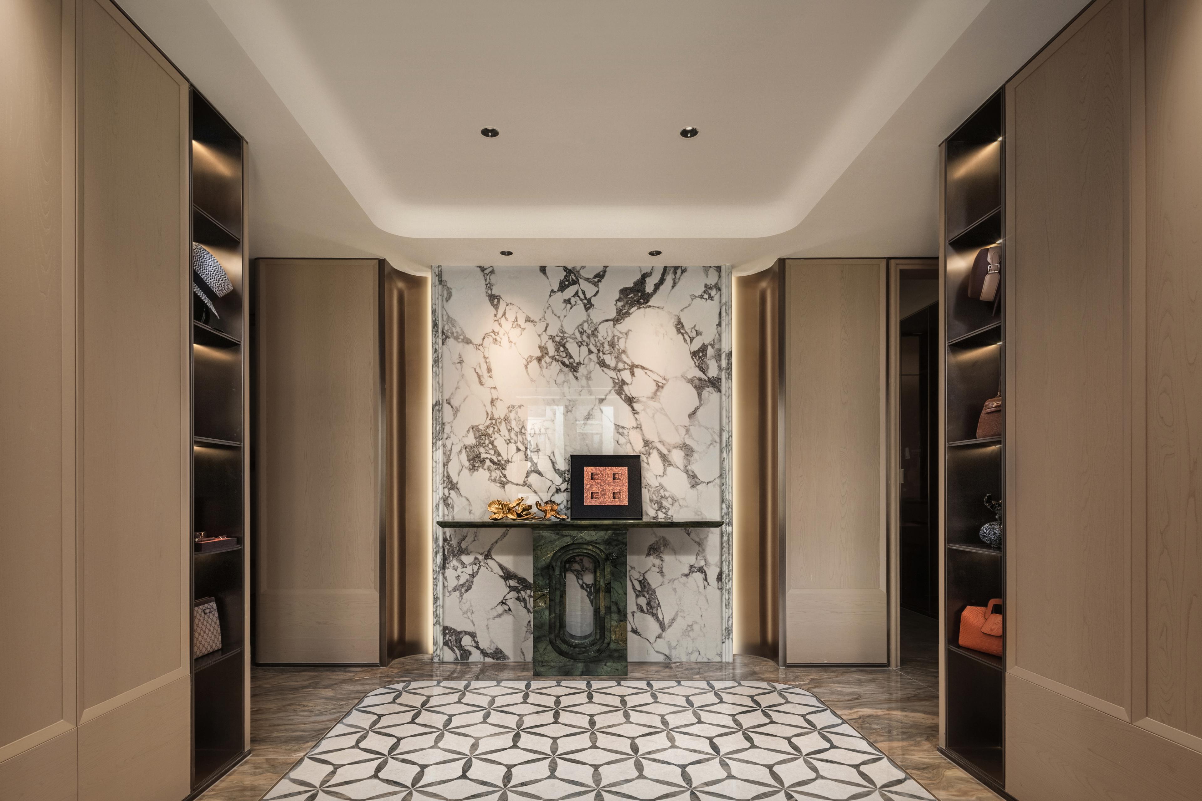 The space unfolds with an artistic sense of order and ritual. The marble wall evokes the natural rhythm of an ink painting, while concealed lighting and metallic lines create a balanced dialogue between rational precision and emotional warmth. The foyer follows the concept of coexistence of display and concealment, blending metal, wood, and stone textures to form a rhythm of openness and enclosure. Through subtle lighting transitions and meticulous detailing, the act of returning home becomes an immersive artistic experience.