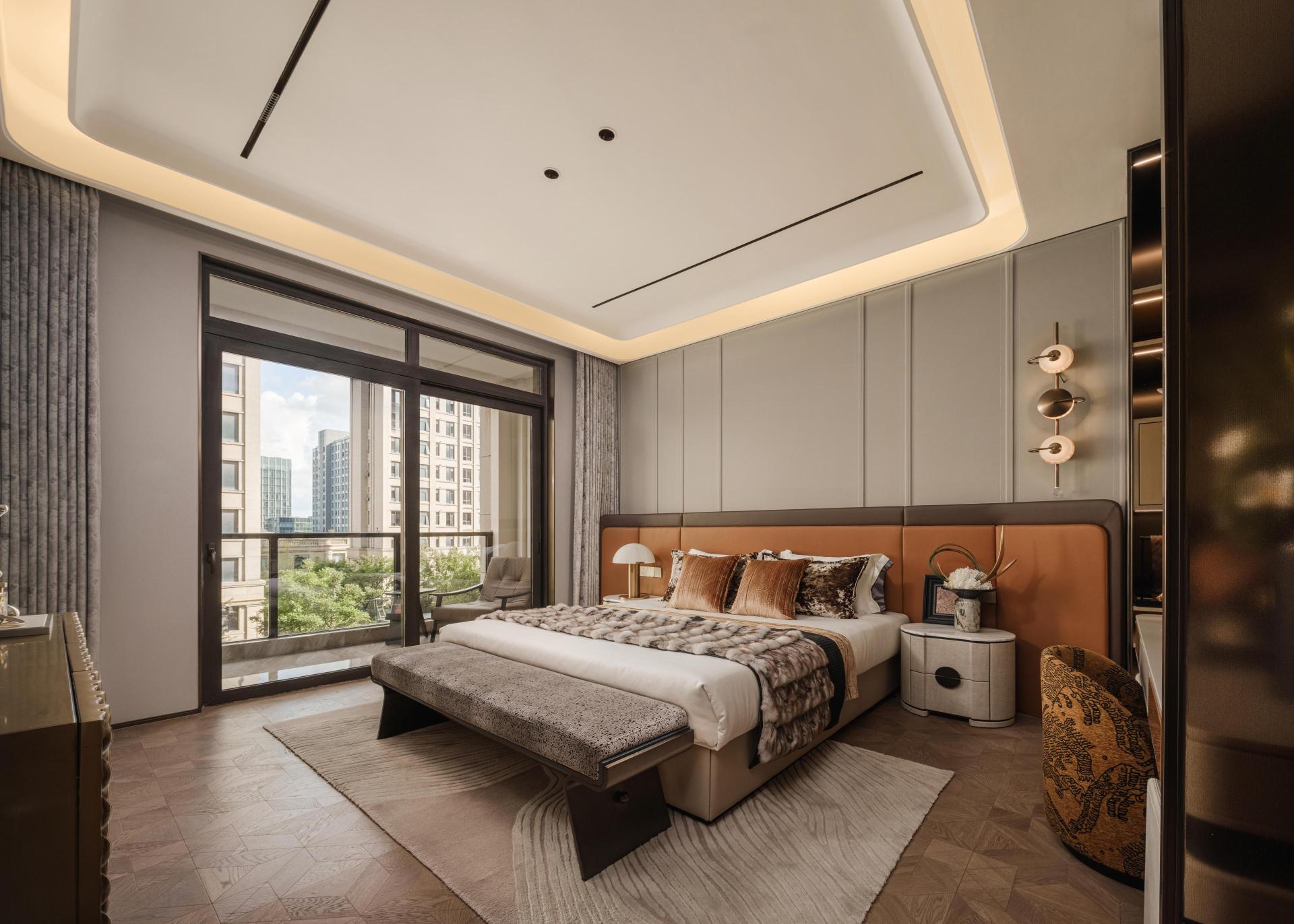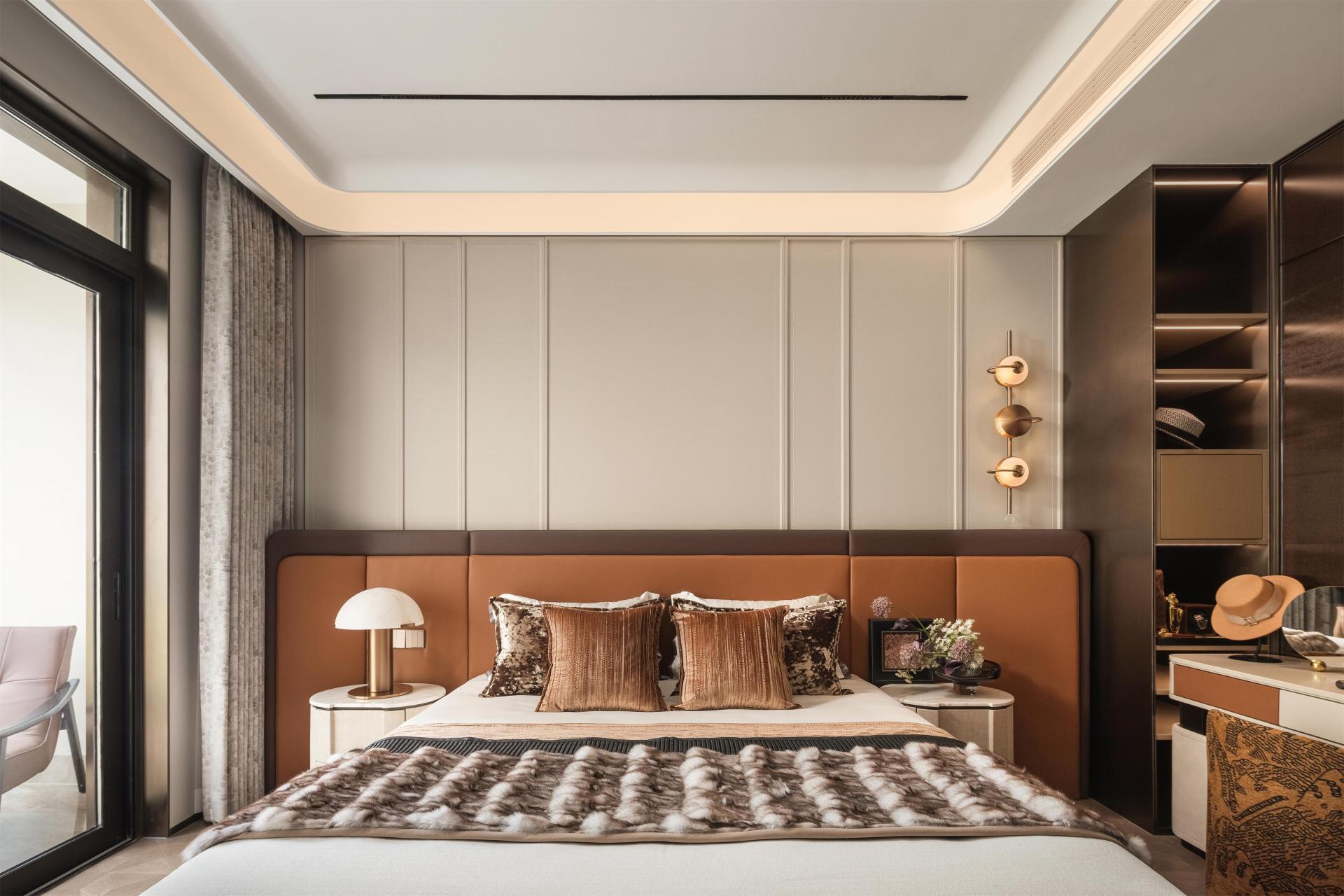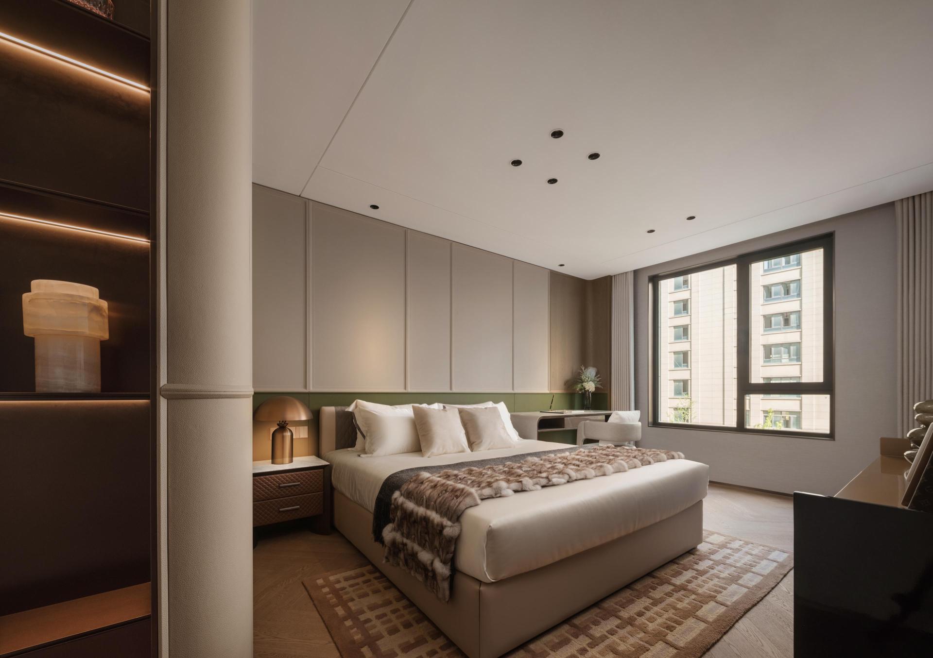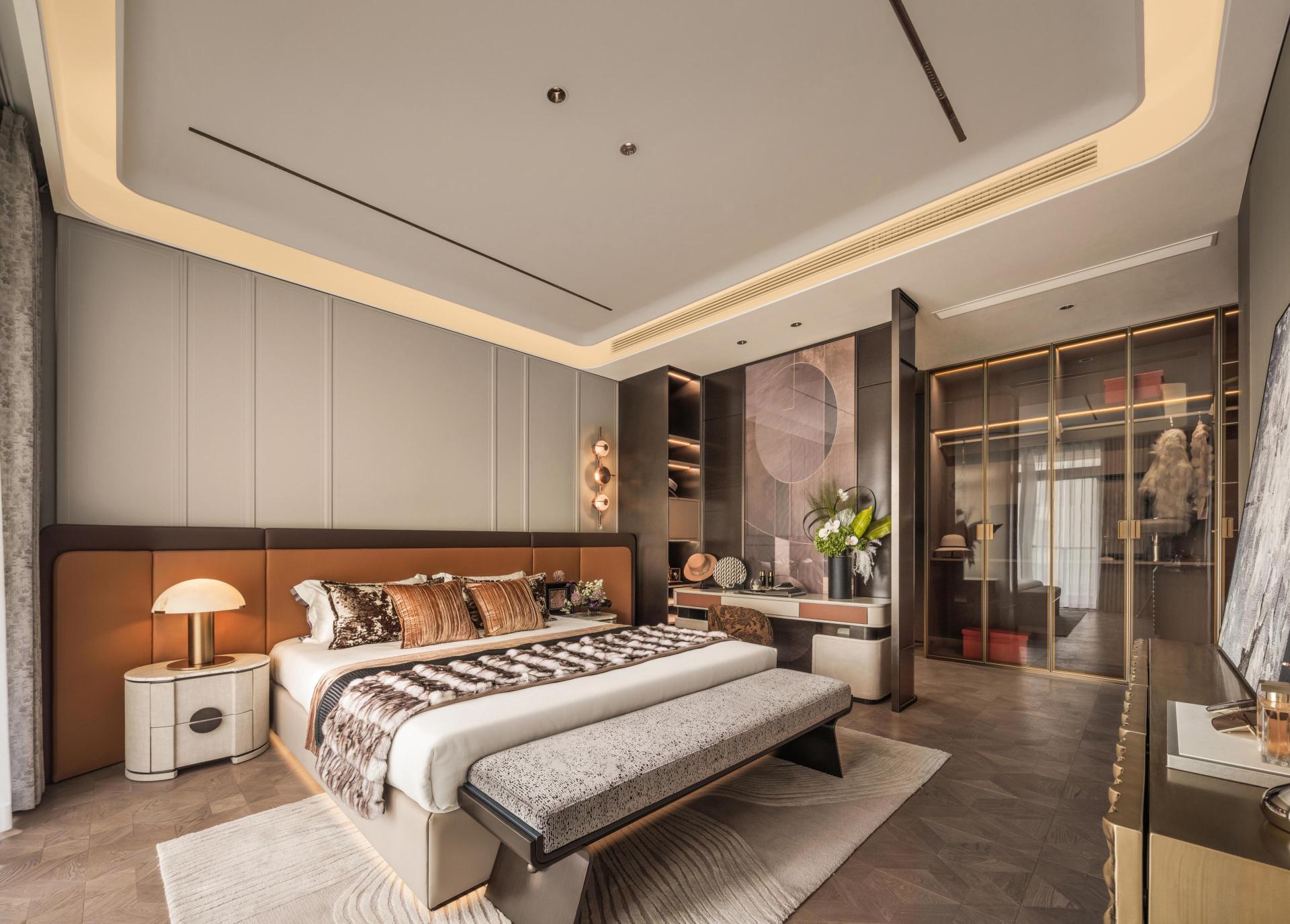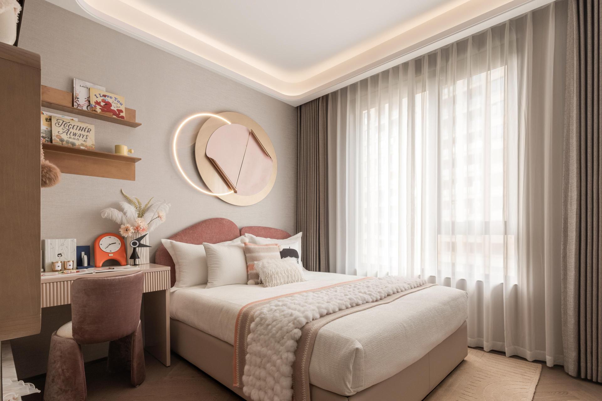 The master bedroom embraces the idea of graceful serenity and private renewal. A floating ceiling with linear lighting softens boundaries, while leather and warm-toned wood finishes create a tranquil, tactile atmosphere. The walk-in closet combines metal and leather to form a private gallery of artistry and order. The secondary bedroom continues a palette of low-saturation tones to evoke calm and comfort, while the children’s room, centered on the theme of Dreamland of Play, uses soft pink hues and rounded forms to cultivate warmth and vitality—painting a vivid portrait of a home layered with emotion and life.