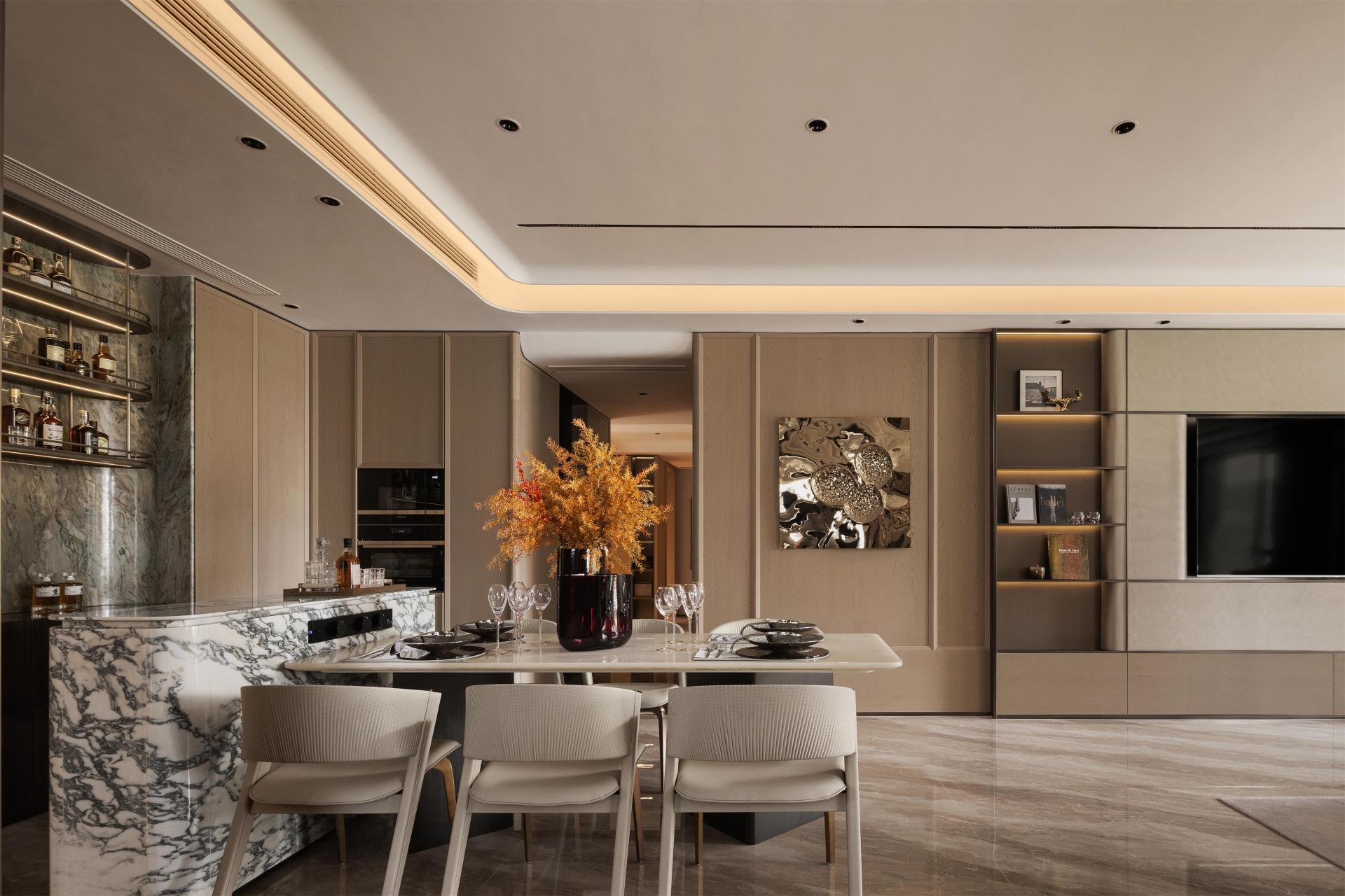 The dining area extends the spatial flow with a layered composition, where artistic display interacts with shifting light and shadow to create a Dining as Art experience. The combination of natural stone and wood veneer, illuminated by soft, ambient light, transforms the dining space into a setting that nurtures family connection and refined living.