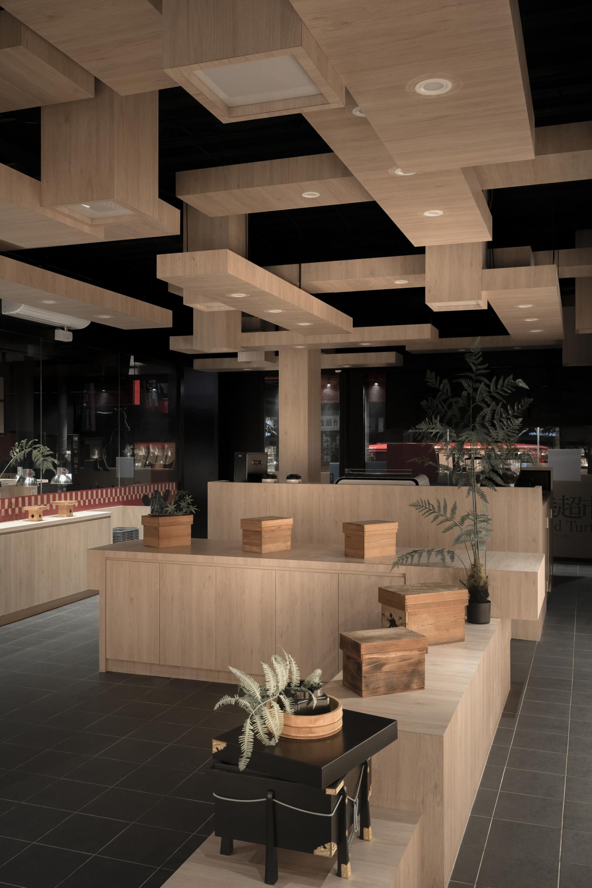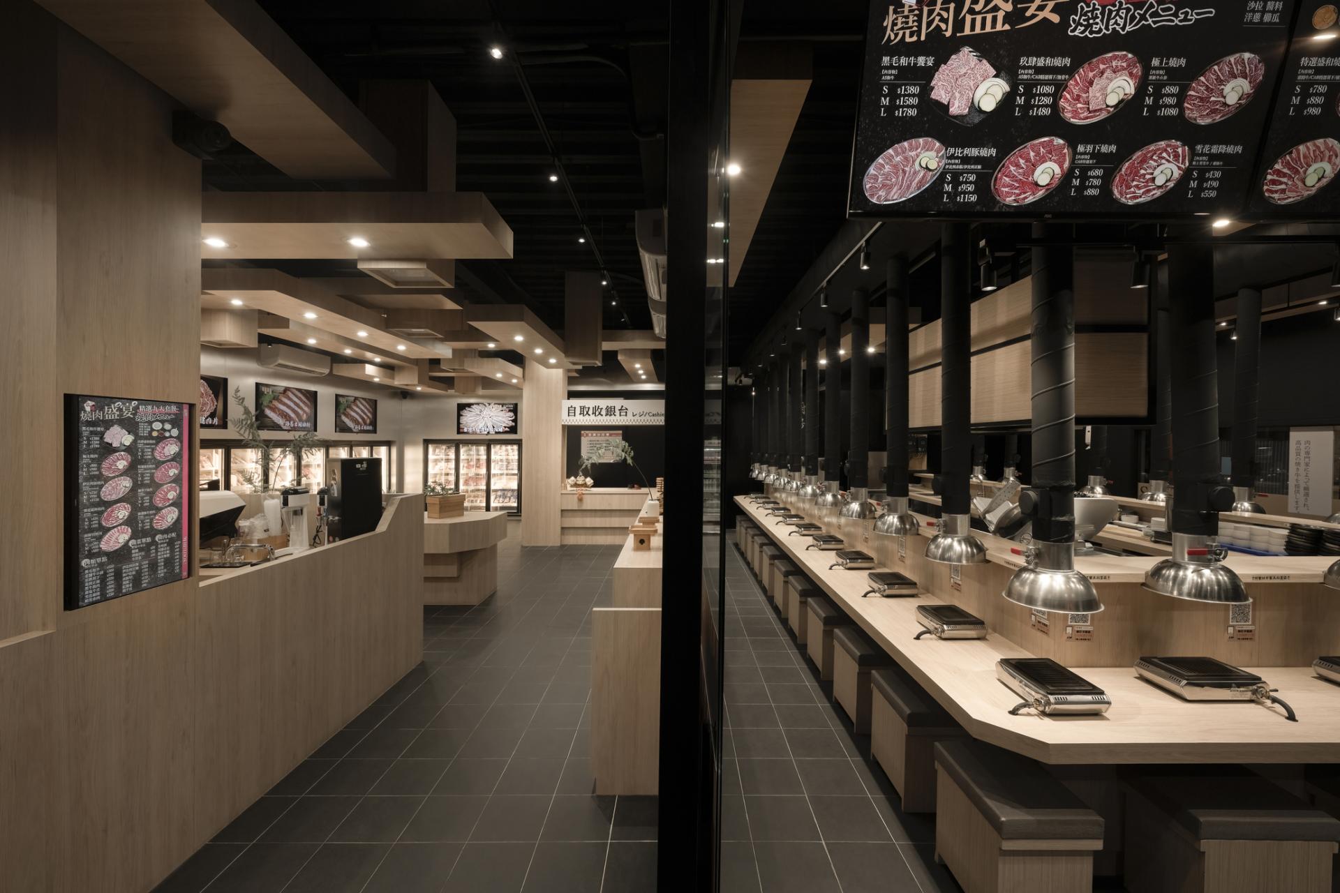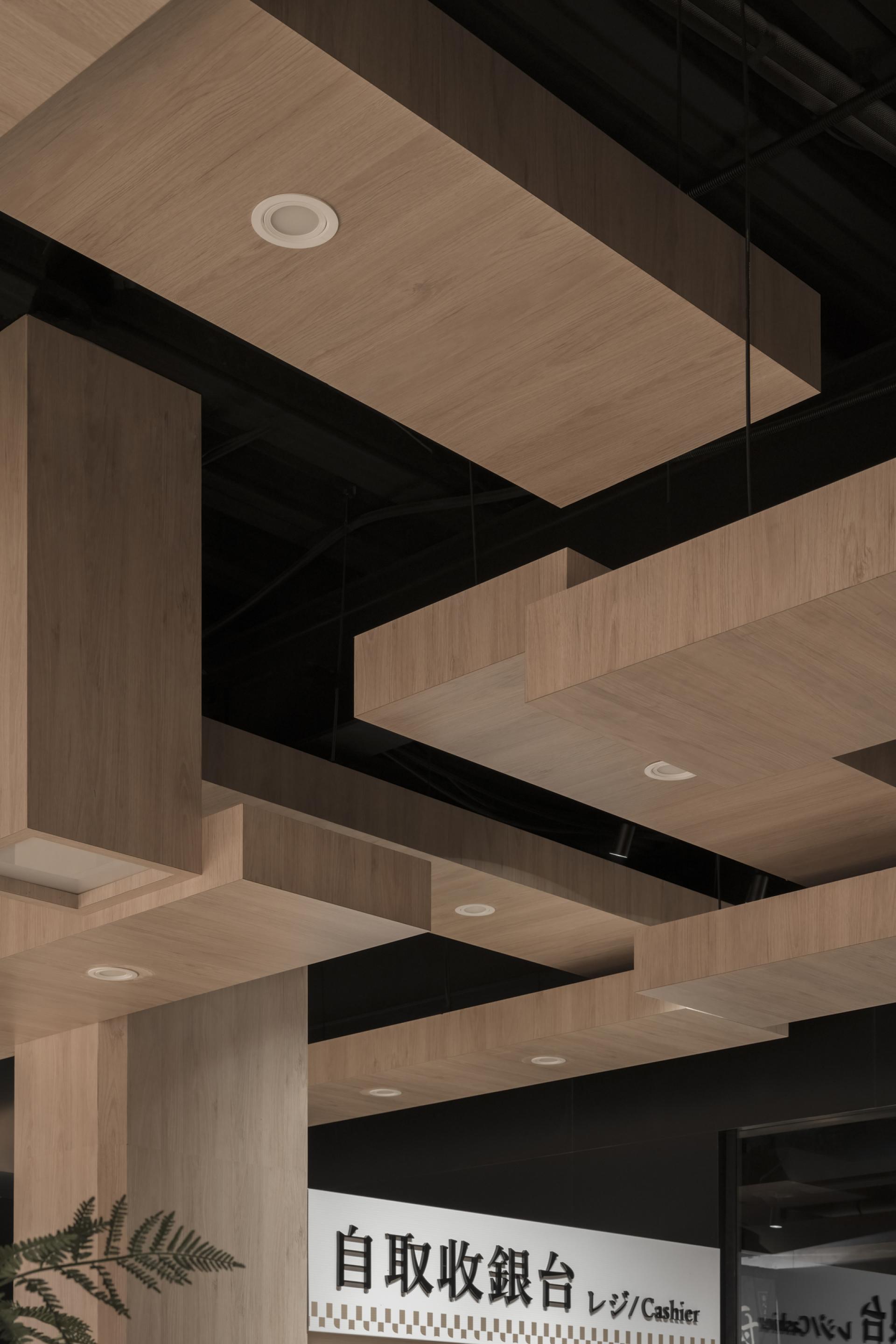 The interior uses a large area of wood grain materials, combined with matte metal, to form the dark background with soft blur edges, and wooden ceiling combined with warm light, shaping a warm texture. Especially in the single-person yakiniku area, it provides an assured and private space. The supermarket area also balances the different colors of goods through wood grain. At the same time, the green plants echo the feature of Yuanlin as a major flower town.