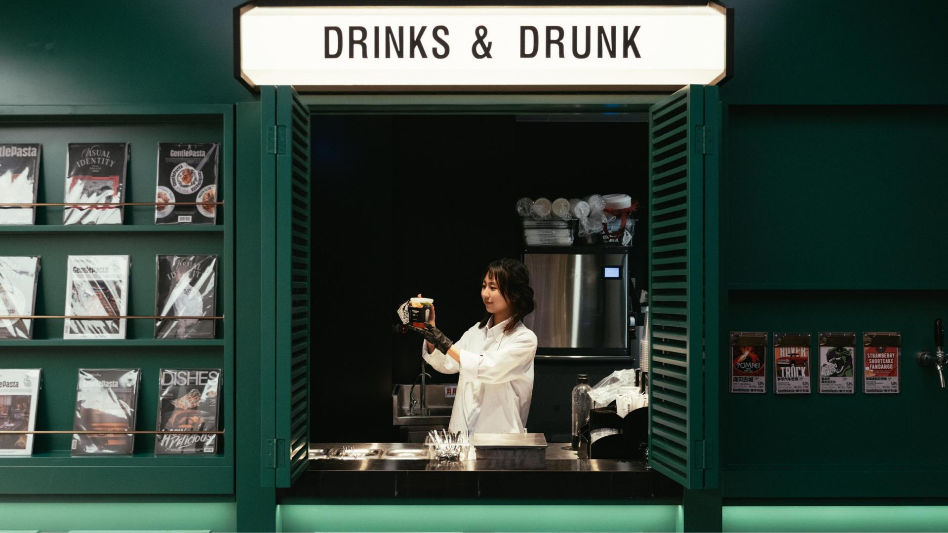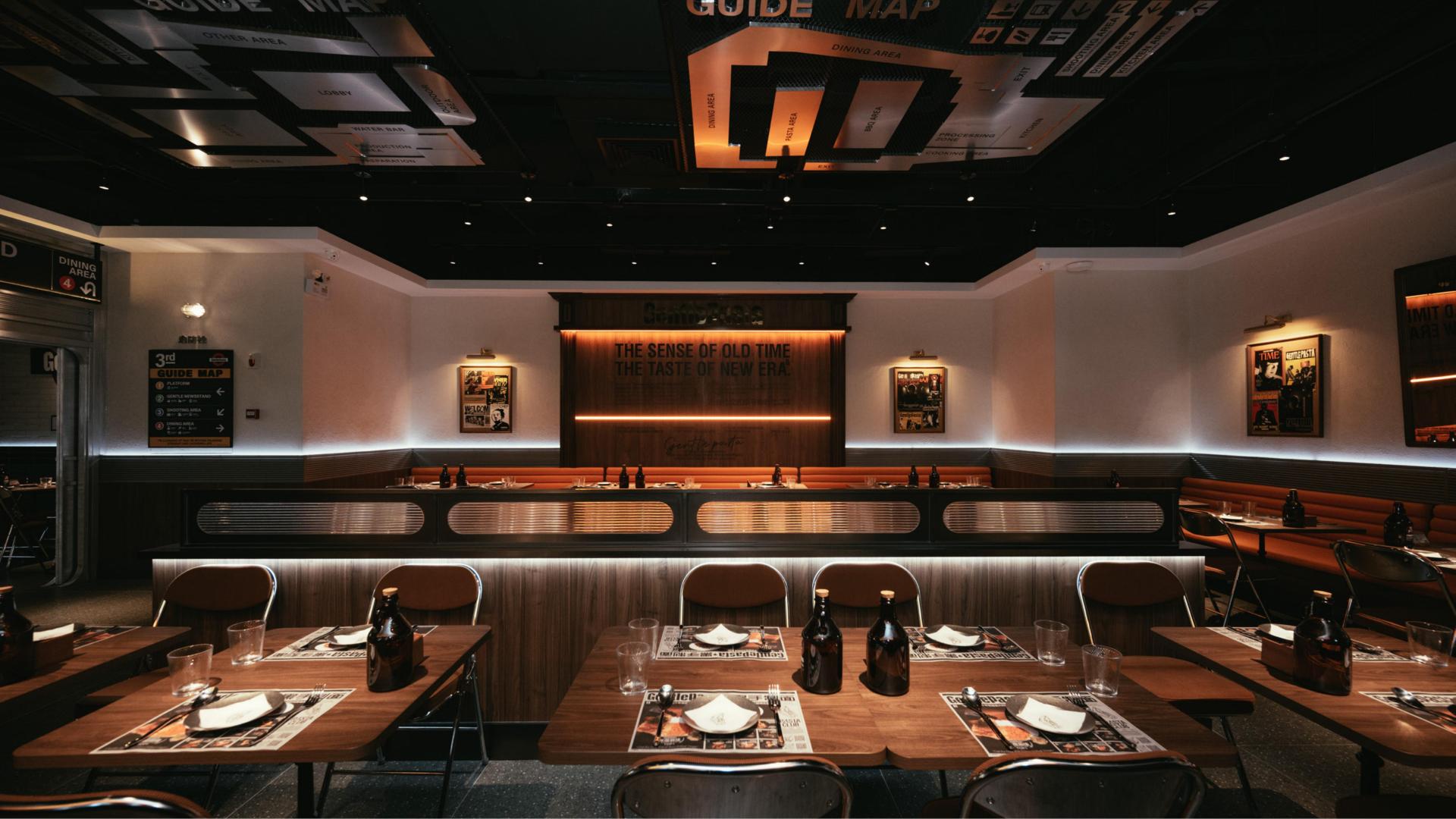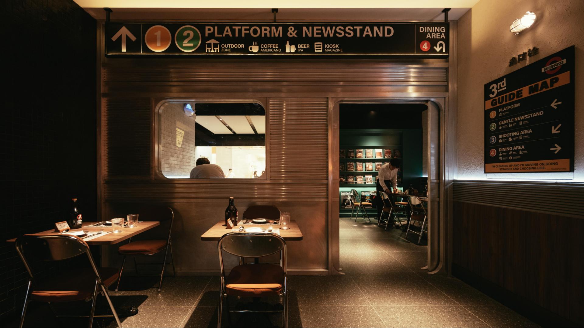 This cultural crossover of “station × cinema” introduces narrative tension through visual rhythm, spatial flow, and lighting design. Black mirrored ceilings printed with phrases reflect the directional floor layout, while a unified typography system guides wayfinding through the marquee, kitchen pass, and signage points—altogether forming a cohesive, shareable visual identity.
