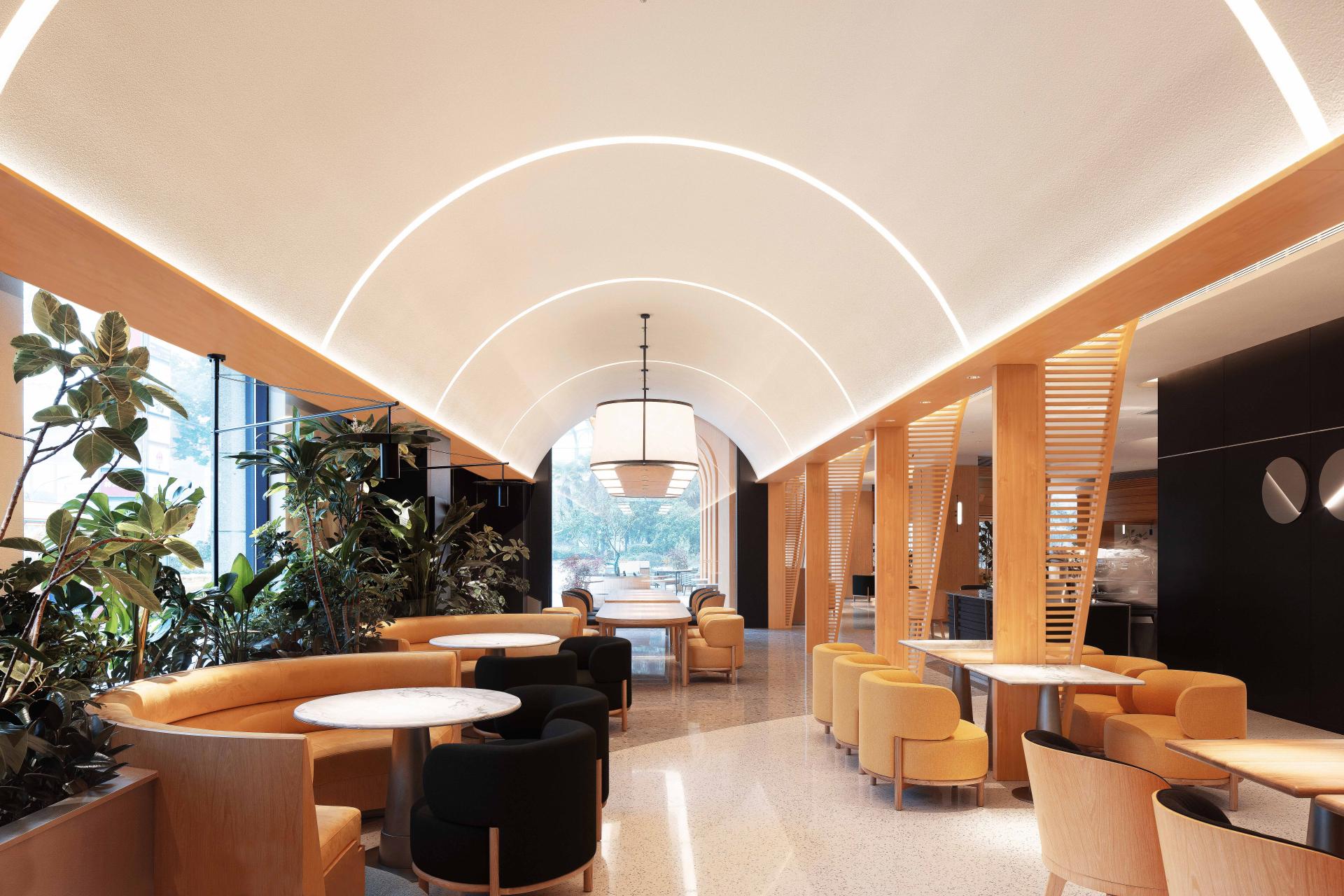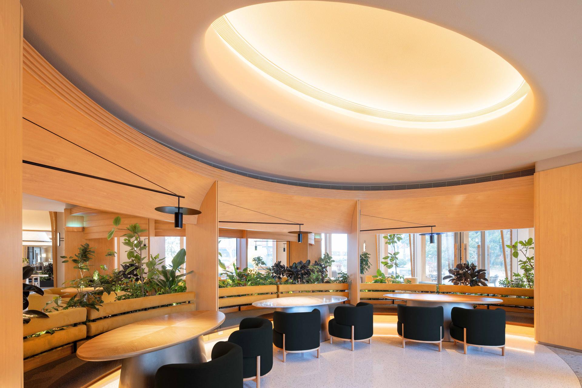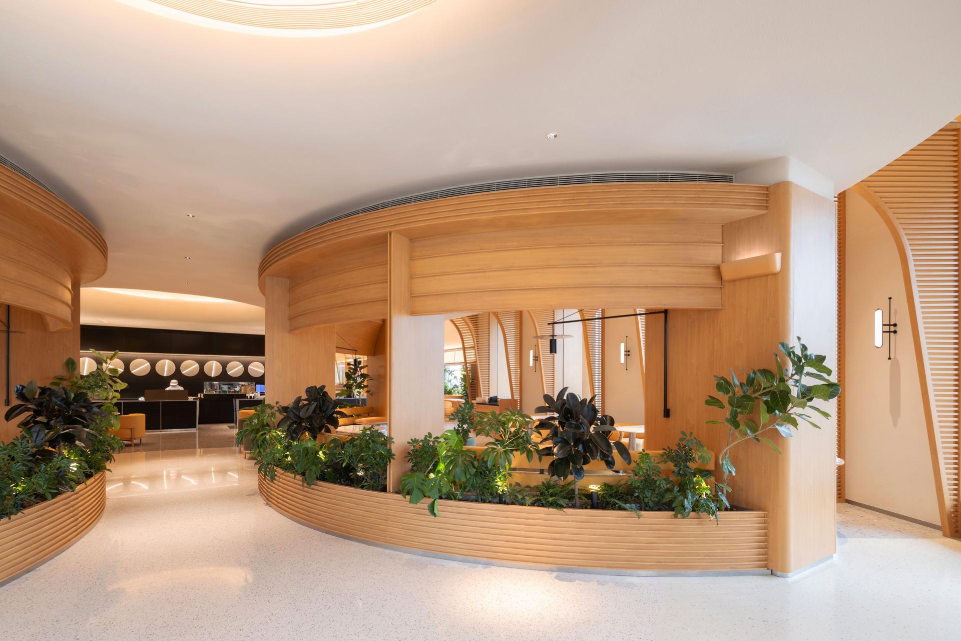 Tucked into the double-height embrace of Zhongji Wenchang Center, BCO Yangzhou Zhongji is a 500 m² sanctuary of light and texture, where floor-to-ceiling windows flood the space with golden daylight. A palette of low-saturation concrete, pale oak, and off-white sets a serene stage, while cascading ferns, sprawling monstera, and an 1.8-meter living moss wall cool the air by three degrees, creating a breathing oasis amid the urban hum.