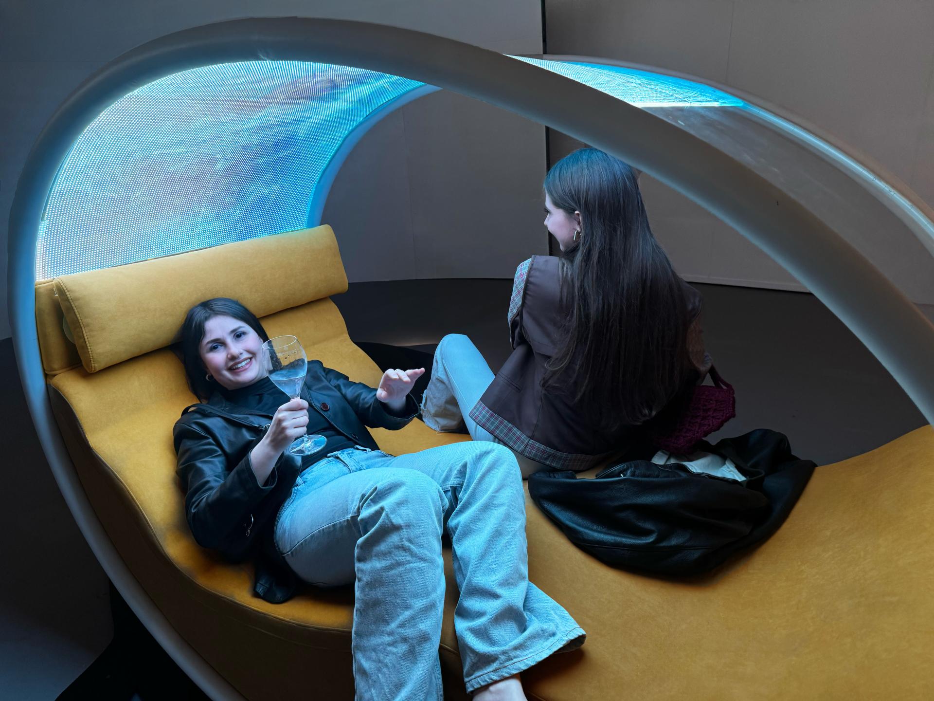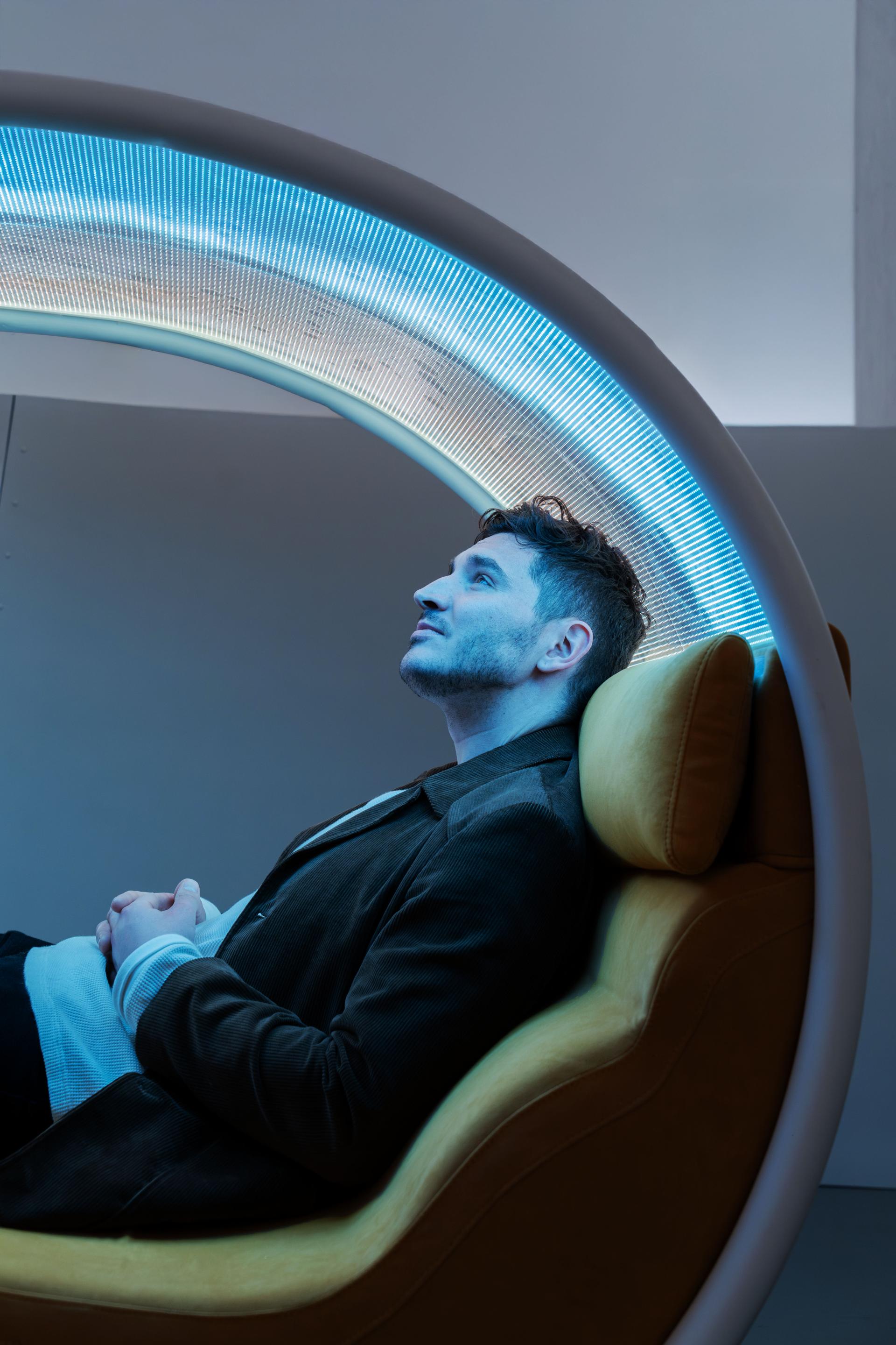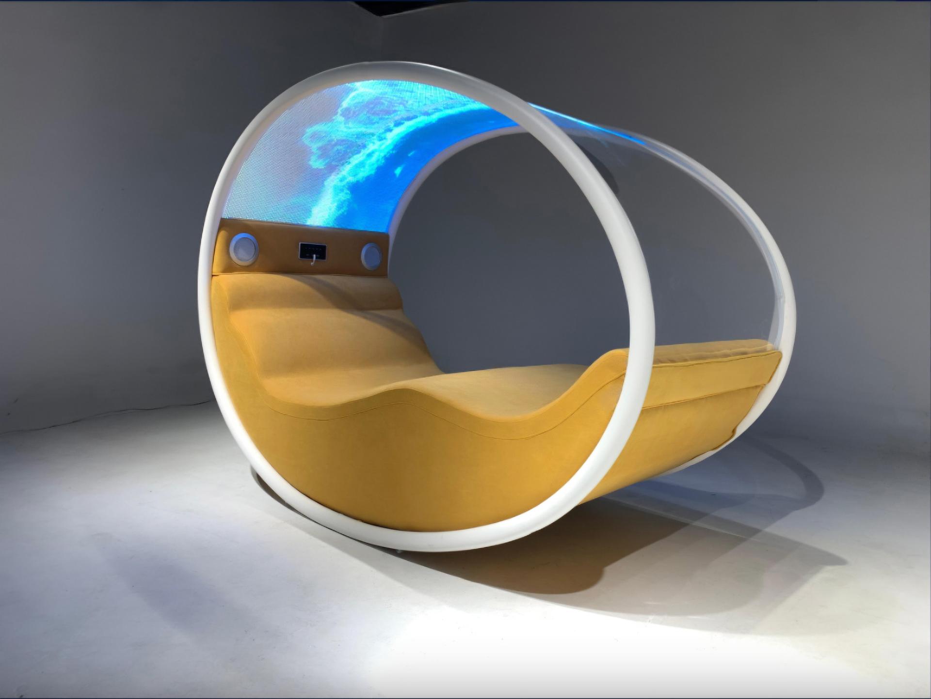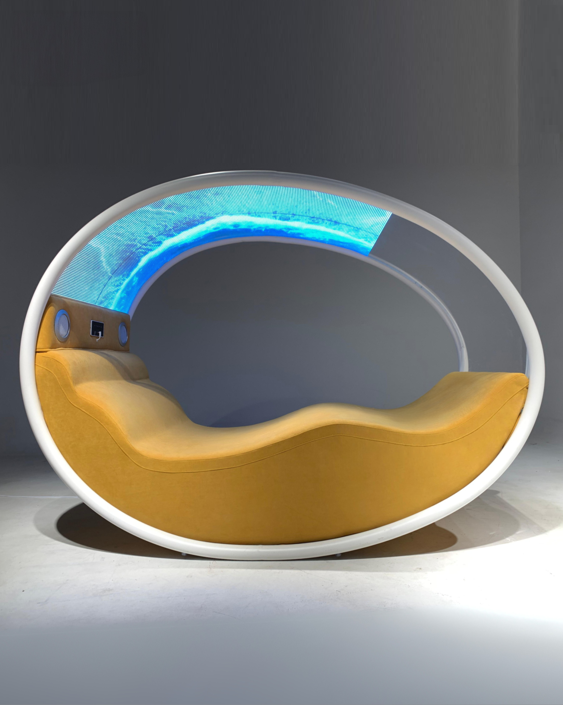 Its curved interior, lined with soft textures, invites full recline. Above, a seamless transparent LED screen arches like a sky dome, streaming ever-shifting scenes: the shimmer of early sunlight through ocean waves, the lavender dusk over distant mountains. These visual tapestries are dynamically linked to ambient data with light, time, and weather—making every session a uniquely personal vignette.