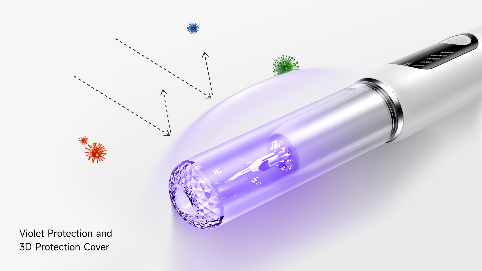 Sensitive Mode(<28dB): Gentle and quiet. Orthodontic Mode (3D Vibration Vector): Effective cleaning for braces Implant Mode (Specific Frequencies): Optimized for dental implants. Whitening Mode (40um Microbubble Burst): Brightens teeth with microbubbles. Deep Clean Mode (42kHz Ultrasound): Intensive clean with medical-grade ultrasound. The 3D protection cover can reduce bacterial growth. When the device is charging, the purple light mode automatically turns on. Continuous exposure to the purple light cleans the head of the cleaner, effectively inhibiting the growth of bacteria. This builds a strong defense line for the oral environment and gives you peace of mind while cleaning your teeth.