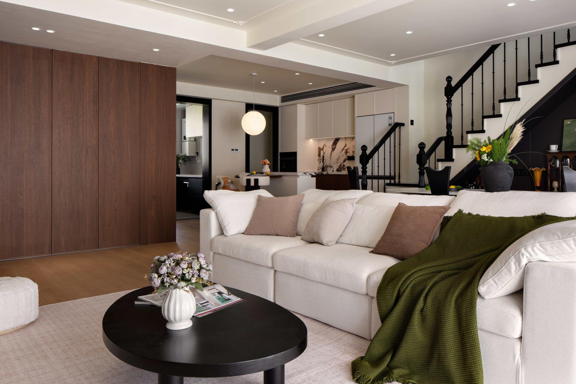 A palette of low-saturation neutral tones—cream, beige, and wood—forms the foundation of the color scheme, evoking a calming, cozy atmosphere. Accents of black add contrast and depth, elevating the overall sophistication of the space.