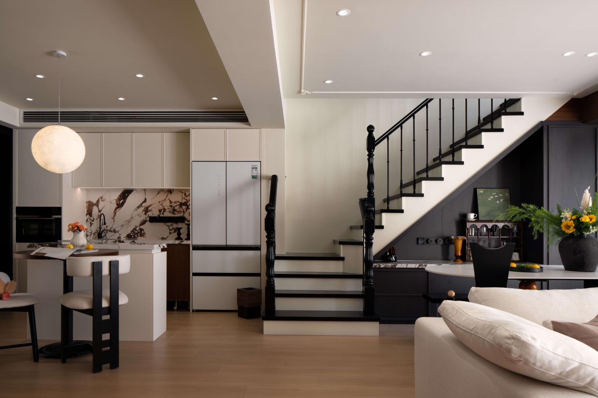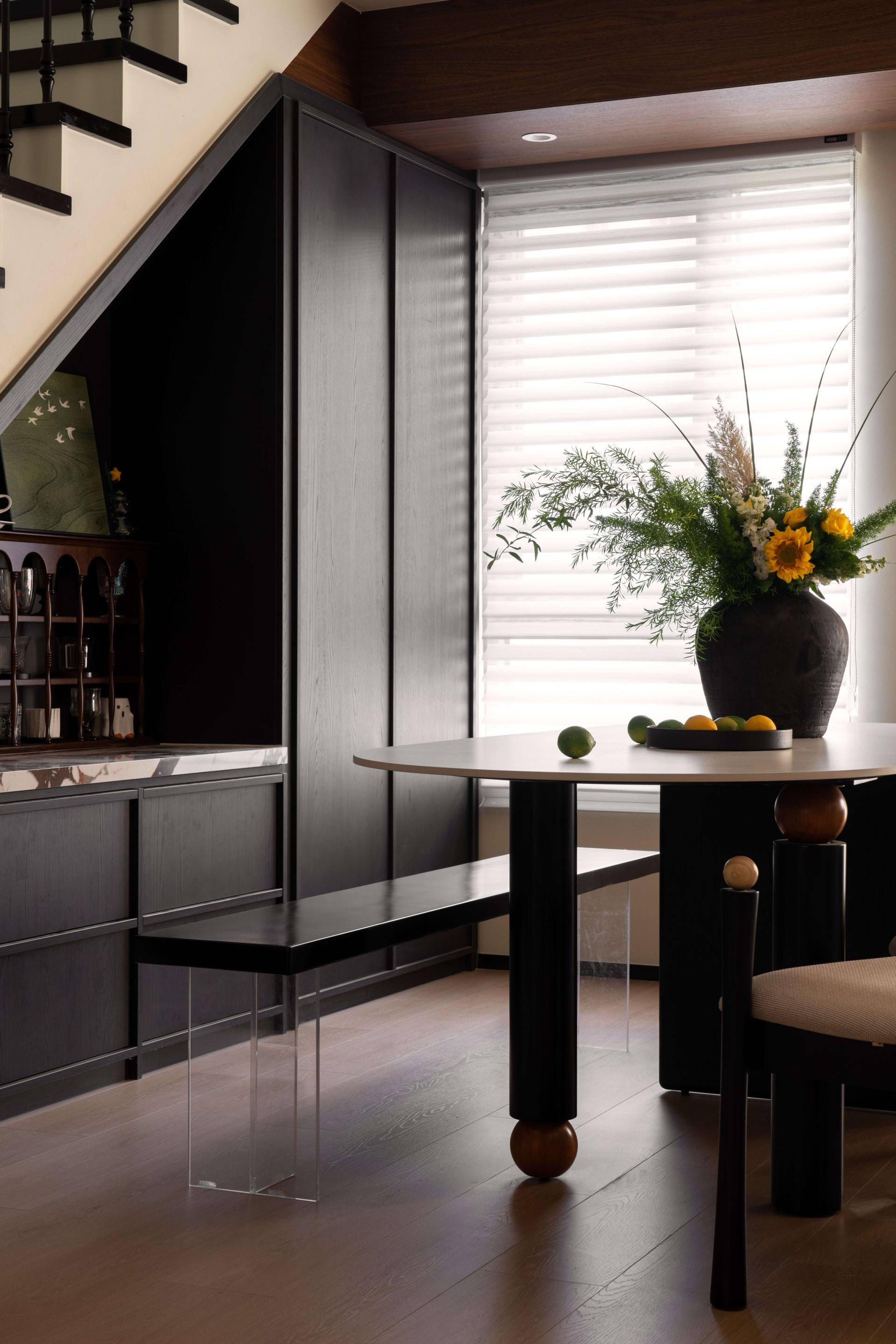 The soft furnishings emphasize the balance of textures and styles. In the living room, a plush white round stool contrasts a sleek black oval coffee table, creating a visual rhythm of softness and strength. Fresh flowers in delicate vases bring natural vitality into the space. In the dining area, a black vase filled with sunflowers and greenery, paired with seasonal fruits, sets a casual yet lively tone.