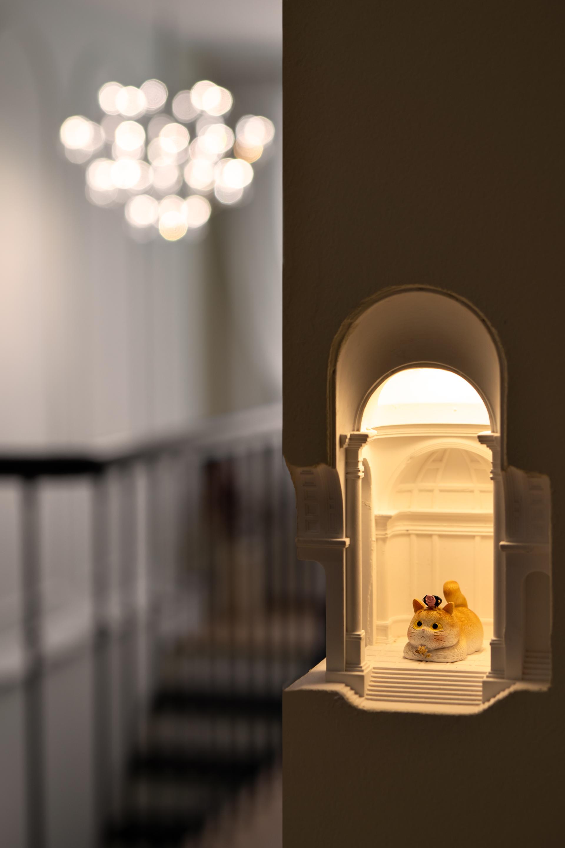 Lighting is carefully curated to enhance mood and comfort. A mix of spotlights and ambient fixtures casts a soft, enveloping glow, reinforcing the home’s gentle and inviting character.