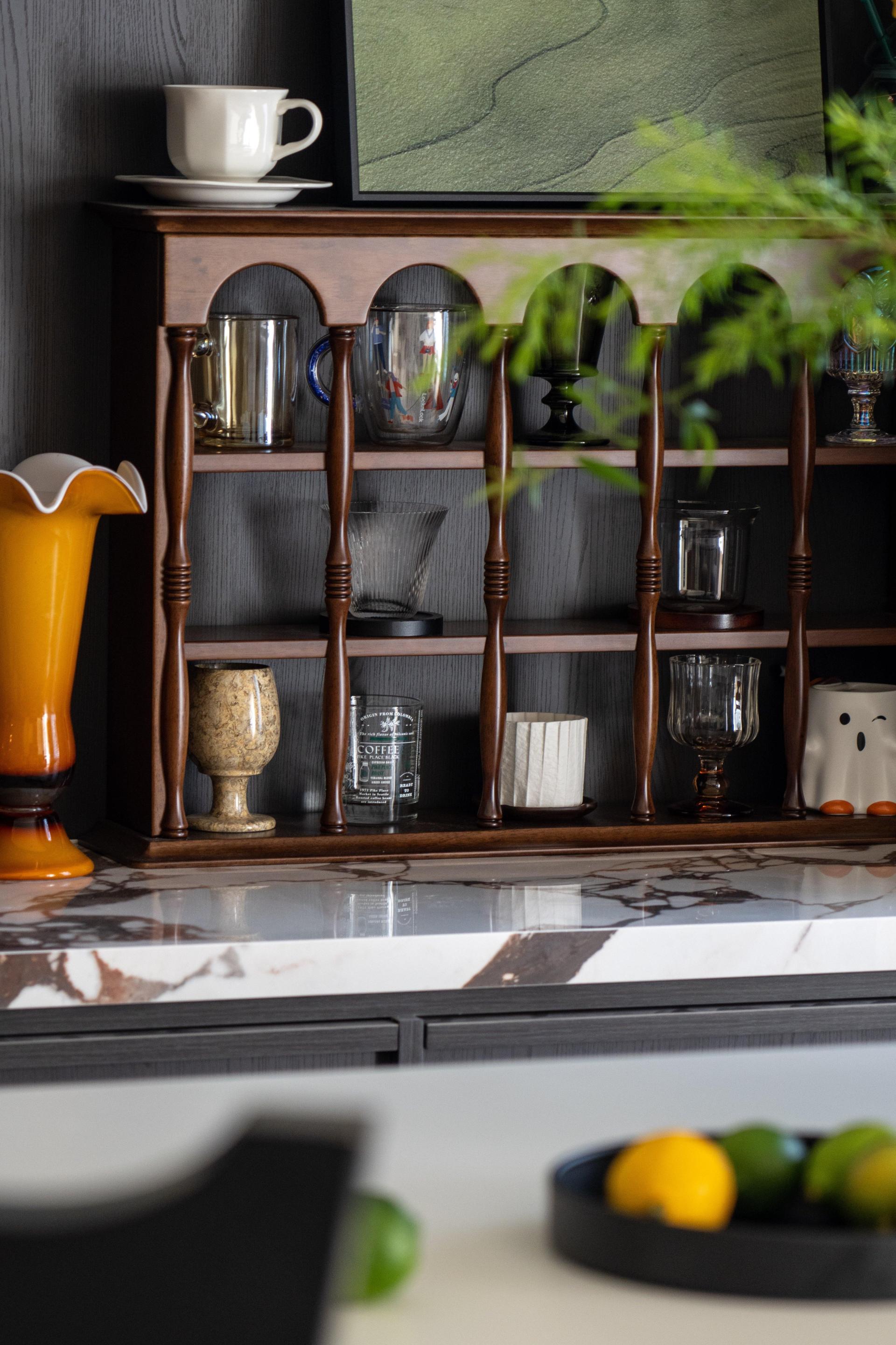 Material selection is rooted in nature and tactility. Rich wood grains are used extensively on floors and cabinetry, offering warmth and organic texture. Marble surfaces and transparent acrylic details balance the visual weight, injecting a sense of lightness and refinement.