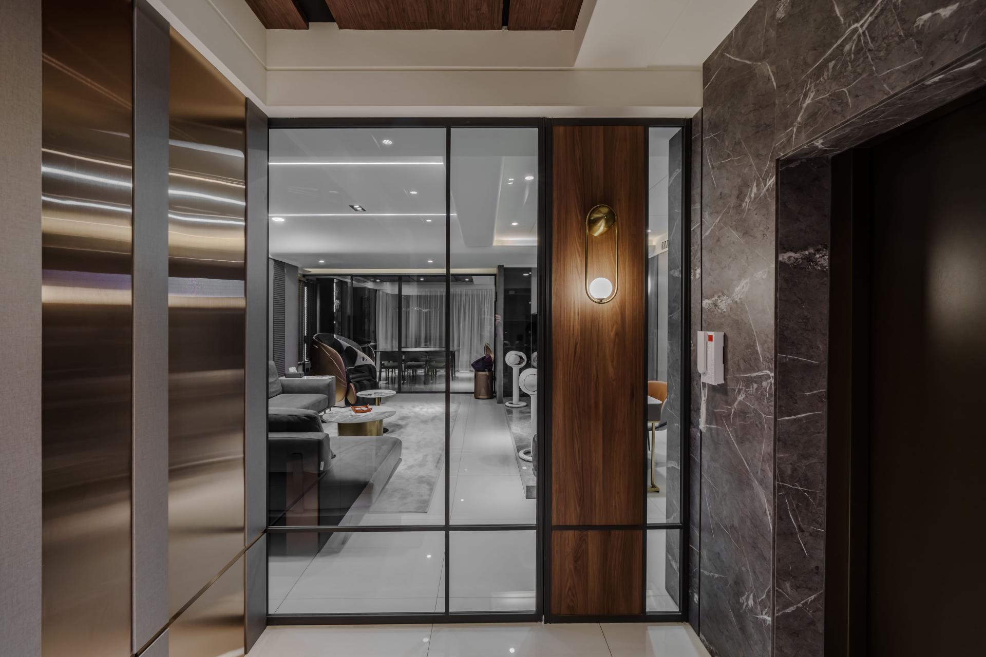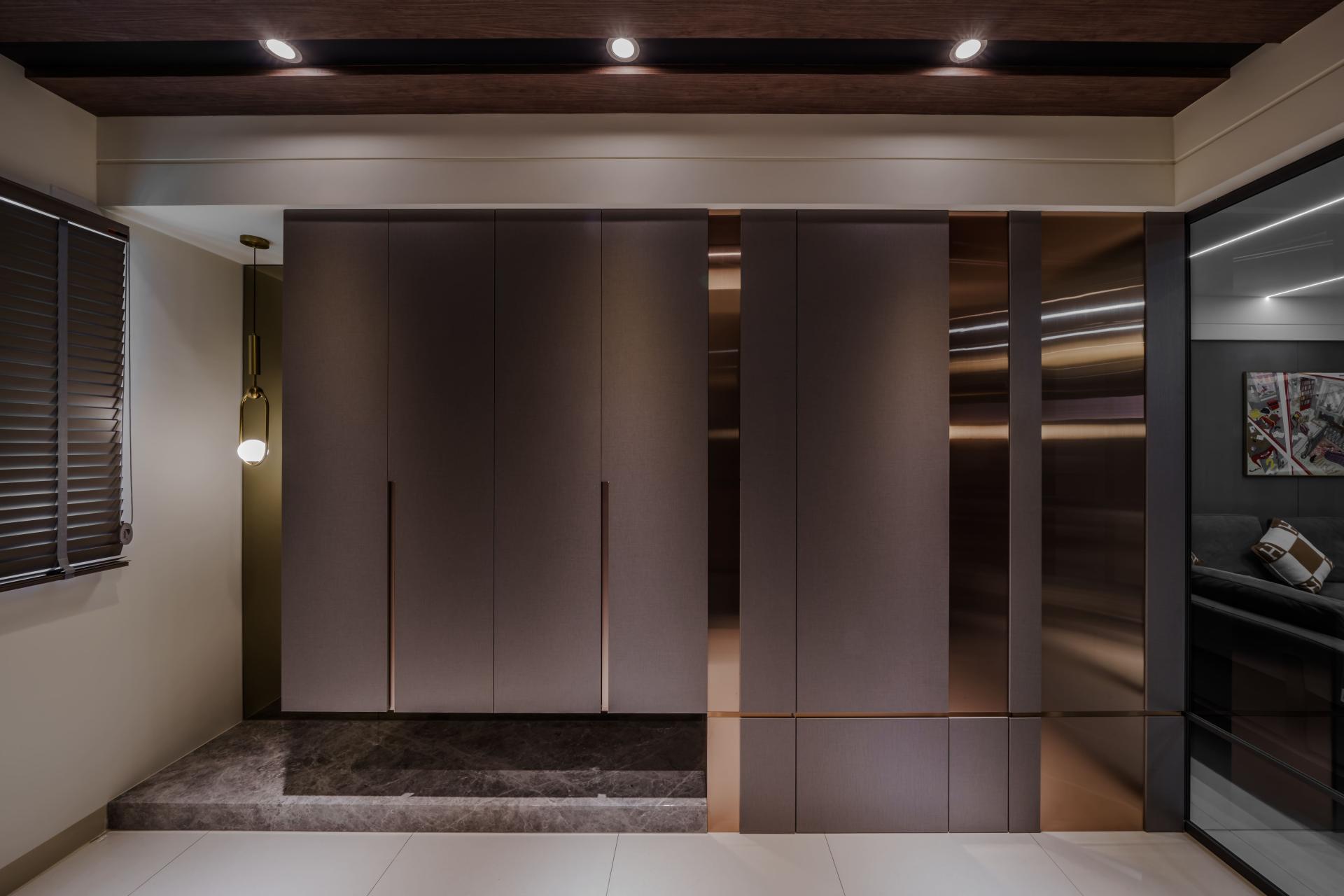 In the entrance area, metal panels, leather surfaces, wood textures, and marble are layered to establish a bold and elegant arrival moment. The mixed materials form a rich yet balanced visual rhythm.