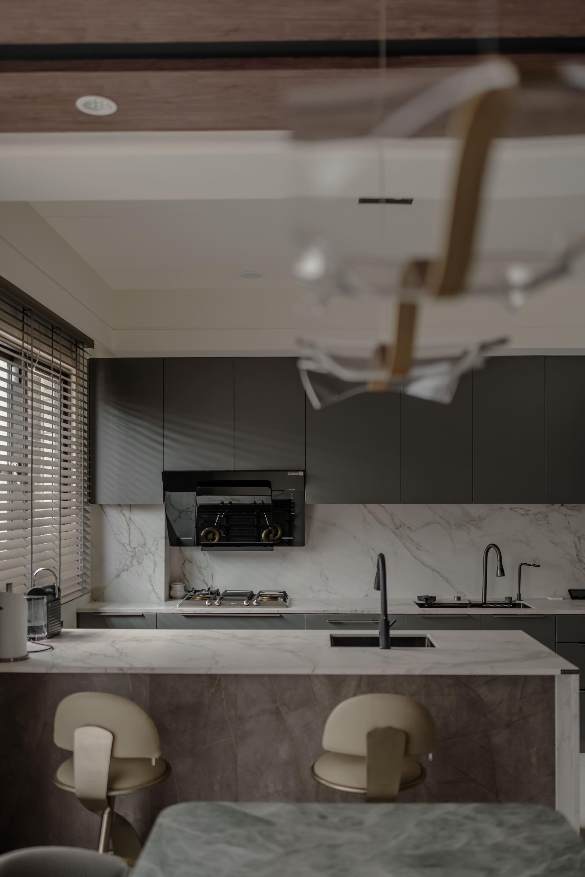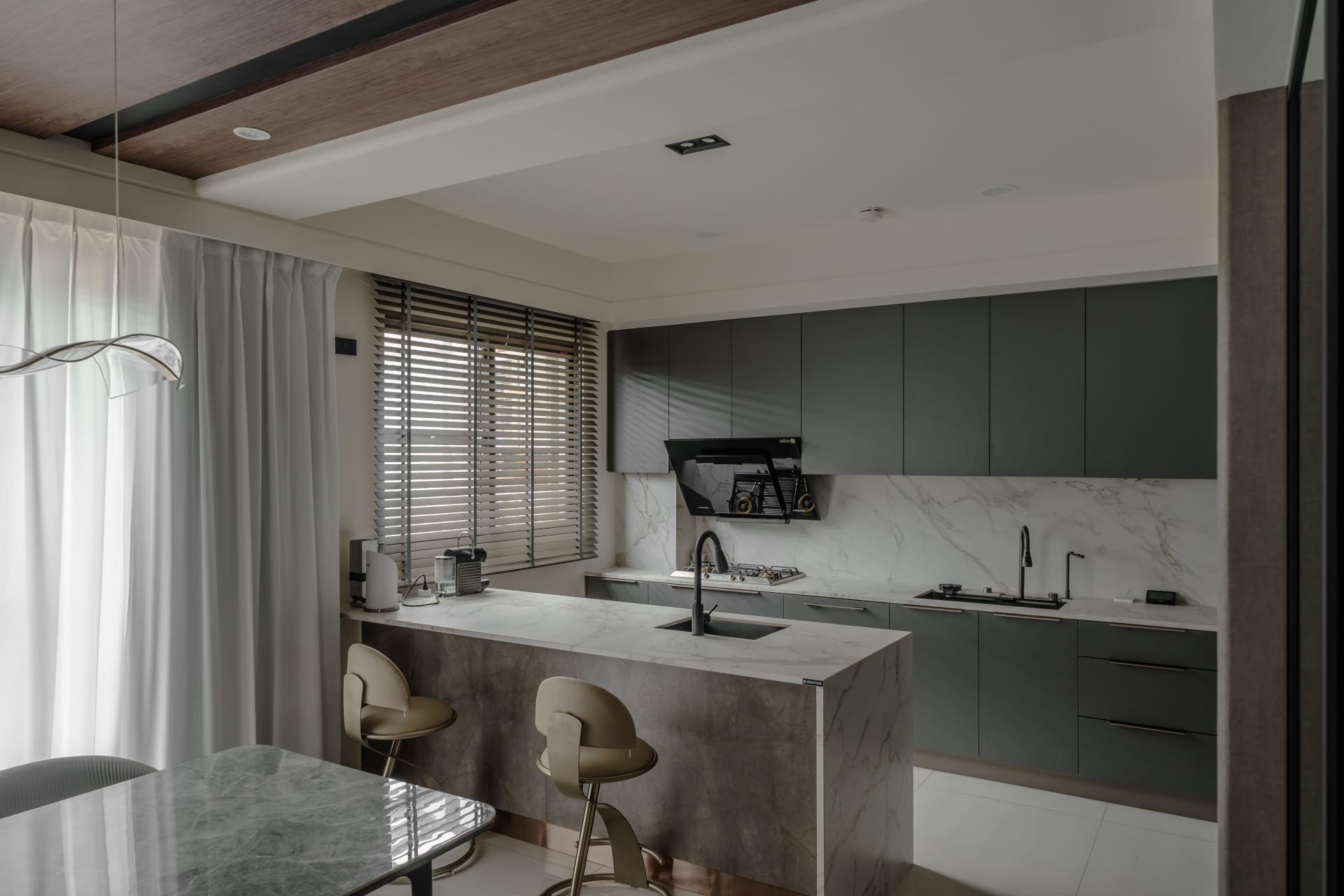 The kitchen celebrates contrast—marble countertops are matched with leather-textured cabinetry, producing a space that is both sturdy and refined. It offers tactile warmth while remaining highly functional.