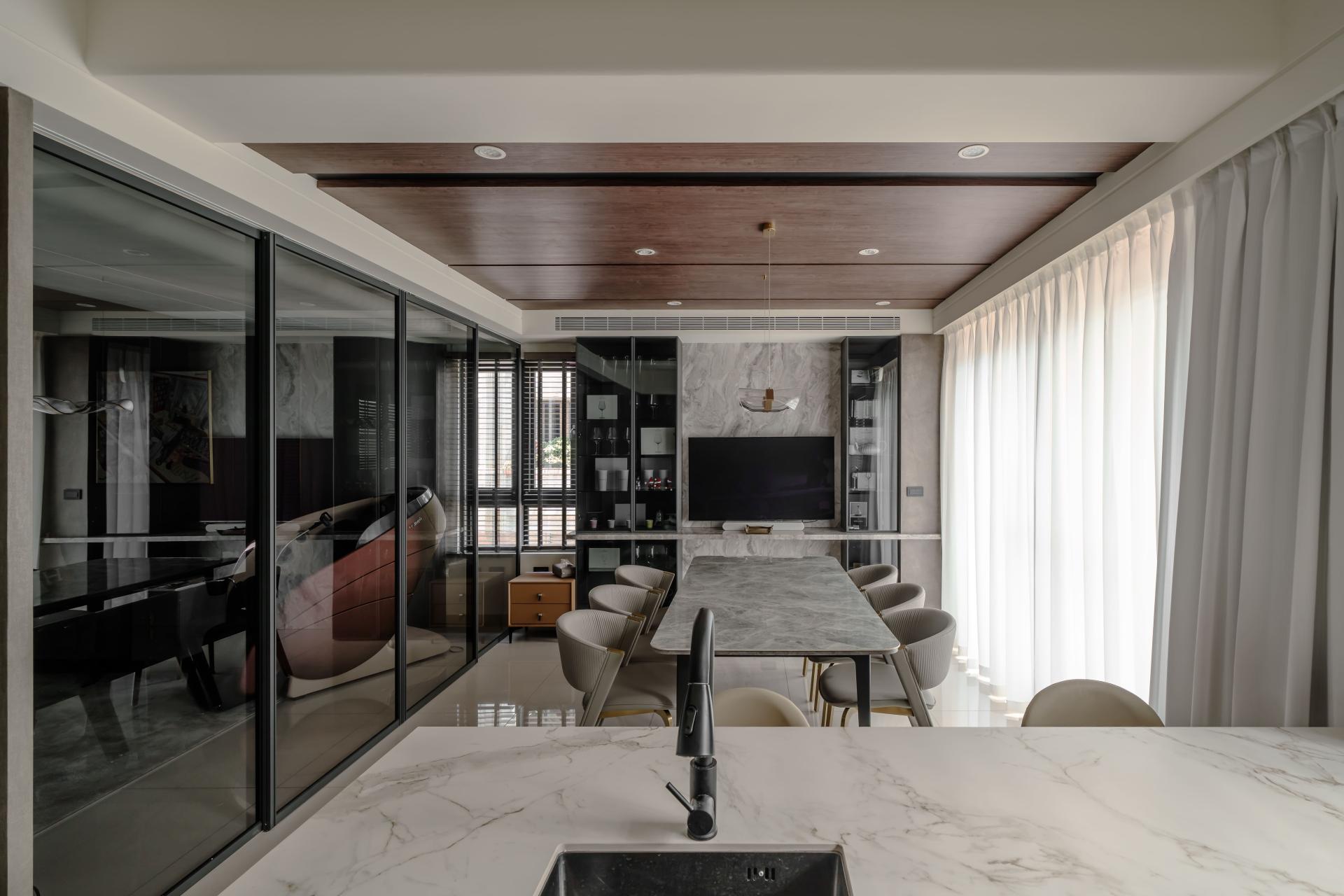 In the dining area, natural elements take center stage: a grey stone tabletop, metallic pendant lighting, aluminum-framed glass doors, and a warm wood-grain ceiling collectively express the innate beauty of raw materials.