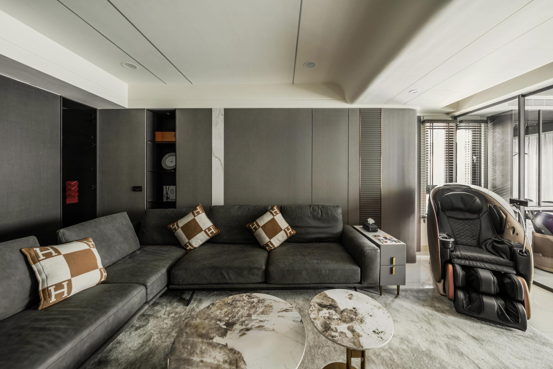The living room embraces gentle curves with leather finishes and Silver Fox stone, forming a soft sculptural composition that contrasts with the linear built-in cabinets.