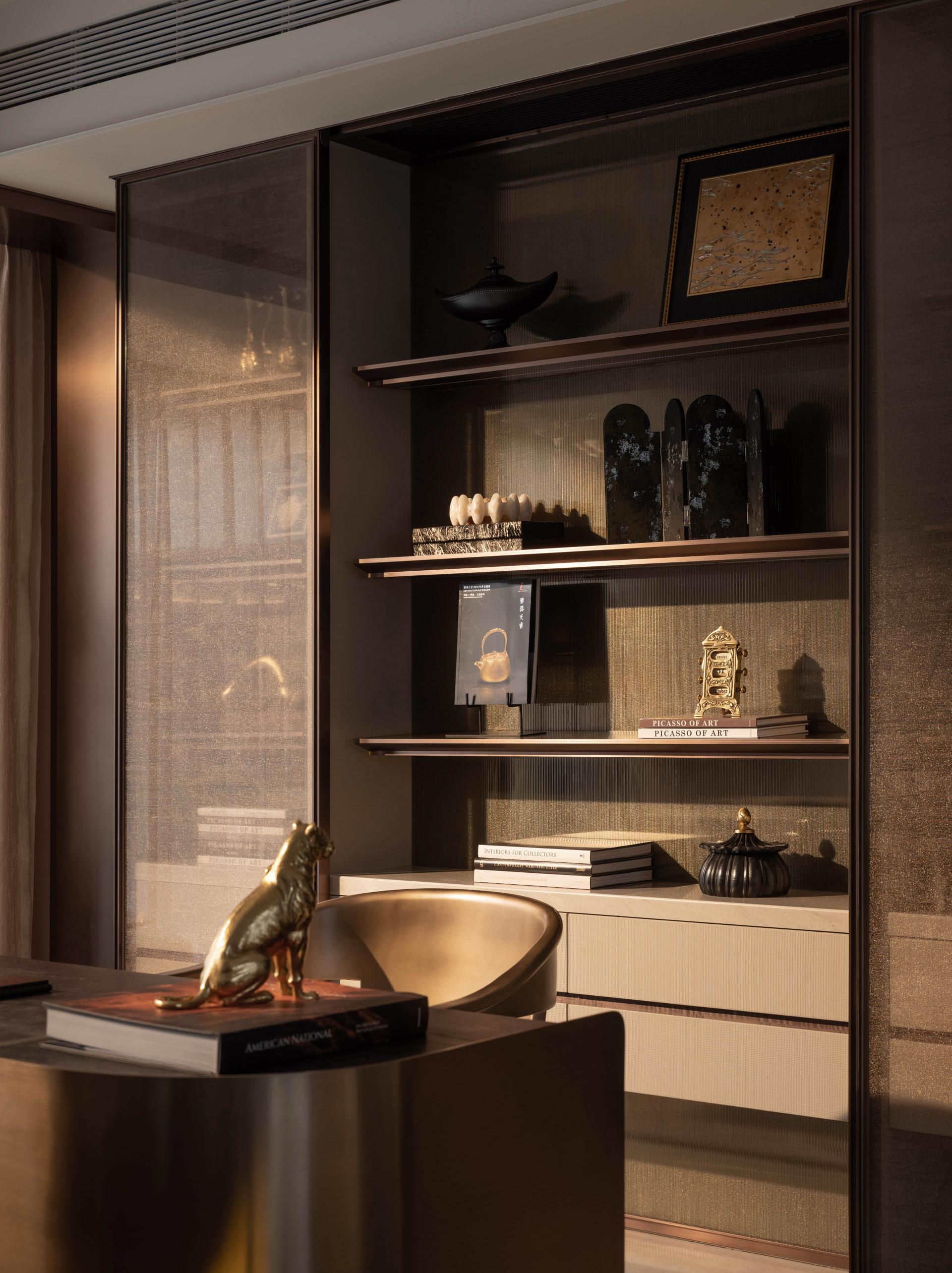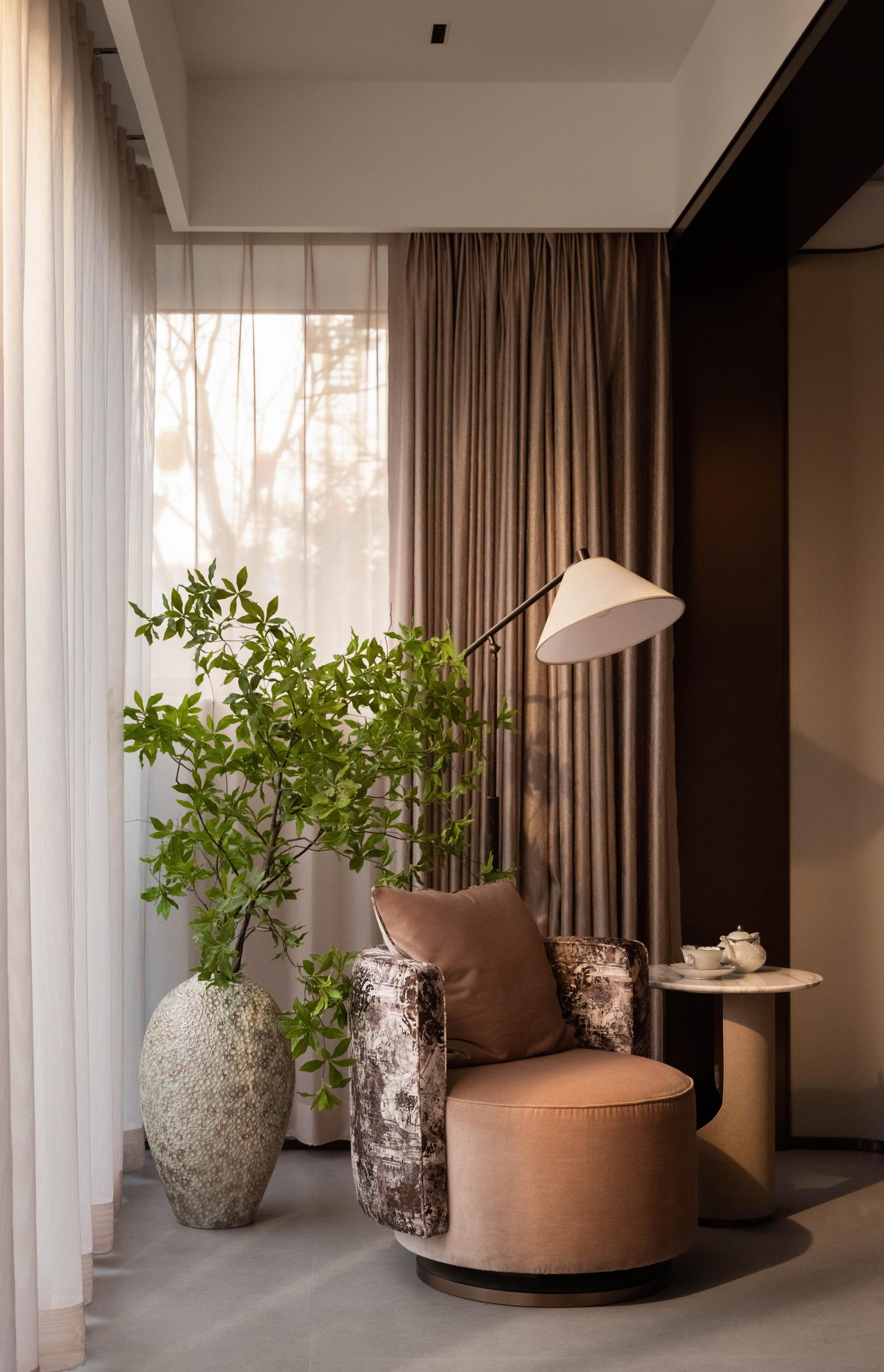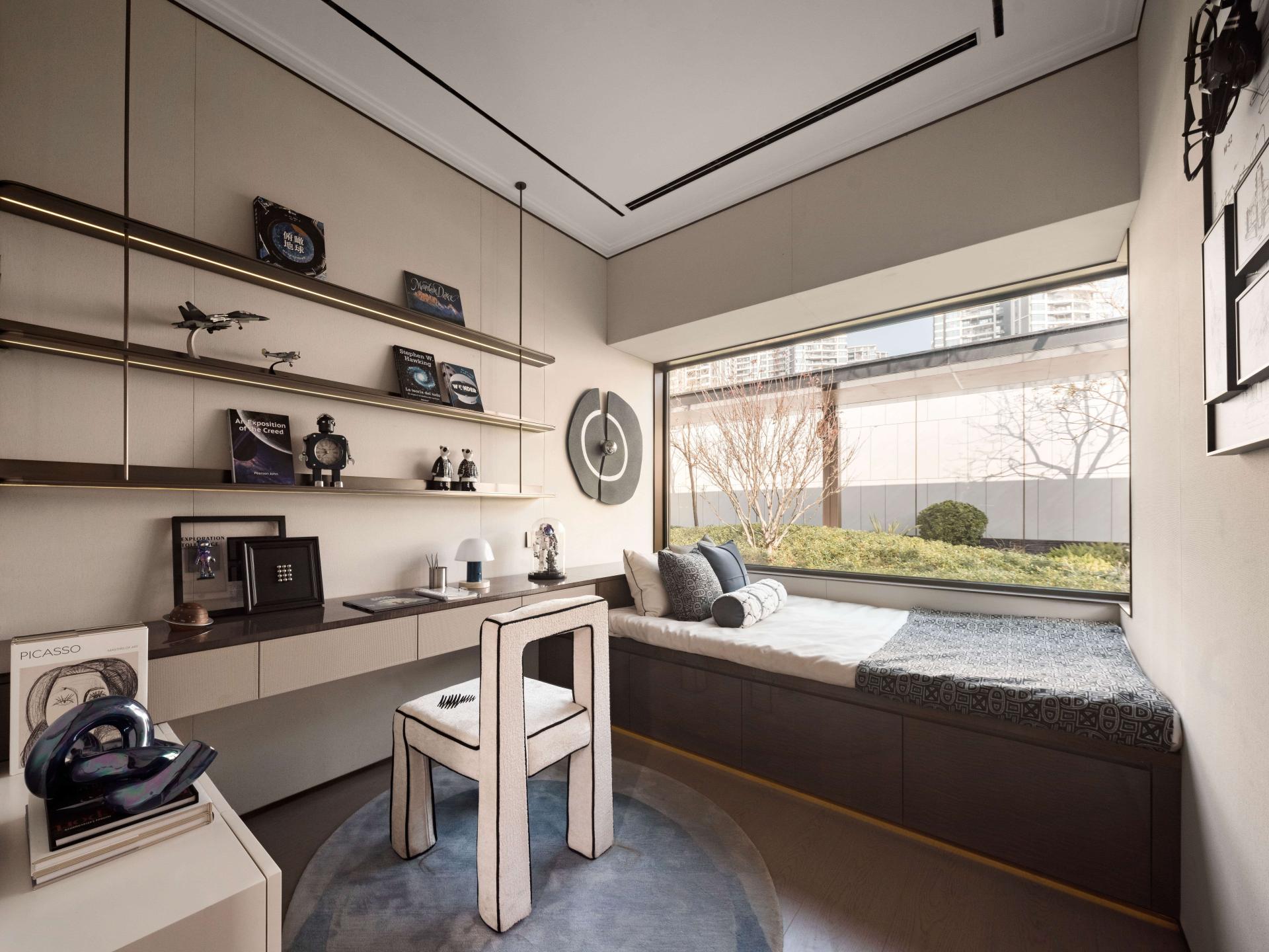 The study is designed as a composite functional area, serving both office and reading purposes. The display shelves showcase collections, conveying the taste of the residents. The leisure corner on the balcony, with a combination of green plants, a single chair, and a floor lamp, becomes a private and relaxing little world. The overall design incorporates quality details into simple lines, balances practicality and aesthetics, and interprets a sample of contemporary urban comfortable living.