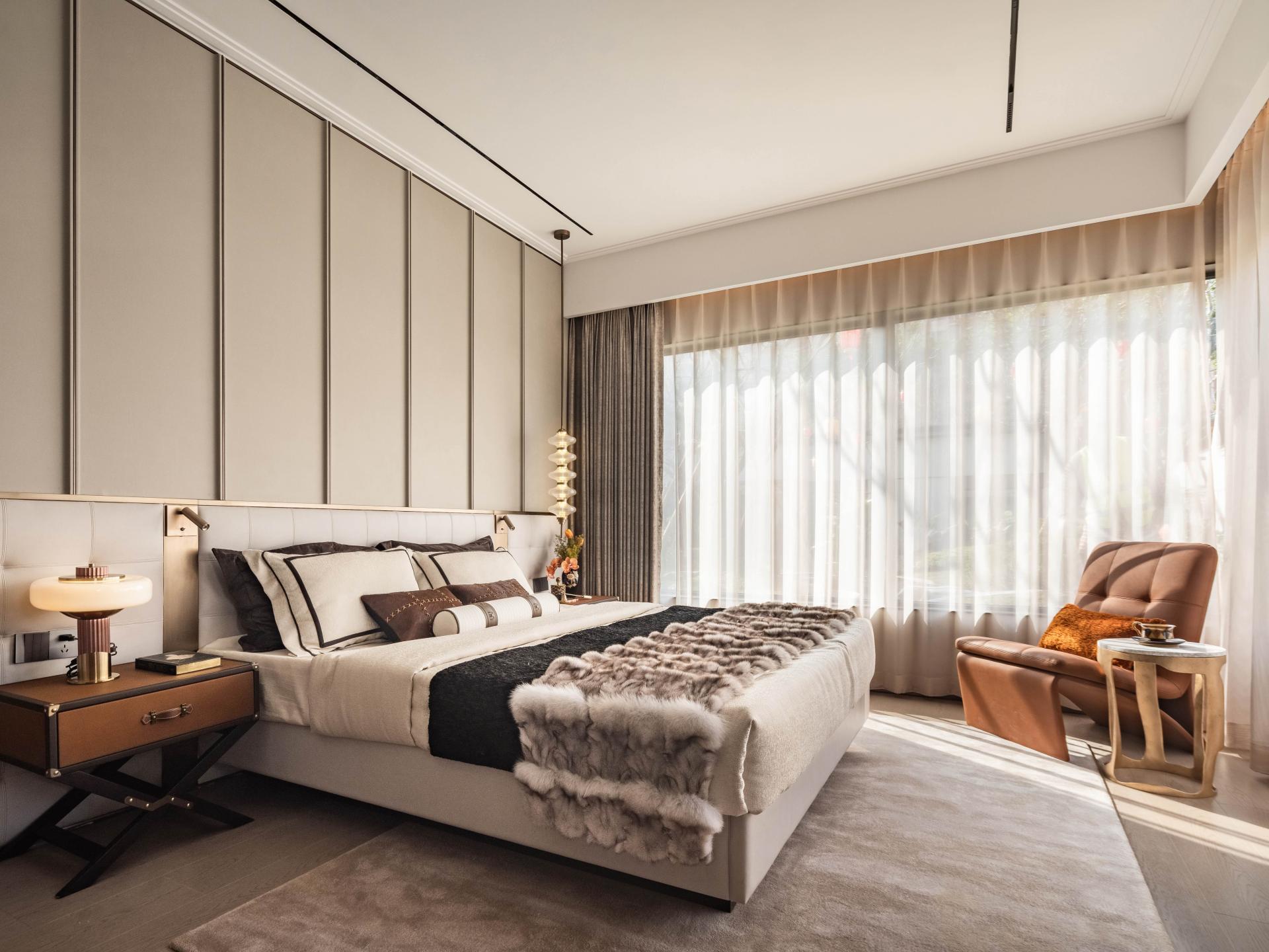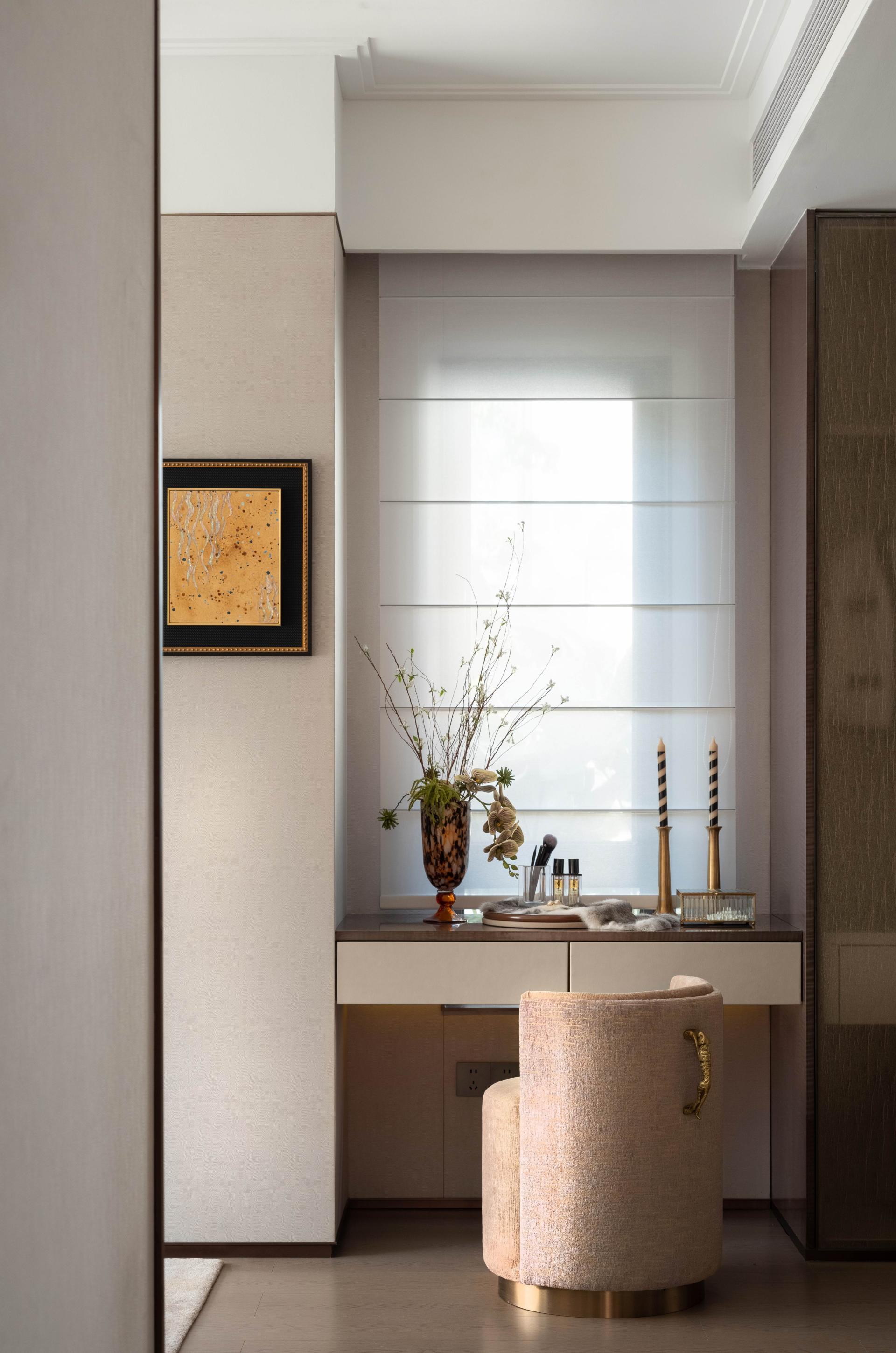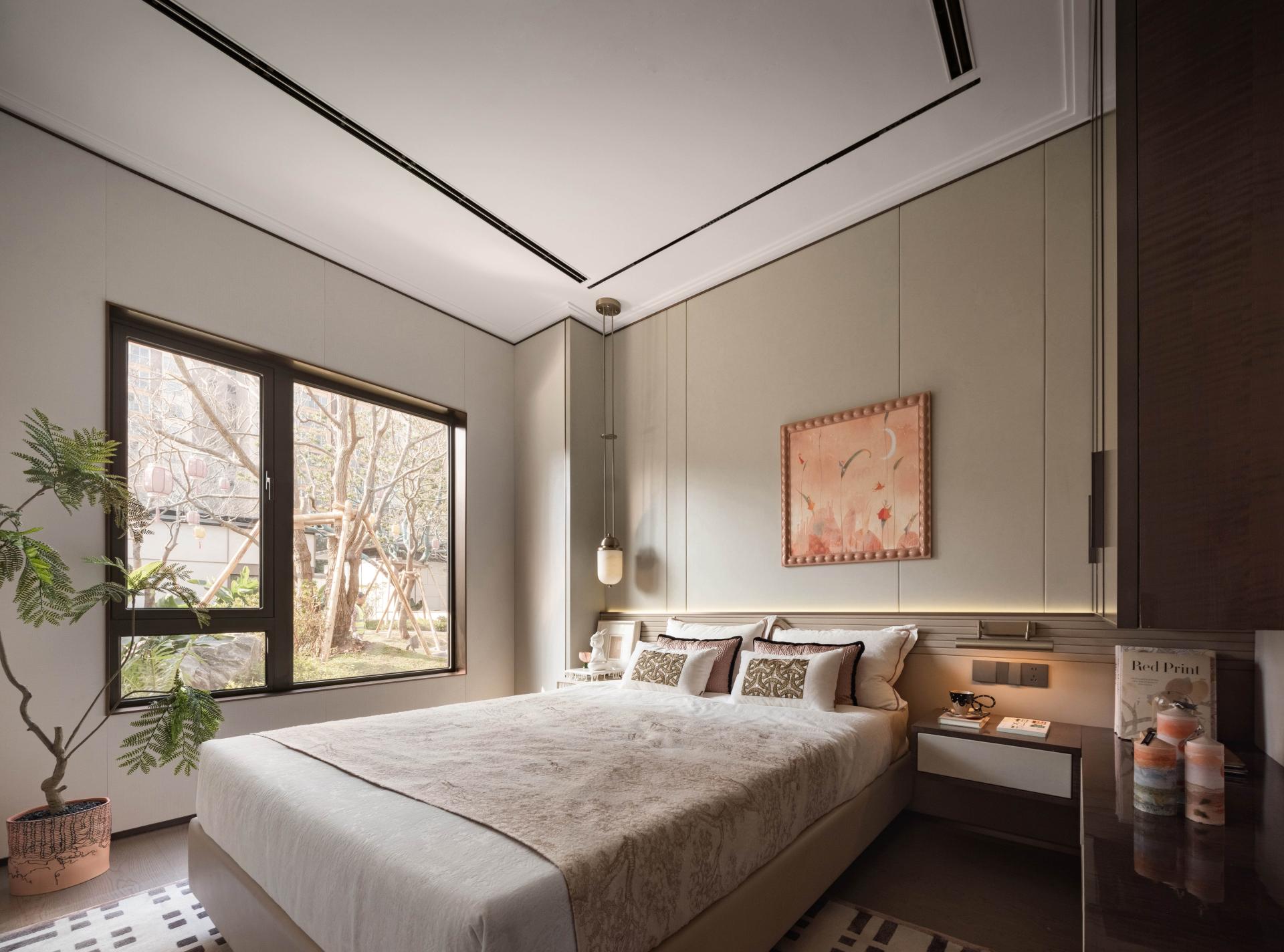The study is designed as a composite functional area, serving both office and reading purposes. The display shelves showcase collections, conveying the taste of the residents. The leisure corner on the balcony, with a combination of green plants, a single chair, and a floor lamp, becomes a private and relaxing little world. The overall design incorporates quality details into simple lines, balances practicality and aesthetics, and interprets a sample of contemporary urban comfortable living.
