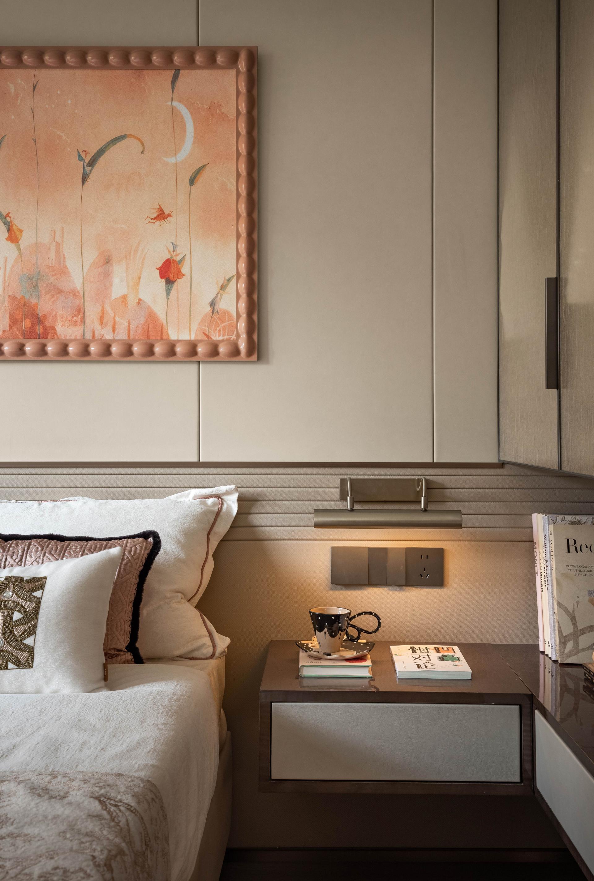 The open - plan living and dining room breaks the boundaries of space and enables smooth interaction. The sofa and coffee table in the living room are selected to balance comfort and design sense, and the fireplace and artistic chandelier add a touch of style; the integrated island and dining table in the dining room combine the social attribute with the dining function. The bedroom continues the overall tone. The leather headboard and exquisite bedding in the master bedroom create a quiet resting atmosphere; the secondary bedroom and children's room inject warmth and childlikeness through soft furnishings and decorative paintings.
