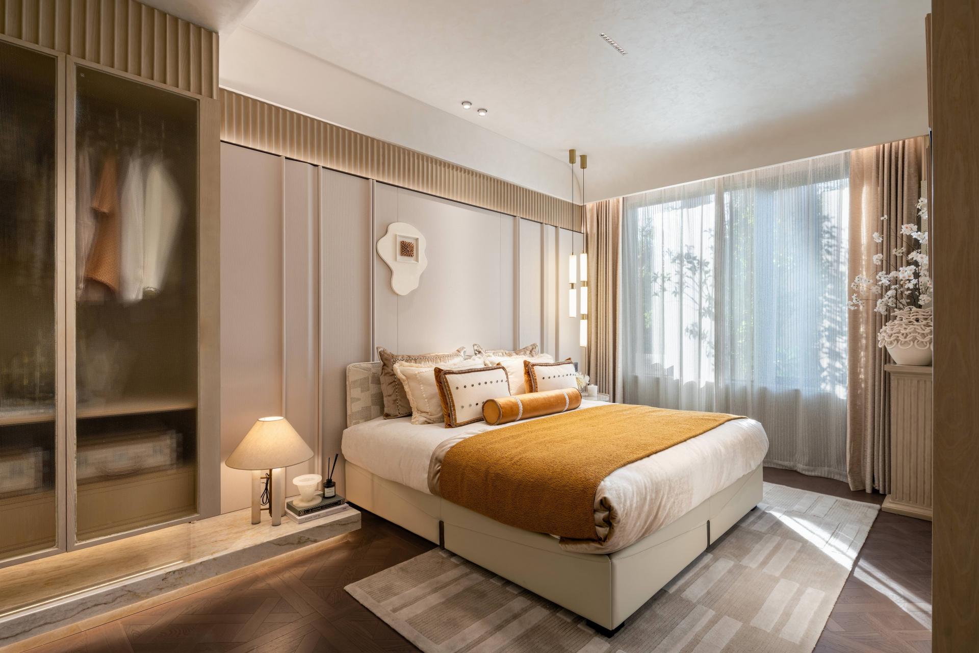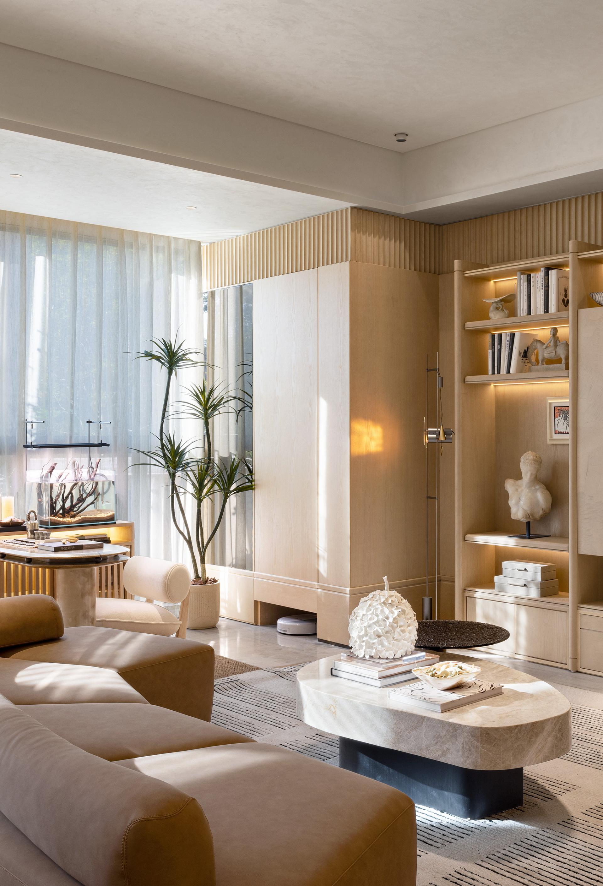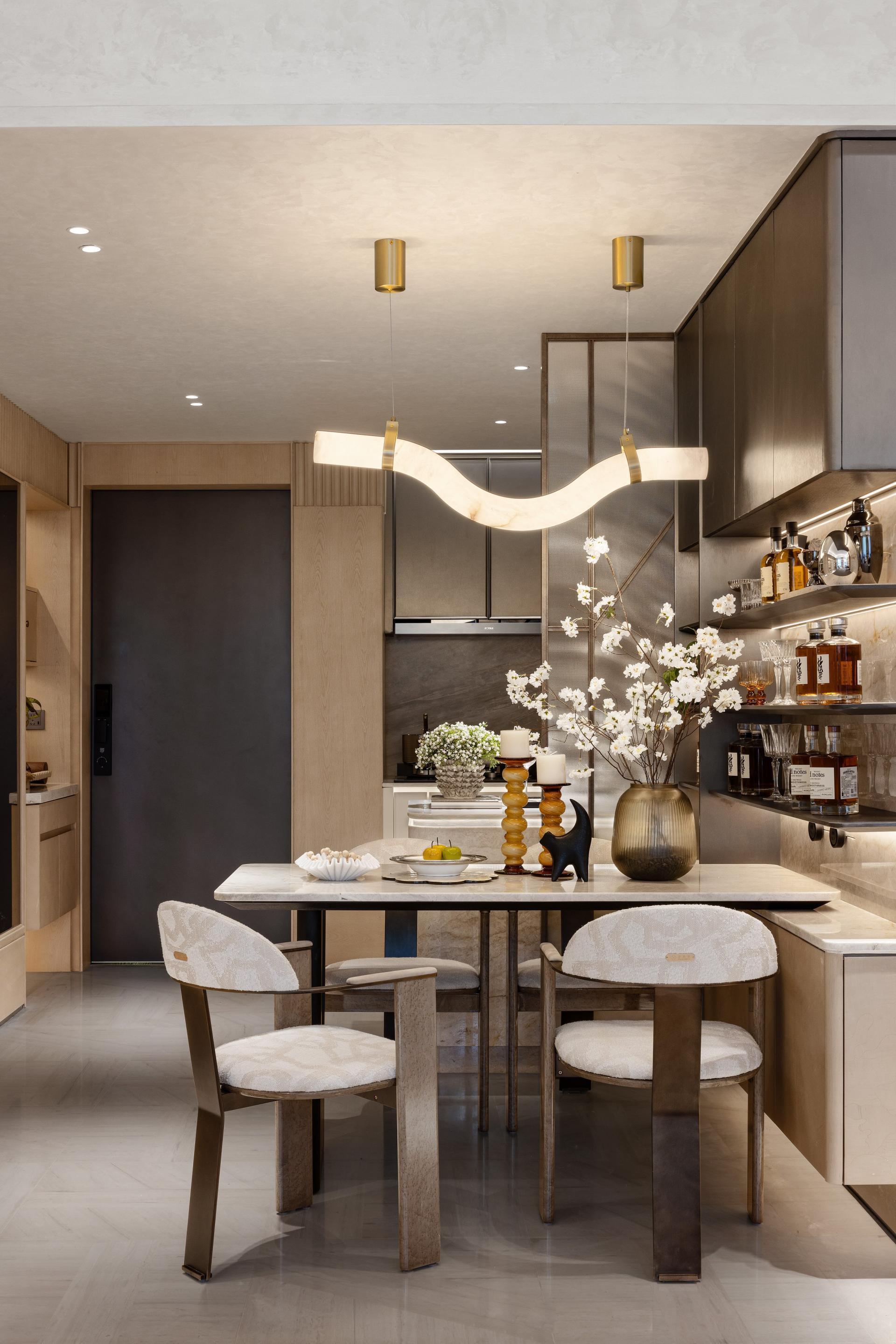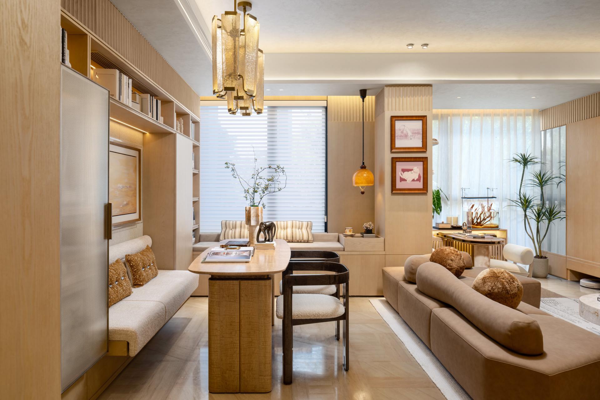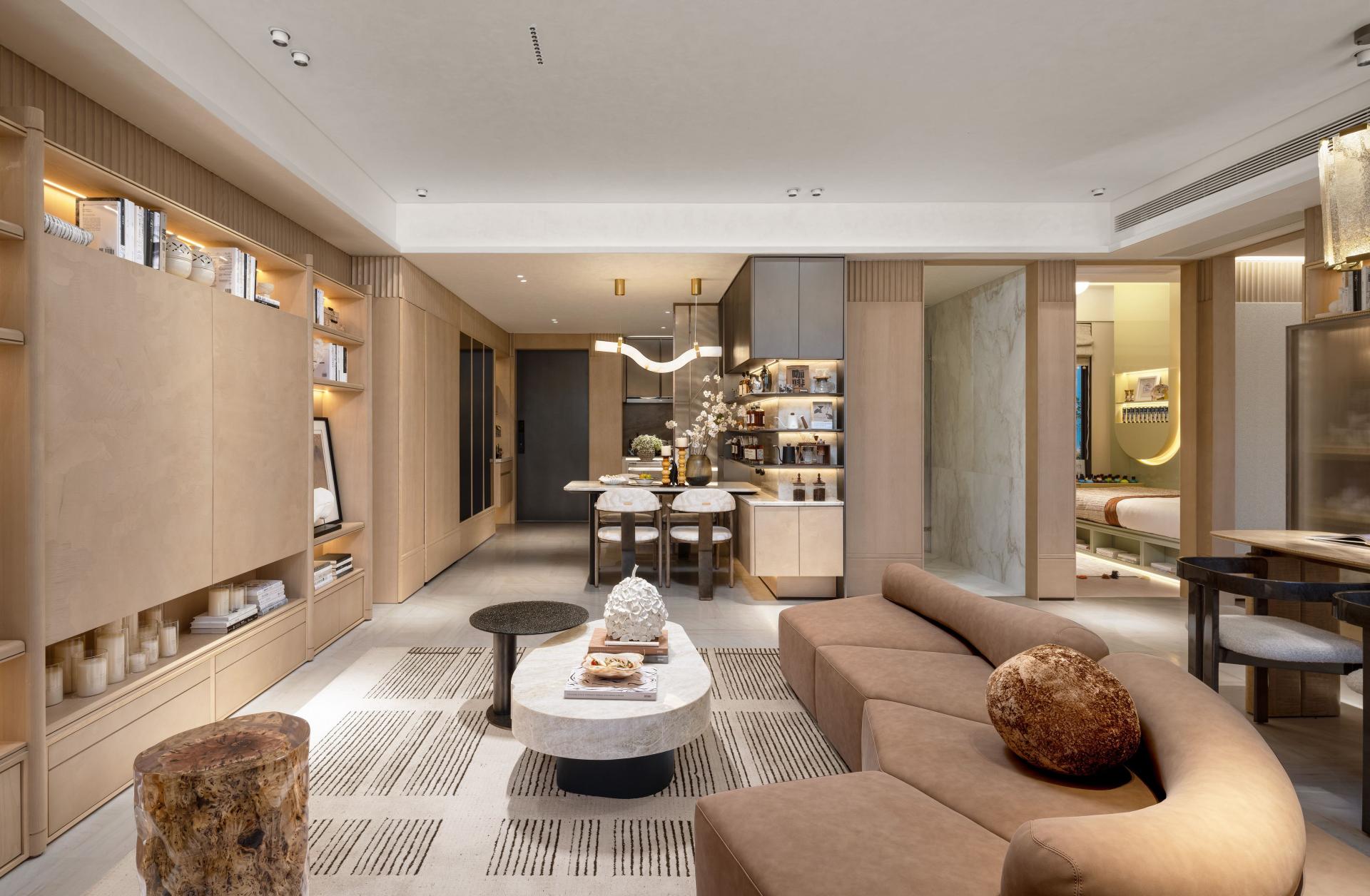 This model home blends light-toned oak, curved furnishings, and natural marble to craft a soothing yet sophisticated urban sanctuary. Gentle arcs in the furniture soften the space, while the interplay of wood grain and stone veins adds organic elegance. The palette—warm whites, soft beiges, and muted greys—creates a serene backdrop, enhanced by diffused lighting and minimalist detailing. Designed for discerning city dwellers, it balances refined aesthetics with effortless relaxation, offering a timeless escape from urban bustle.